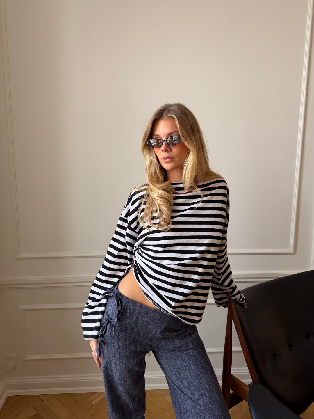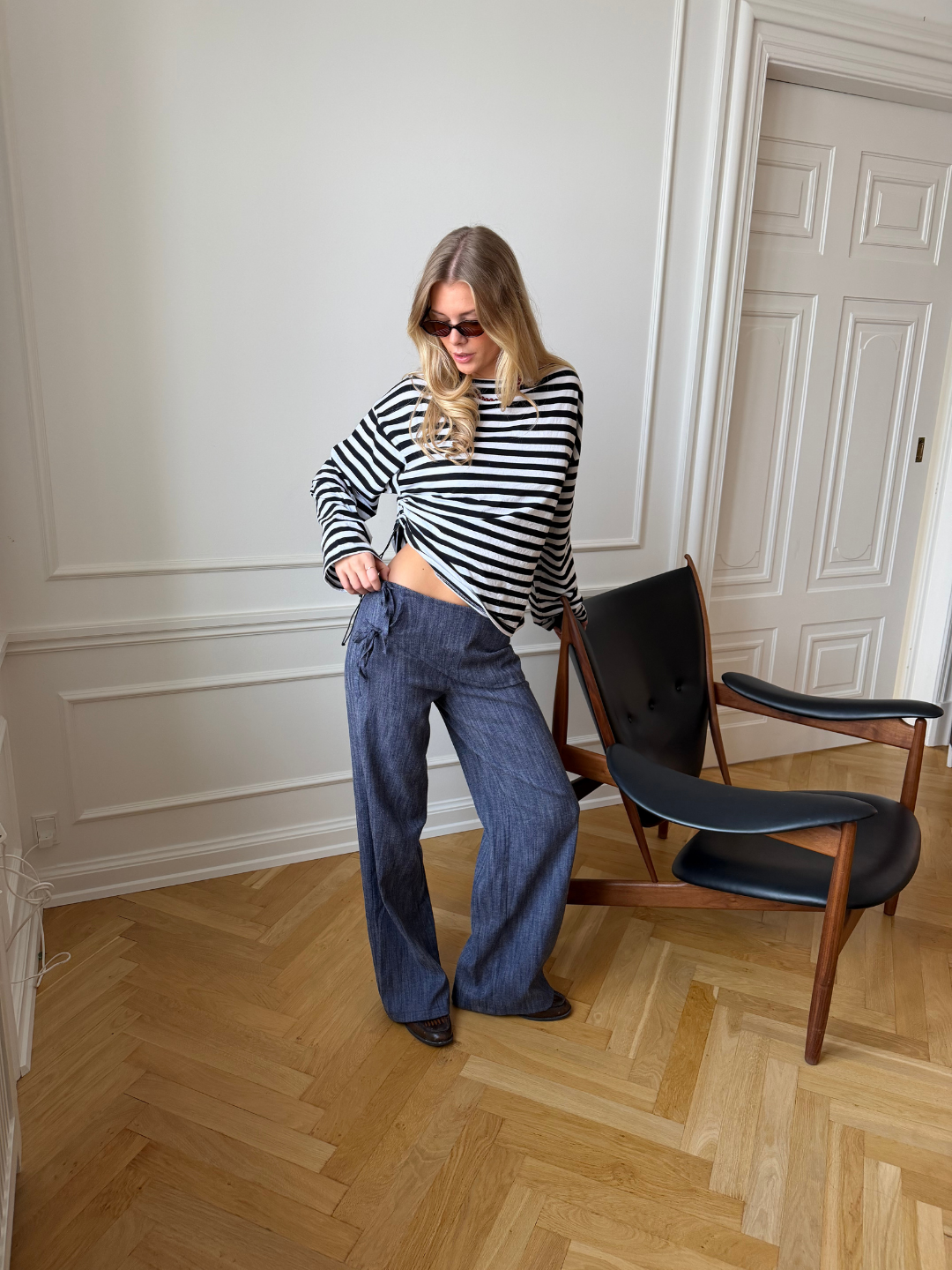 Our Liana tie-dye jeans in medium blue are a modern take on the classic denim trouser. They have a loose, baggy fit with wide legs for a relaxed and stylish look. They have a slanted piece of fabric at the front with a tie detail at the side, which adds a unique and eye-catching twist. They are made in a structured, bluish denim material with pockets at the back for a flattering cut. A versatile pair of trousers that can be styled both simply for everyday wear or more statement-making for a night out.