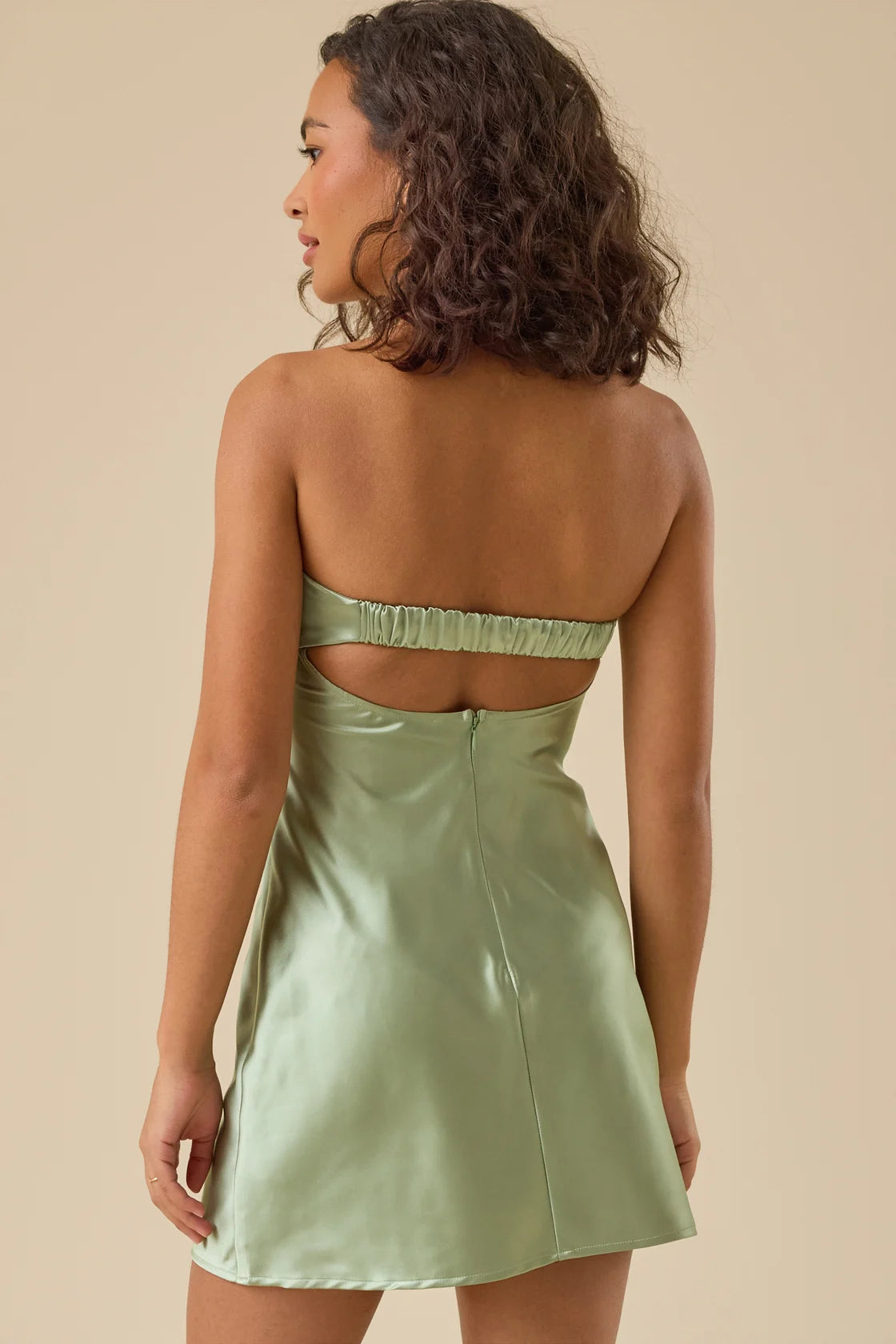 Minimal yet refined. This soft sage strapless mini dress features a smooth satin finish and an A-line silhouette that flatters the waist while keeping the look light and elegant.