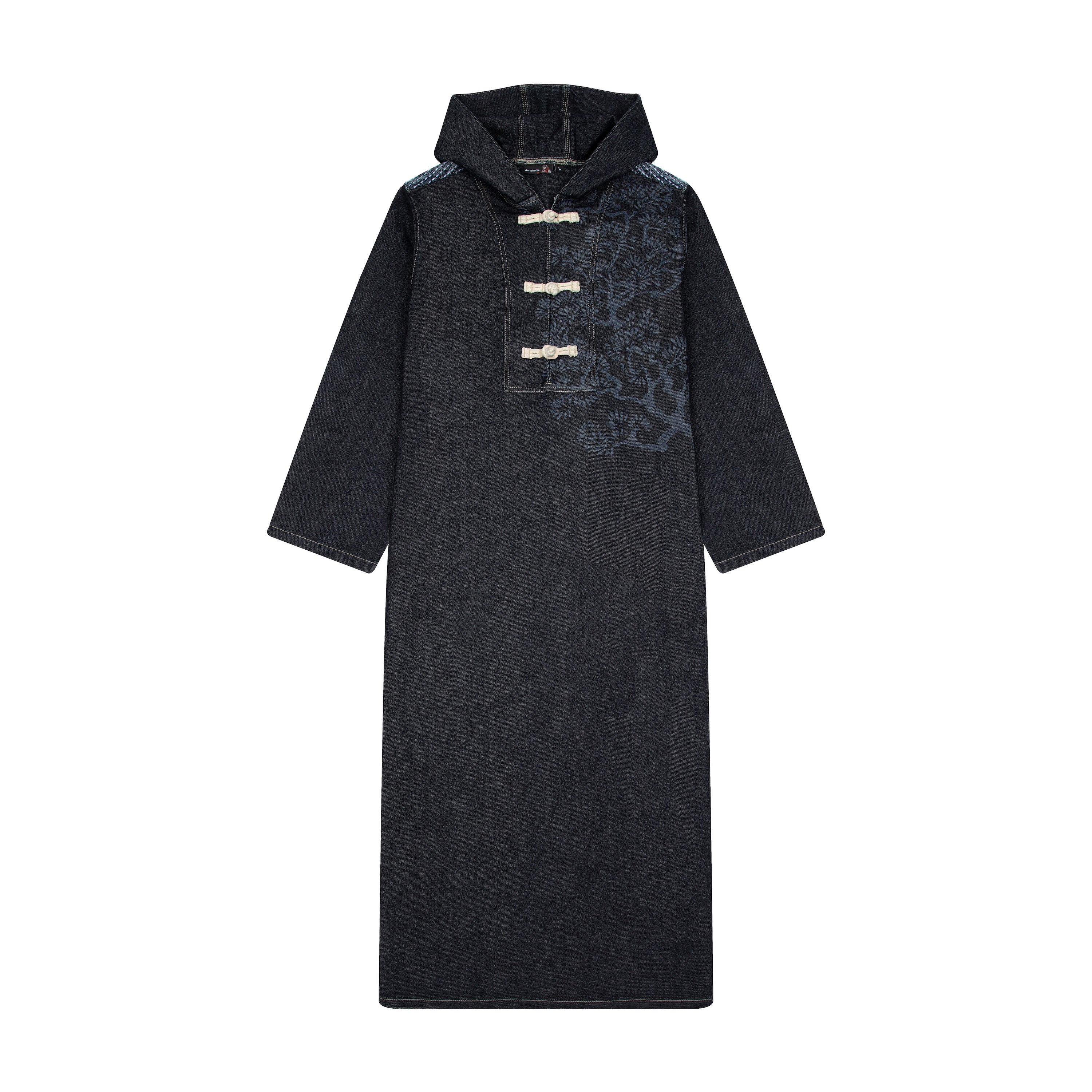 11oz raw denim / 100% cotton / laser print on front / boro style patchwork on back robe / closure cord / wash inside out / fits true to size / all profits will be donated