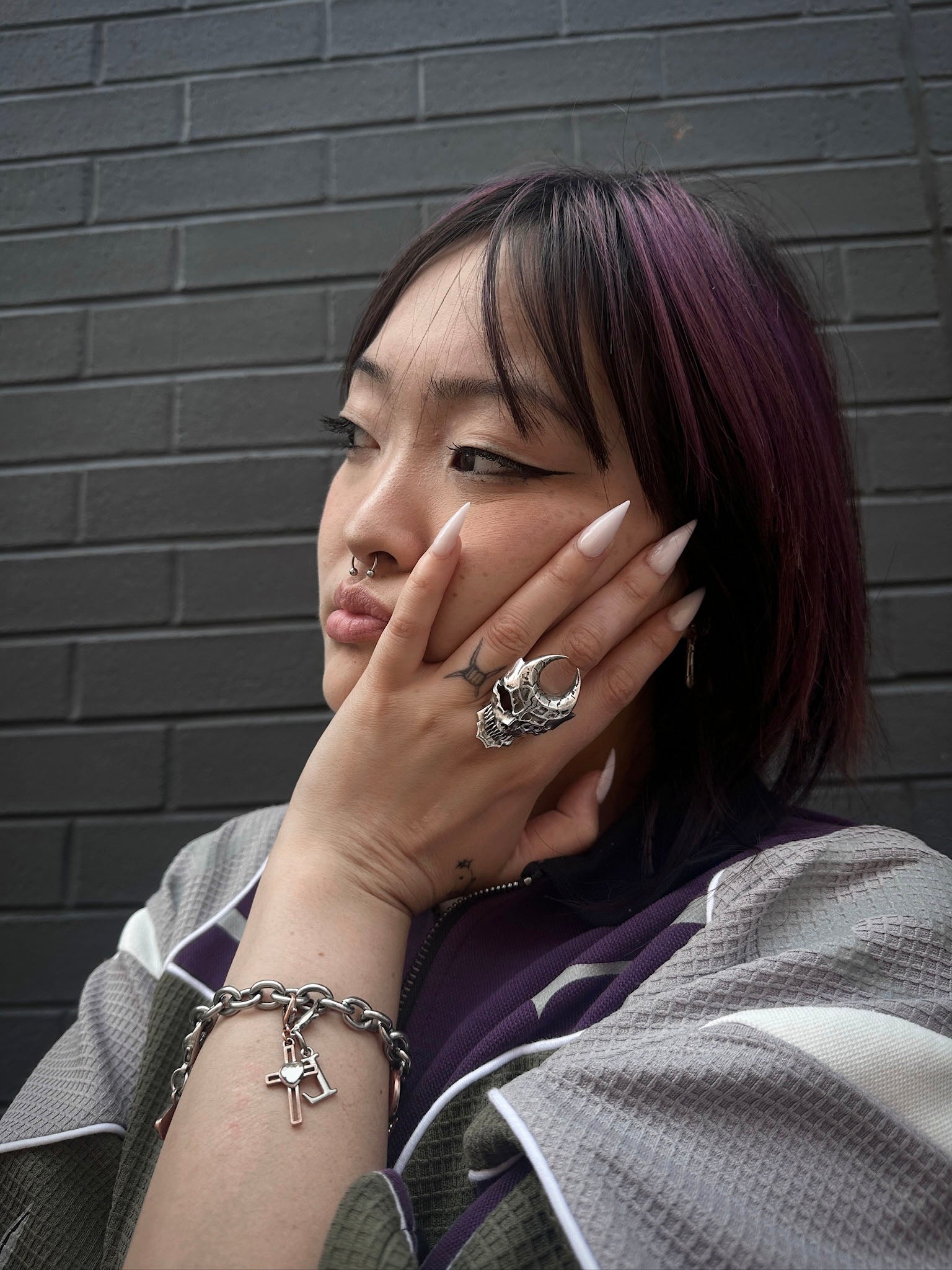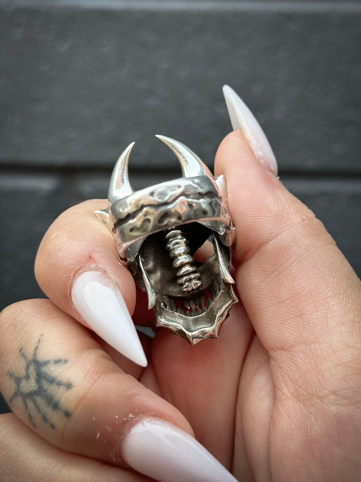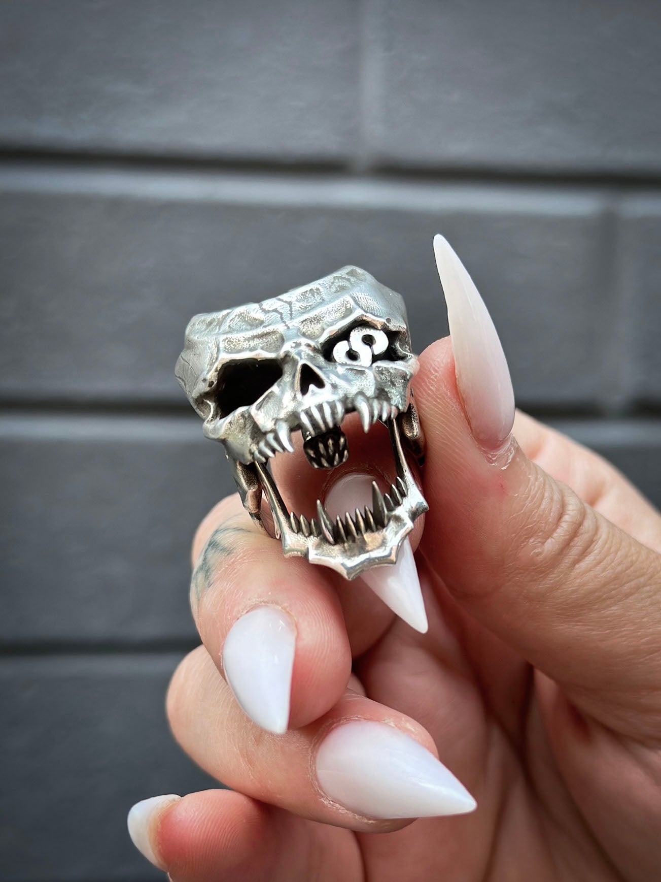 This ring is cast in stainless steel with a movable lower jaw design and a hidden worm. Made with a smooth, dark metal brushed finish, the ring is durable and functional.