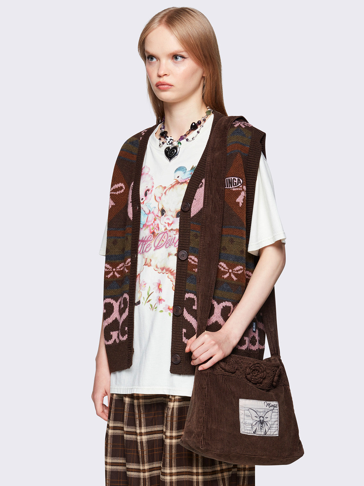 • Brown jacquard knit sweater vest
