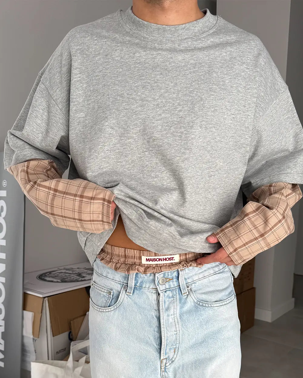 Features an inner shirt-fabric layer with brown checks visible on the sleeves. Finished with a small MaisonHost® digital print on the lower right front.