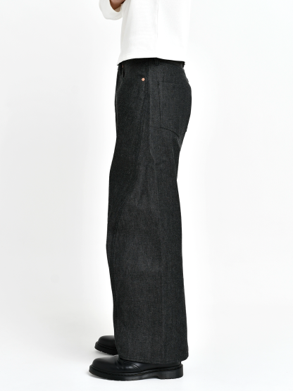 From the front, the jeans present a bold, wide silhouette with strong presence. From the side, they appear clean and streamlined��an expressive, sculptural form that cannot be achieved with flat patternmaking alone.