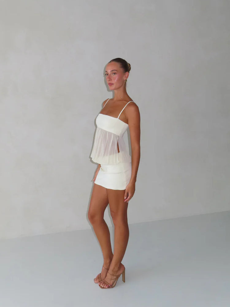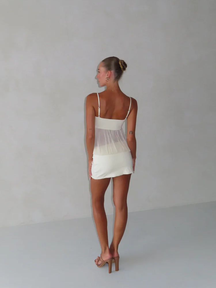 A sleek bodycon mini dress with ruched detailing and sheer accents at the waist, designed to contour and flatter the figure.