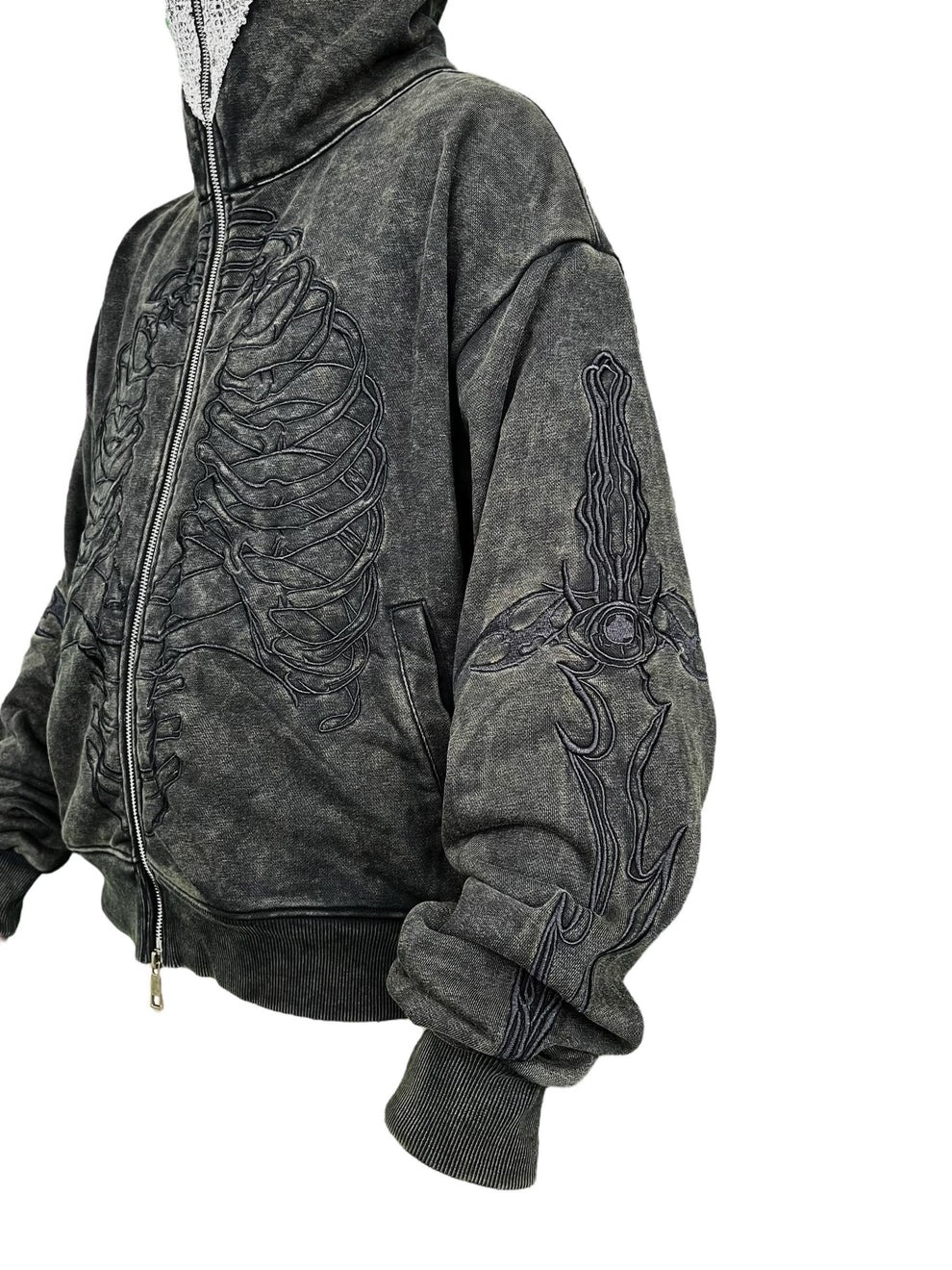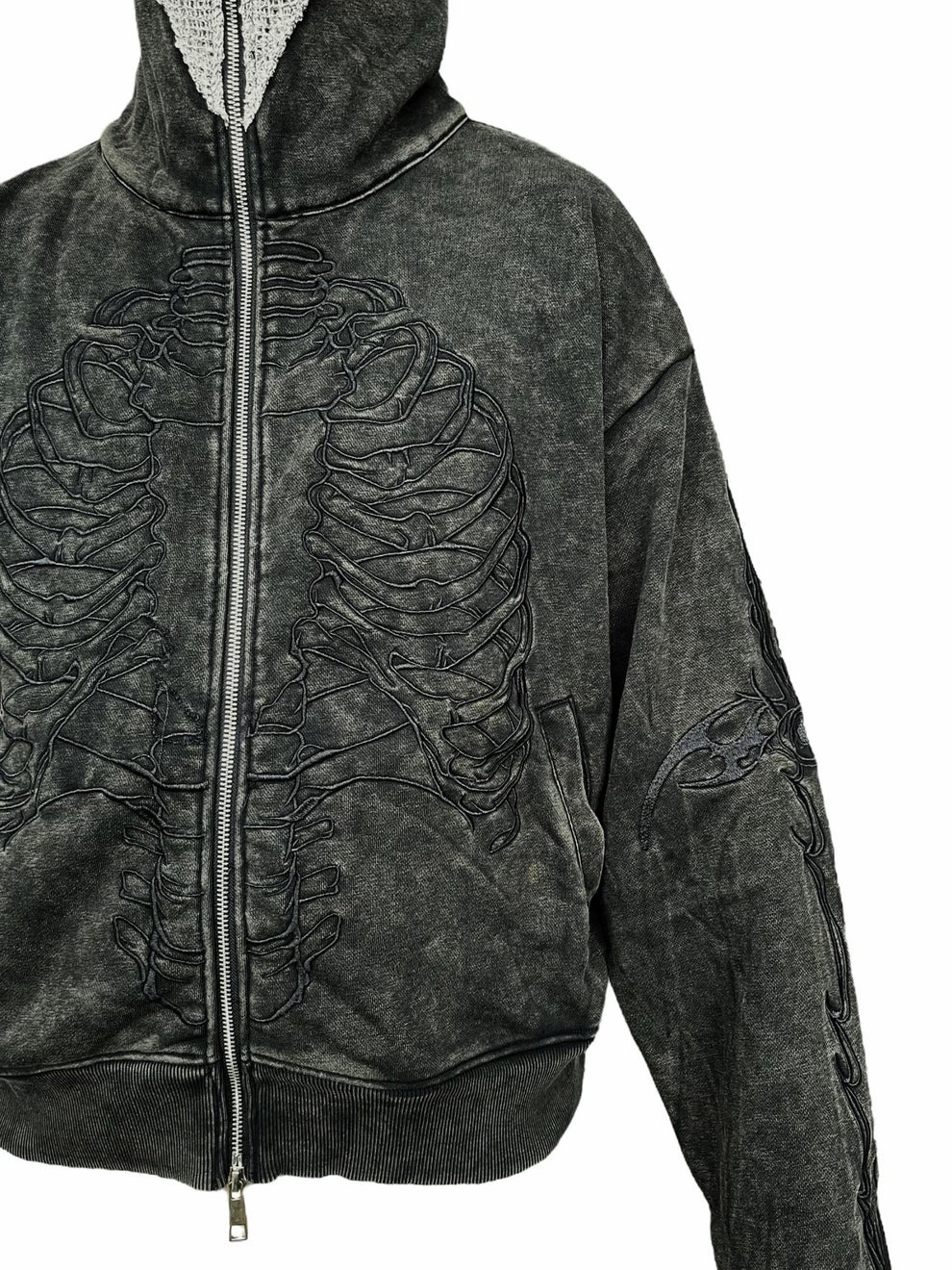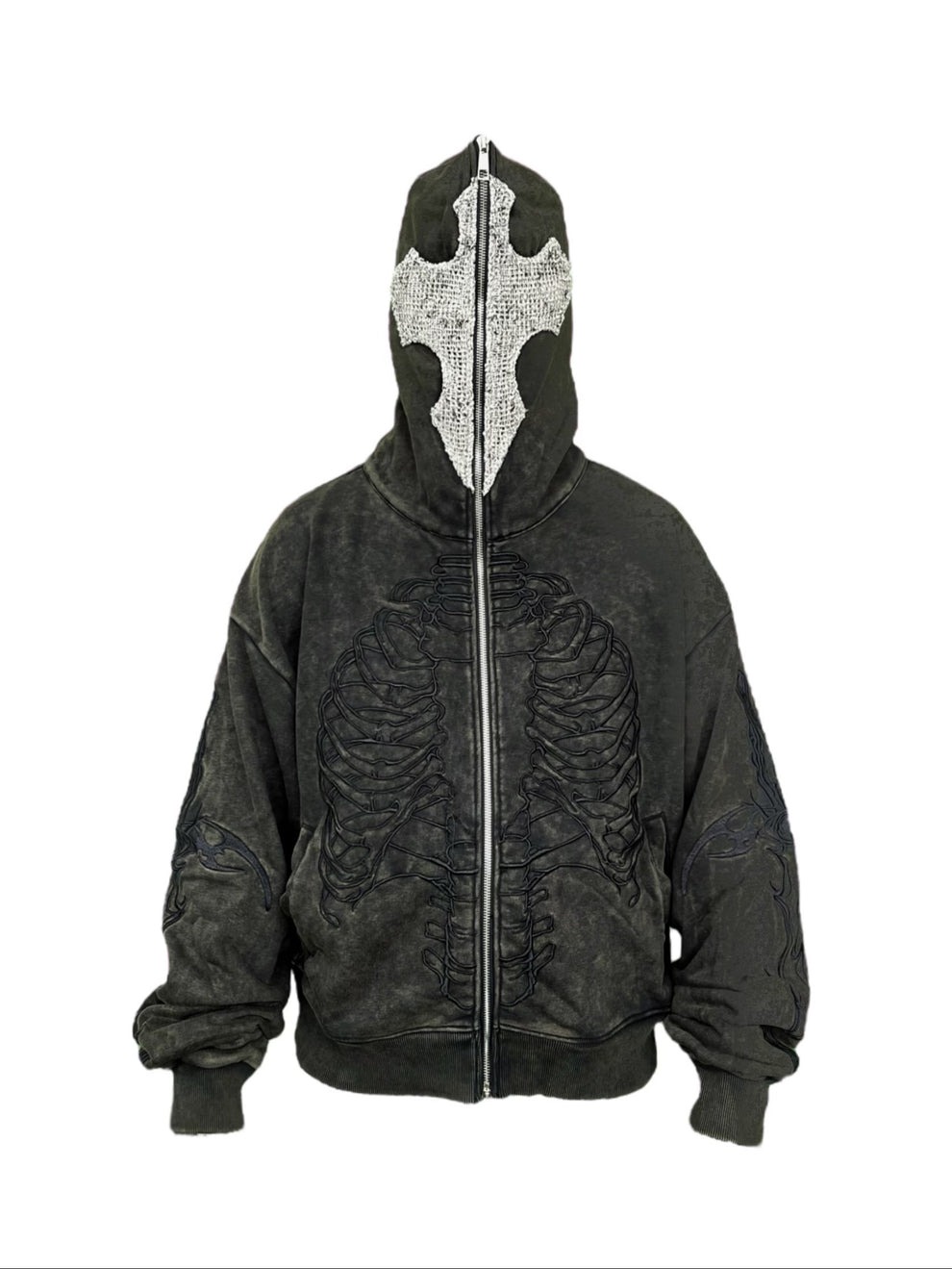 • Full-zip hoodie with an inner crusader cross mask lining. Embroidered skeleton lines run across the body and extend into the hood. Naturally moss-washed for a worn, ancient feel.