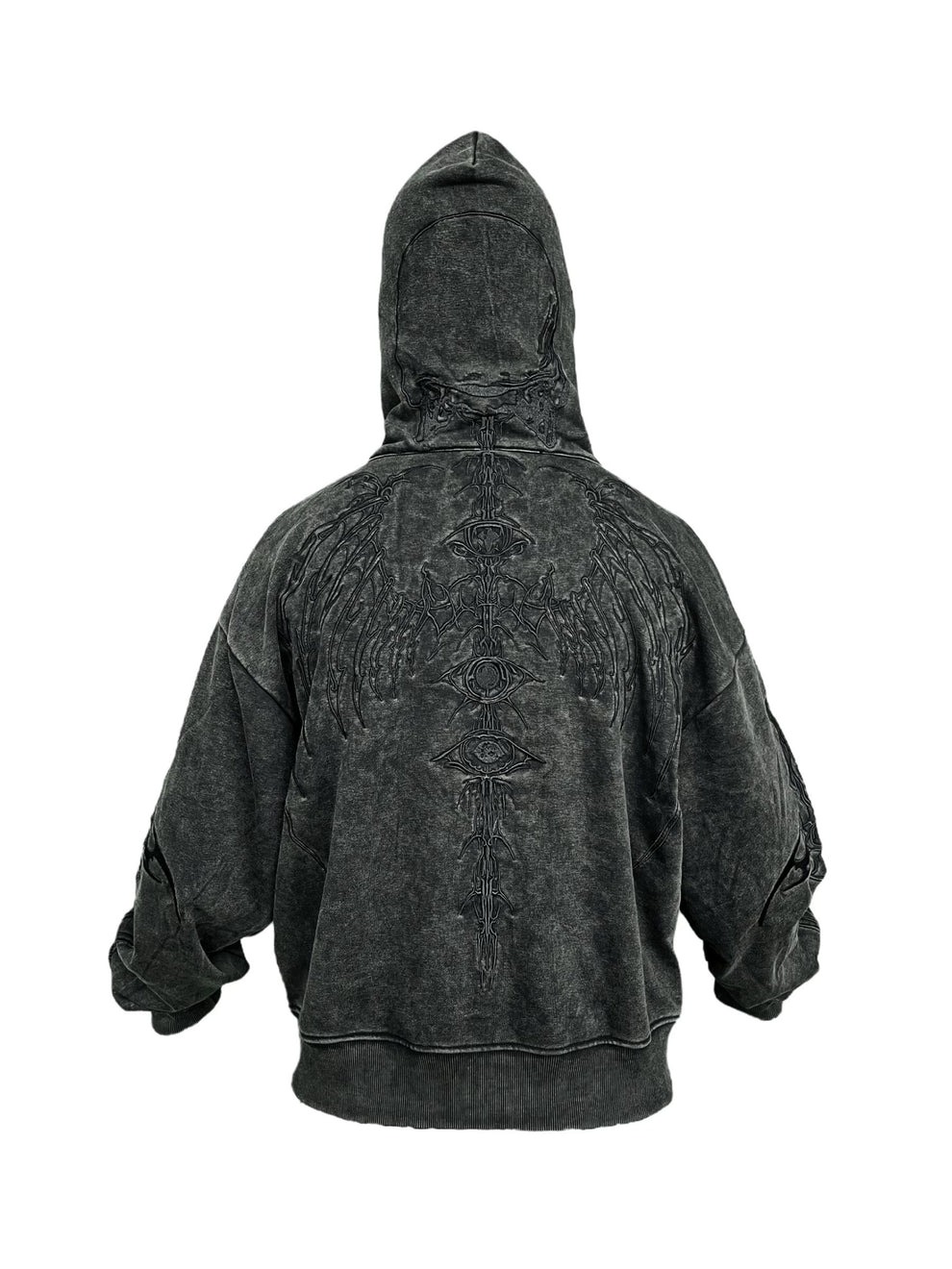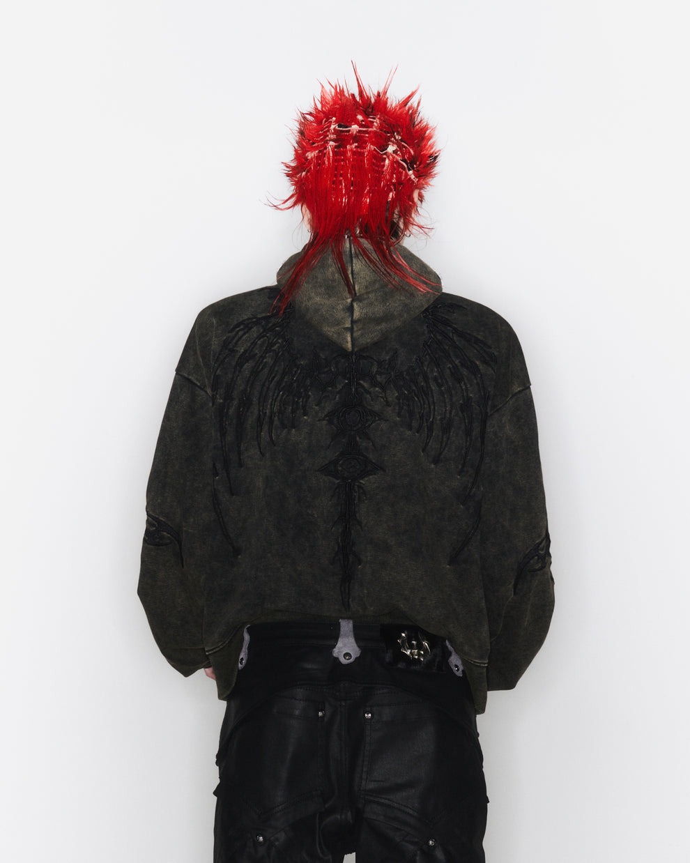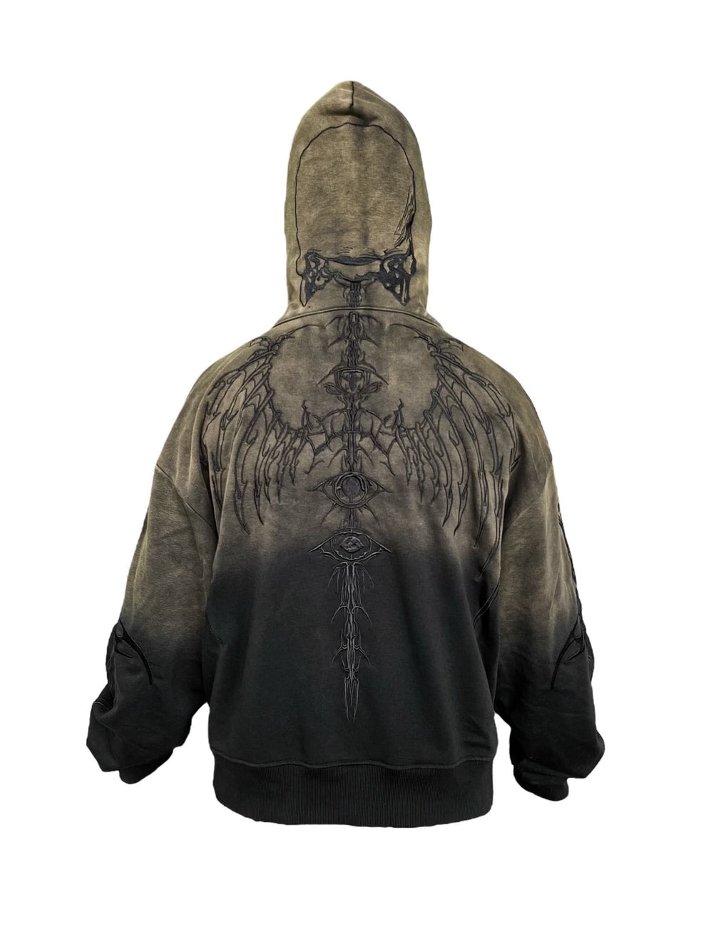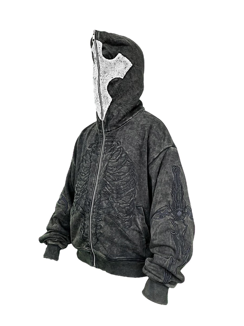 • Full-zip hoodie with an inner crusader cross mask lining. Embroidered skeleton lines run across the body and extend into the hood. Naturally moss-washed for a worn, ancient feel.