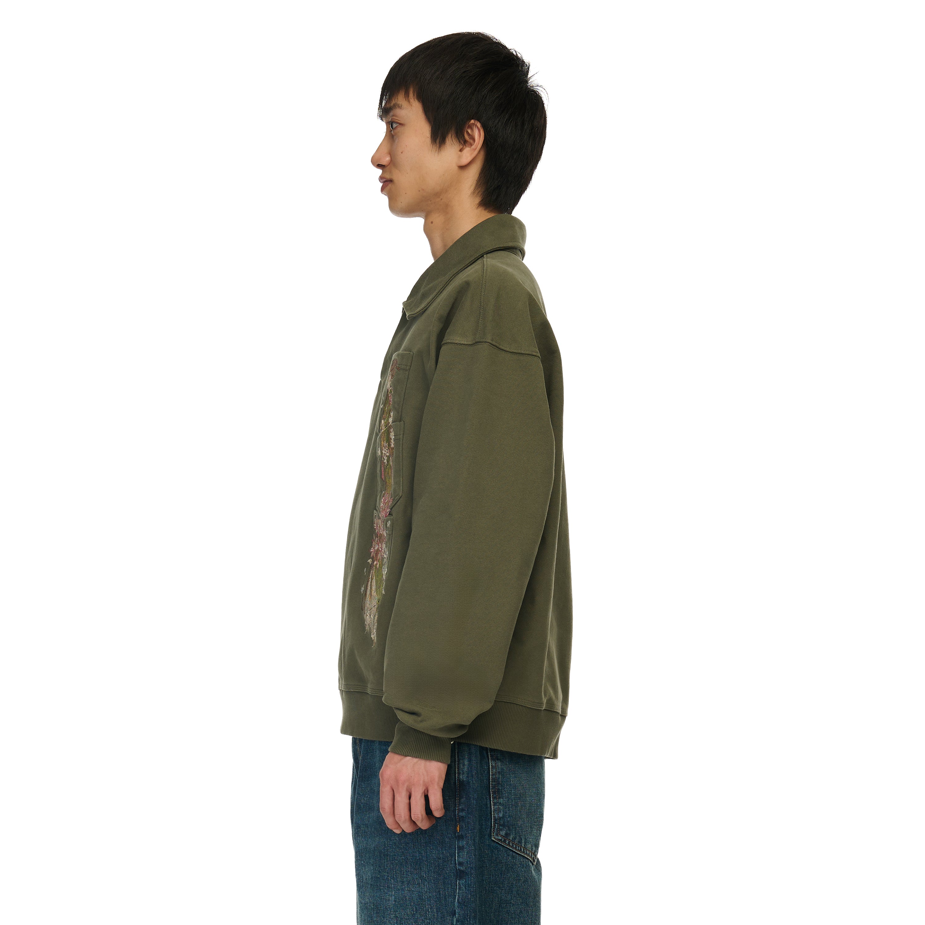 480gsm / 100% preshrunk cotton / embroidered pocket details on front / asymmetric collar with buttons inside / fits true to size