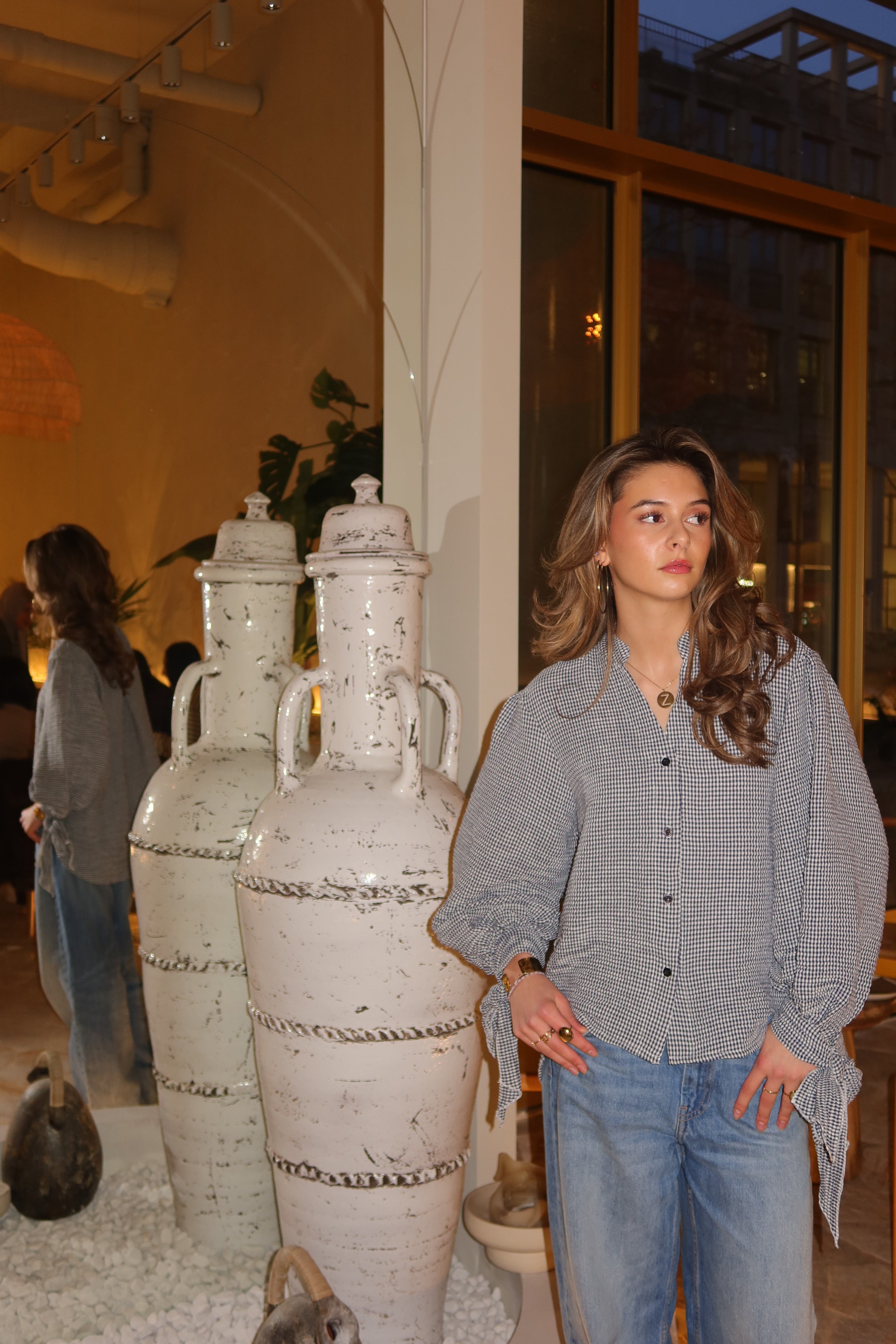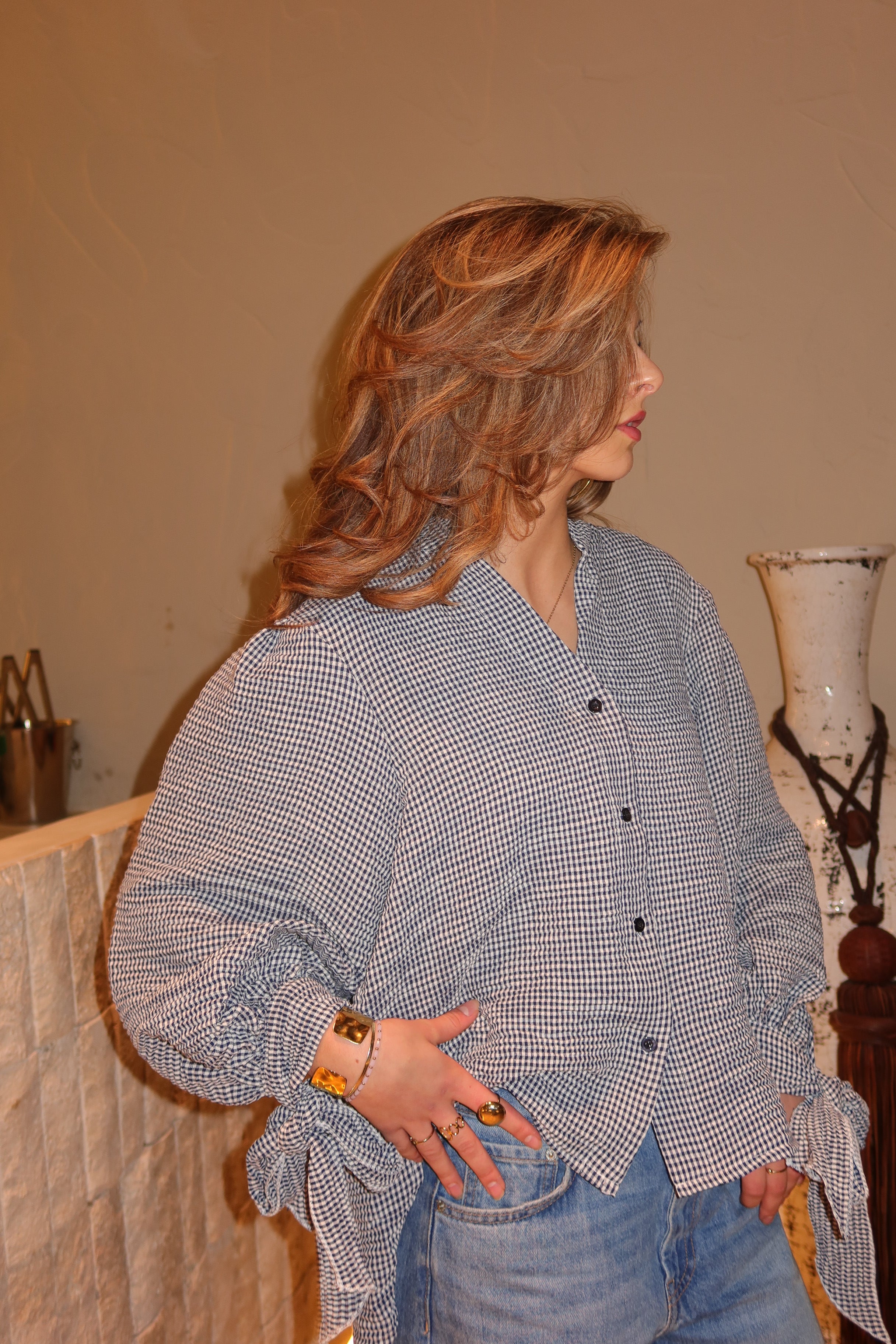 A classic gingham blouse reimagined with a modern, effortless feel. Designed with a relaxed fit, this black-and-white checked blouse features a soft stand collar, a subtle V-neckline with button-down front, and gently textured fabric for added depth. The long sleeves are finished with adjustable tie cuffs, adding a feminine and playful detail. Lightweight and easy to wear, this versatile piece pairs seamlessly with denim for casual days or tailored trousers for a more polished look.