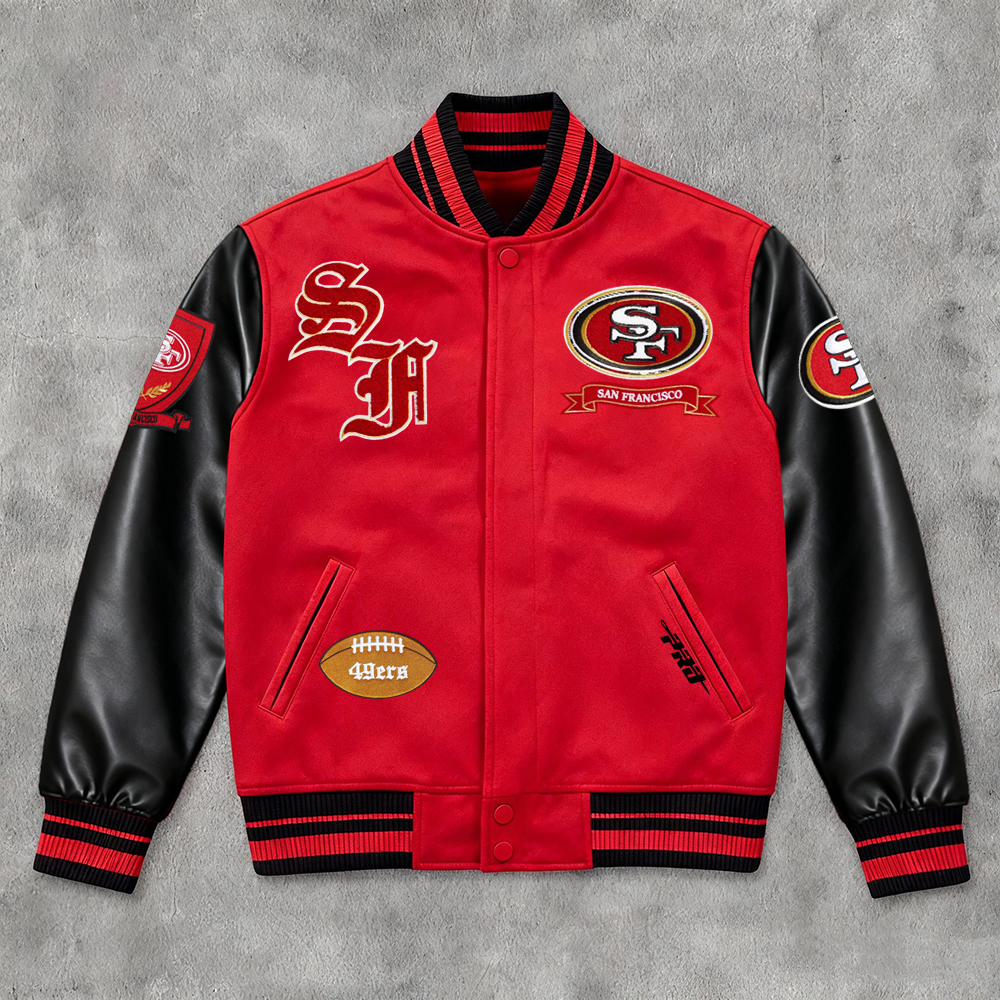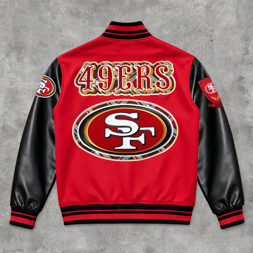 Stylish 49ers Print Leather Patchwork Long Sleeve Baseball Jacket