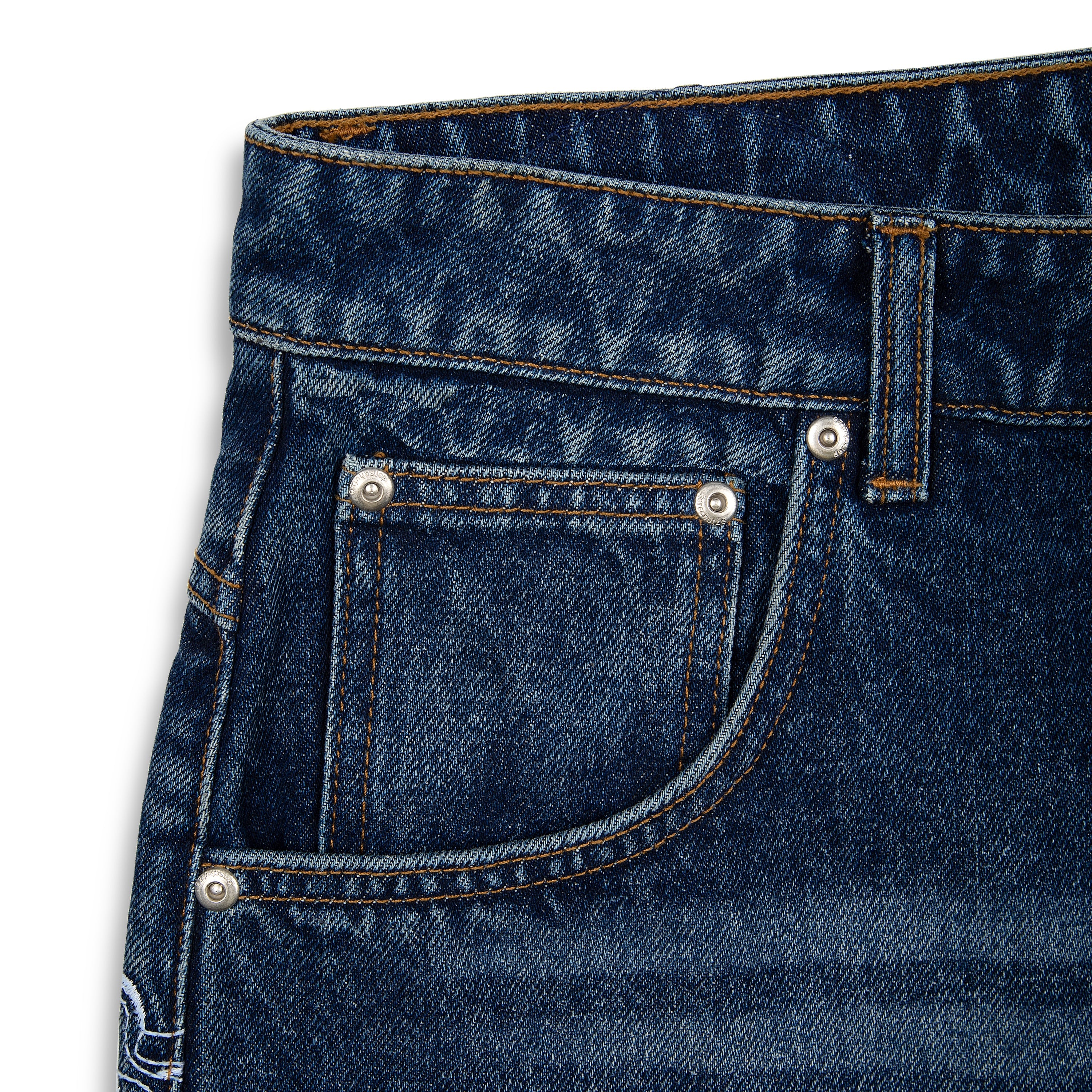 14,5 oz washed denim / 100% cotton / embroidery on back pocket / embroidered leather patch with deboss print / baggy fit / fits true to size