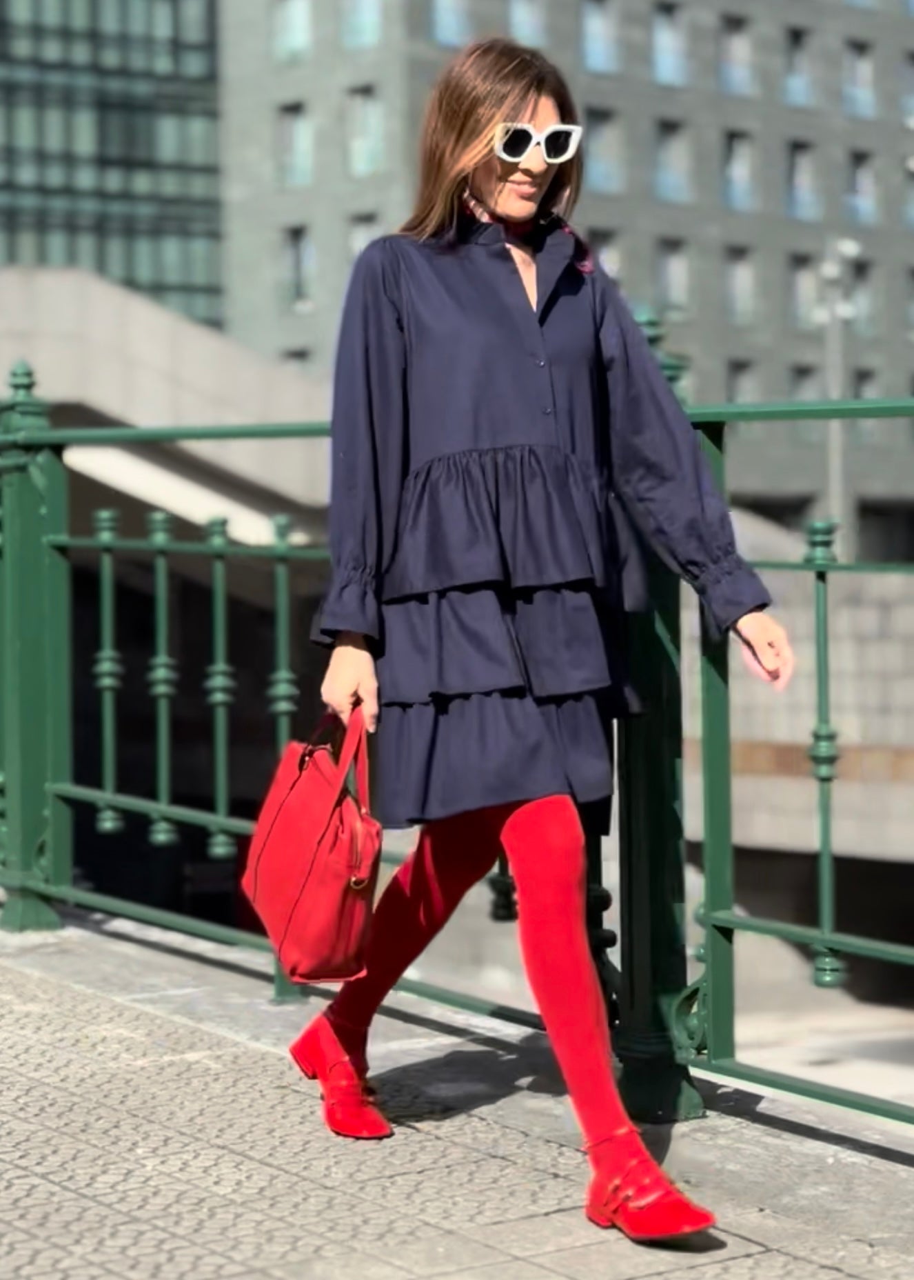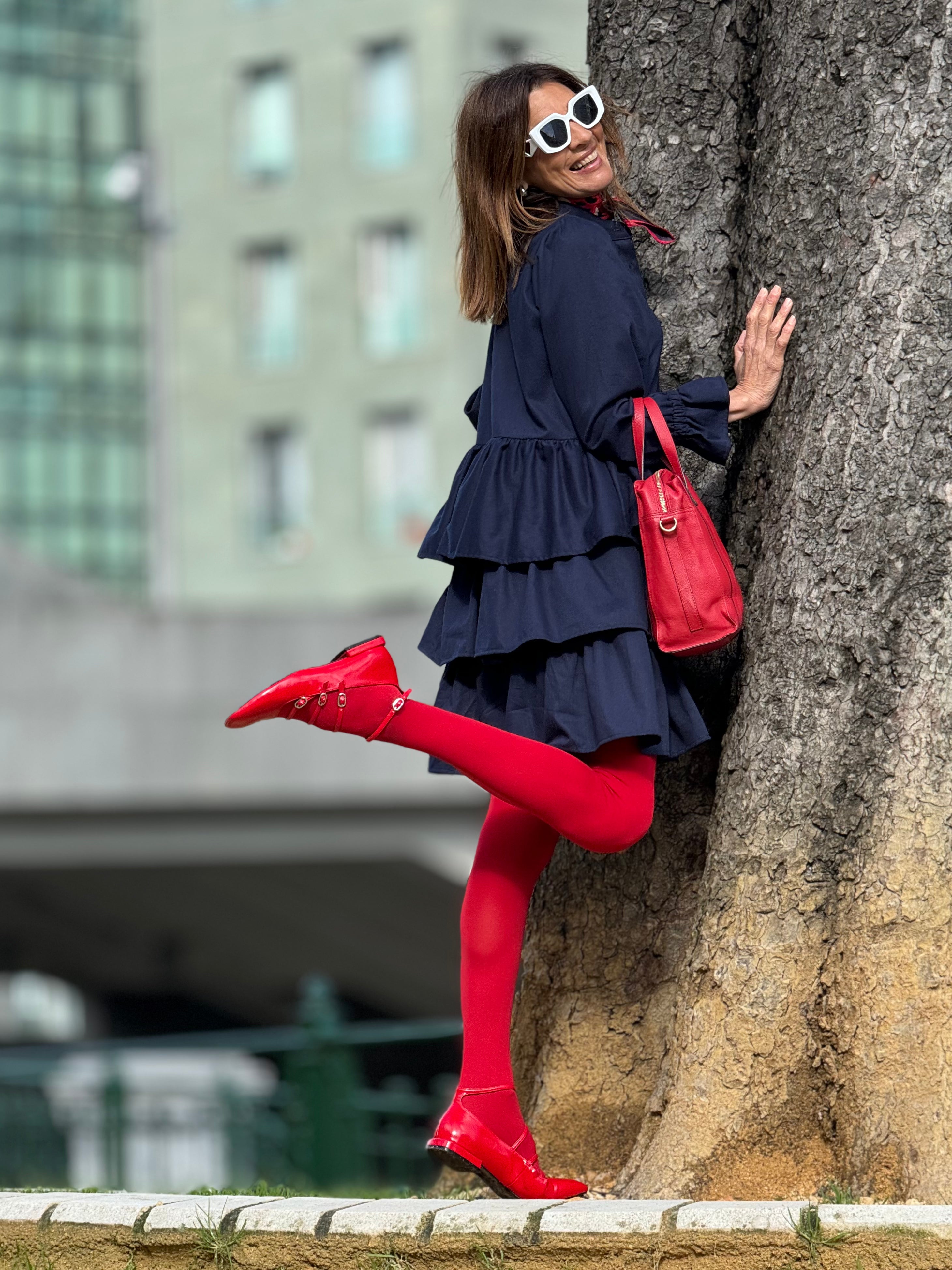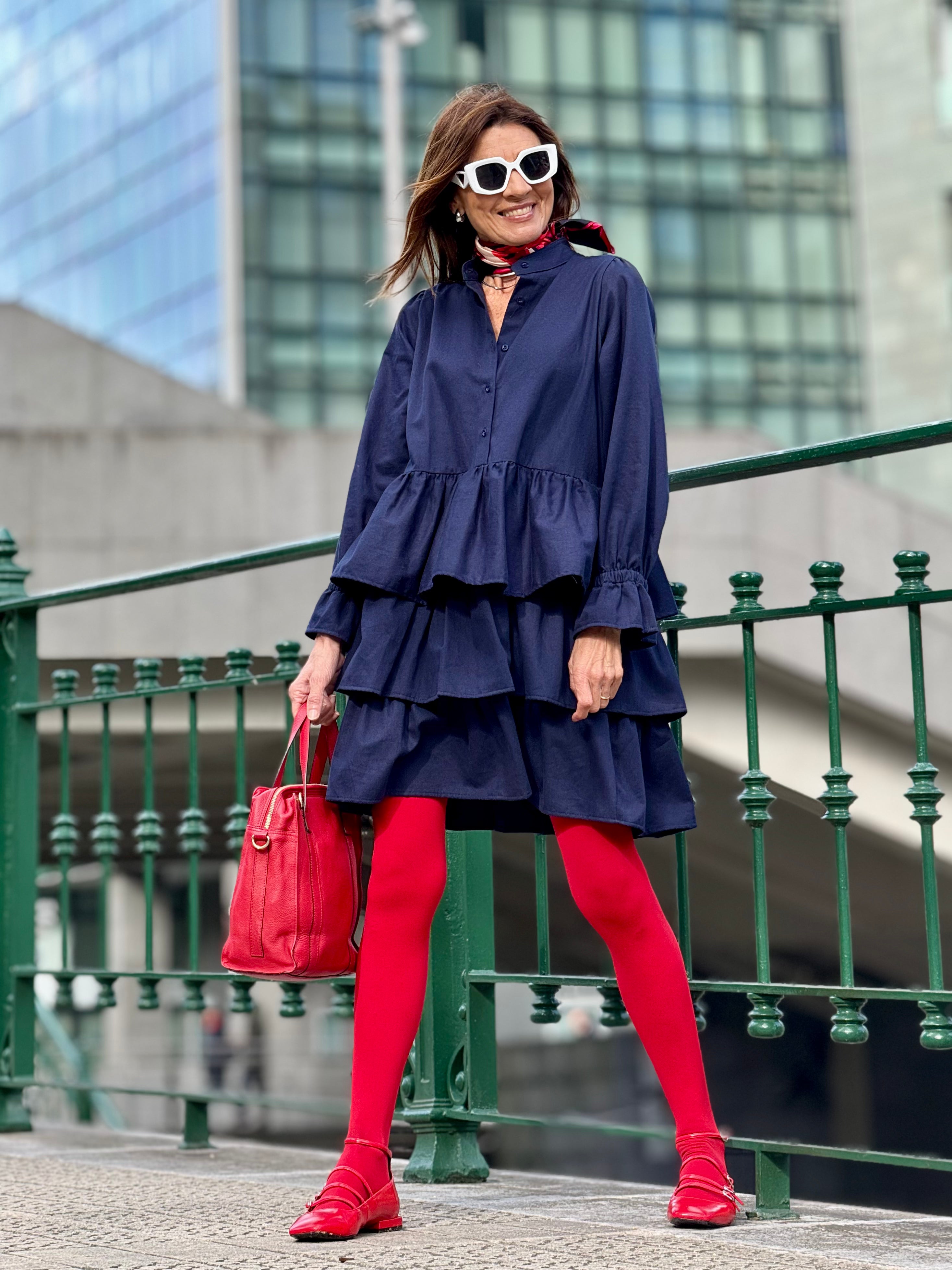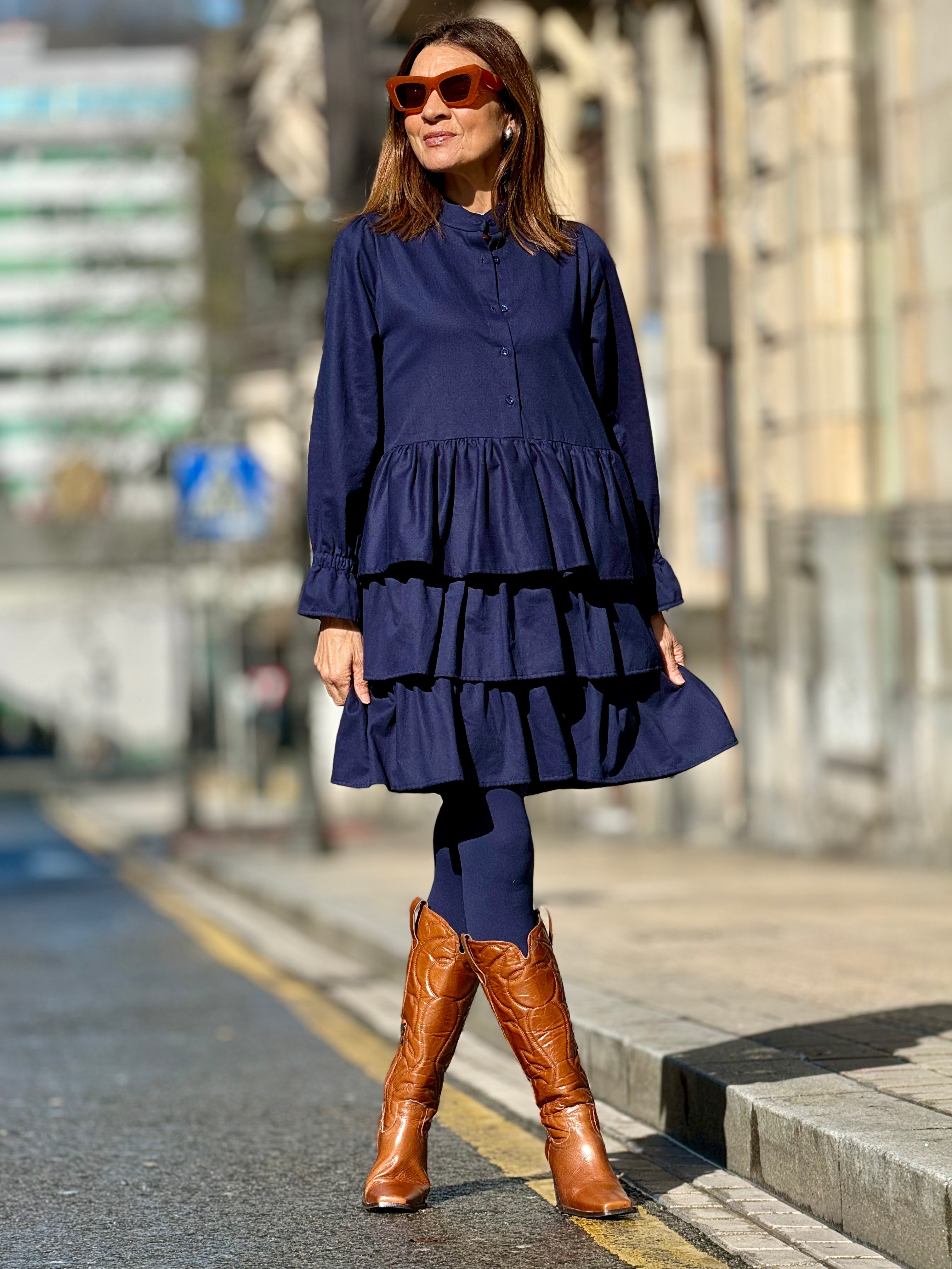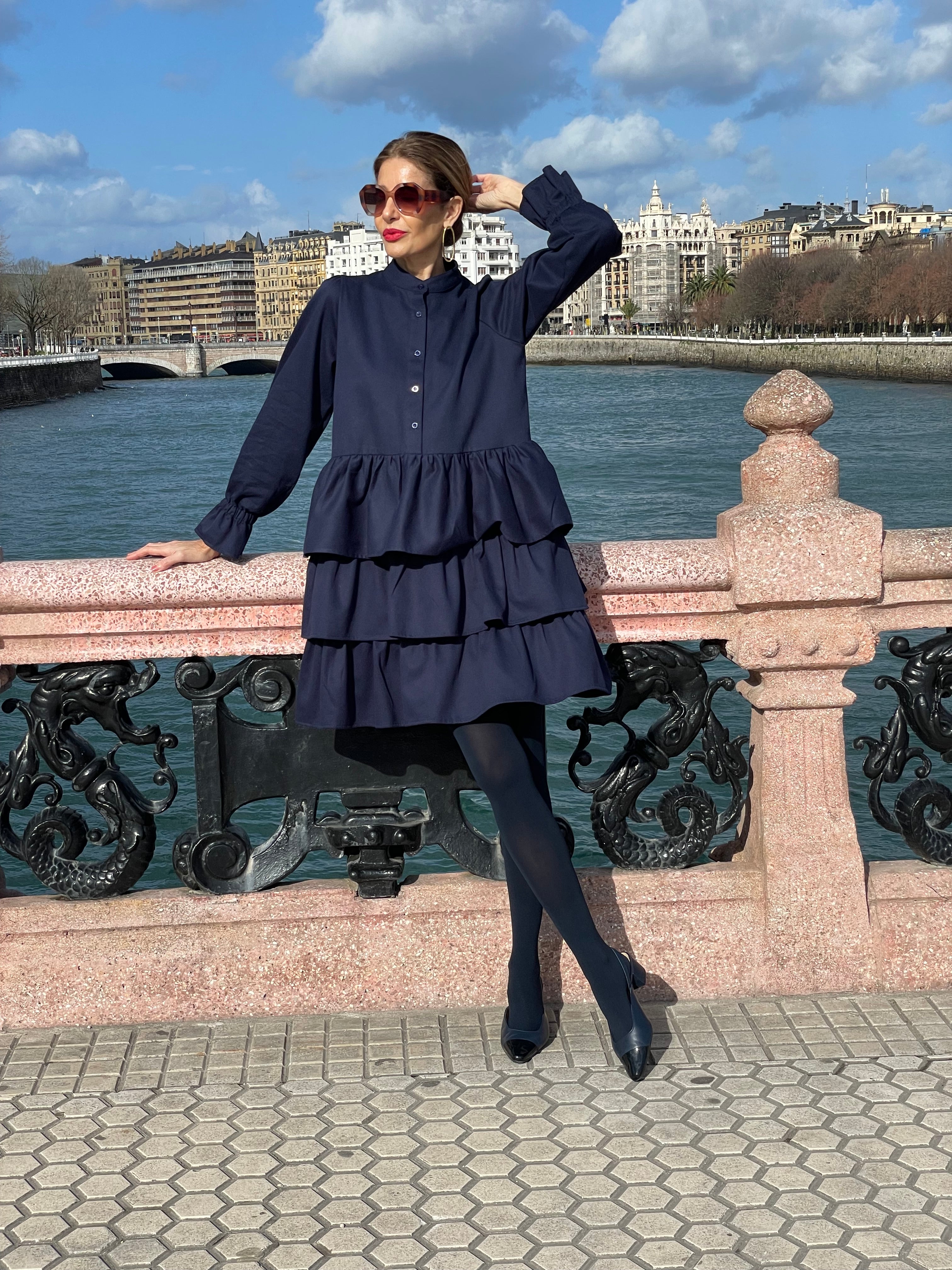 Introducing the stunning Dress Alexandra in navy blue! Made from high-quality gabardine fabric, this dress features beautiful volants that add a touch of elegance and movement. Perfect for any occasion, this dress will make you feel confident and stylish. Elevate your wardrobe with this must-have piece!Lenght of the dress 89 cm / 35 inch.
