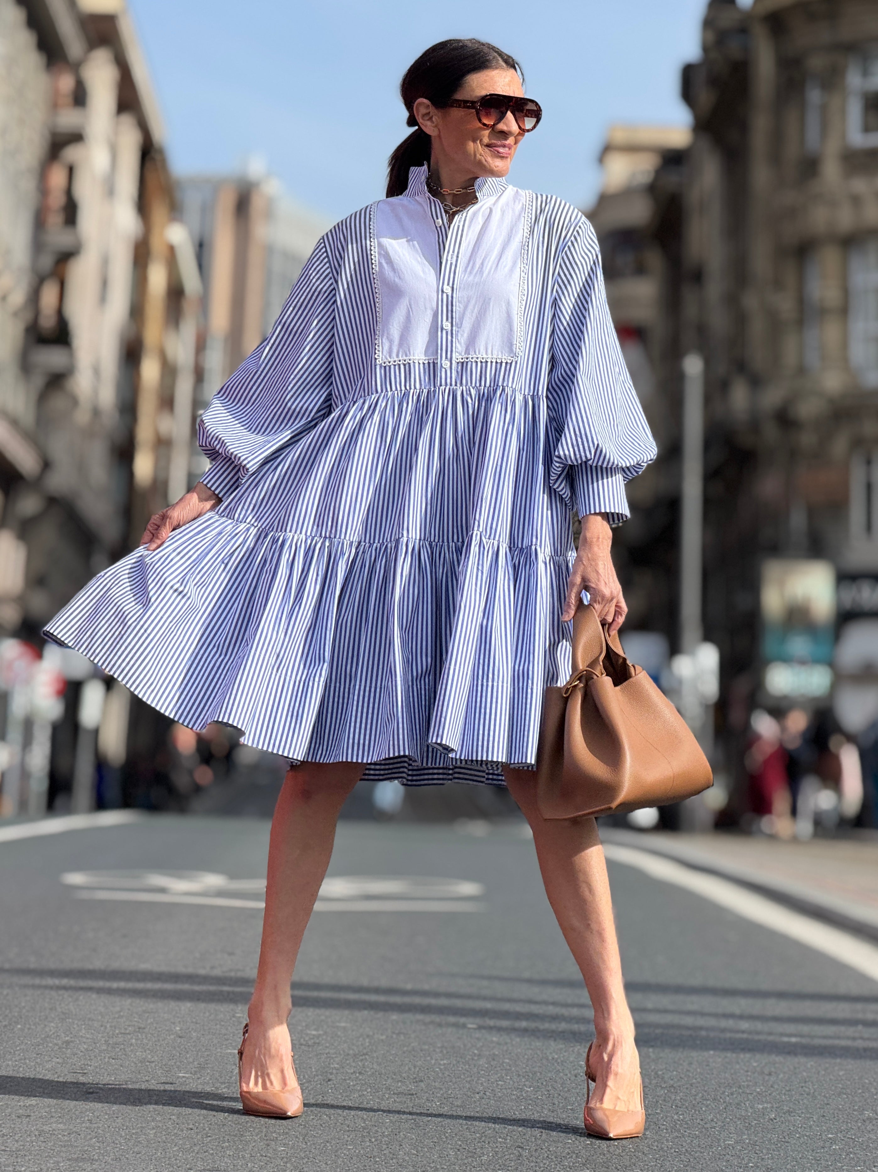 Discover the Cecilia, a sophisticated blue striped dress that embodies quiet elegance and versatile appeal. This refined piece seamlessly transitions across occasions with its polished aesthetic. Featuring practical side pockets Cecilia marries functionality with understated beauty. Each detail reflects our commitment to exceptional craftsmanship, making this latest collection addition a timeless investment in effortless style. The length of Dress Cecilia is 100 cm/ 39.3 inch.