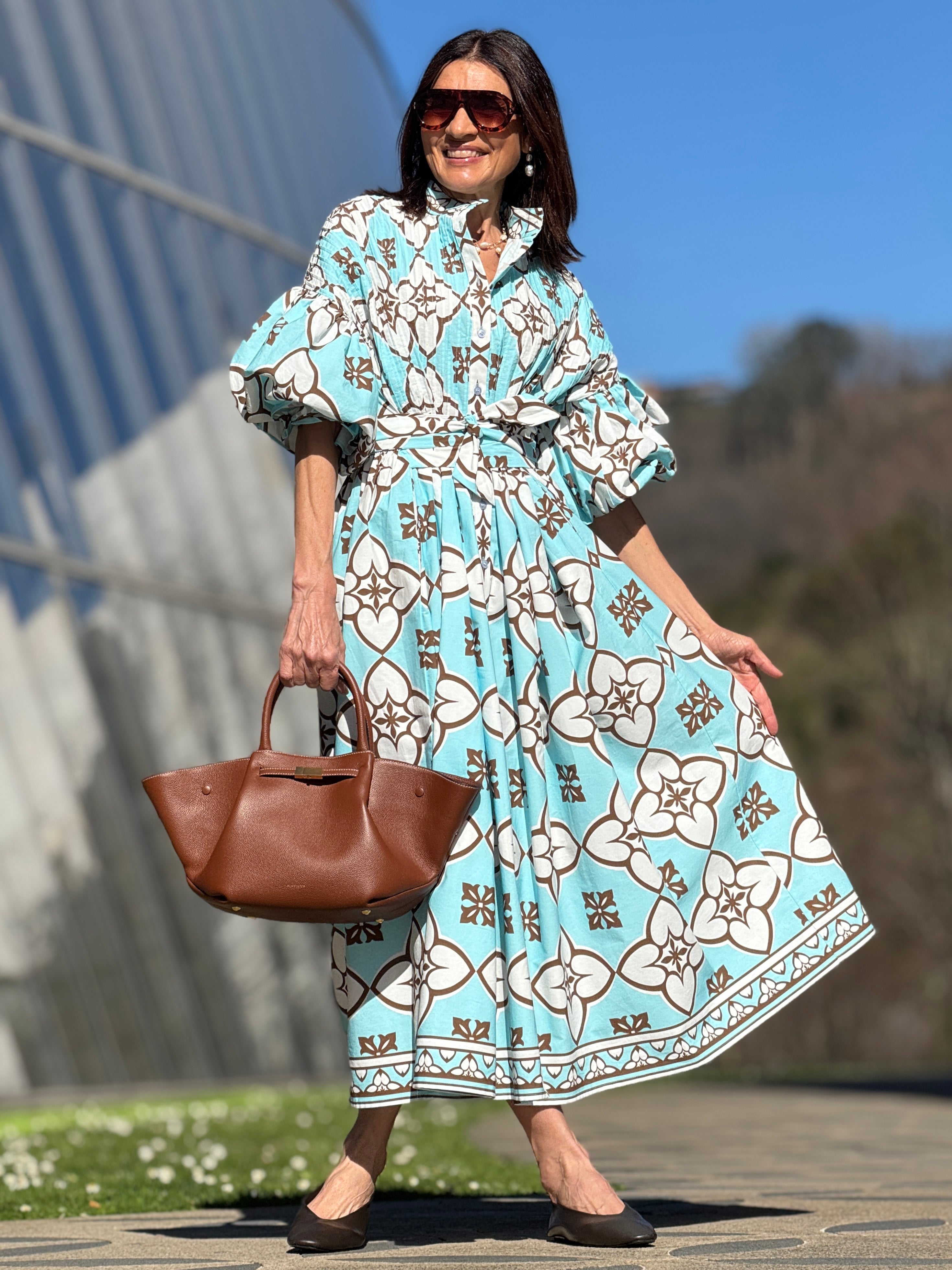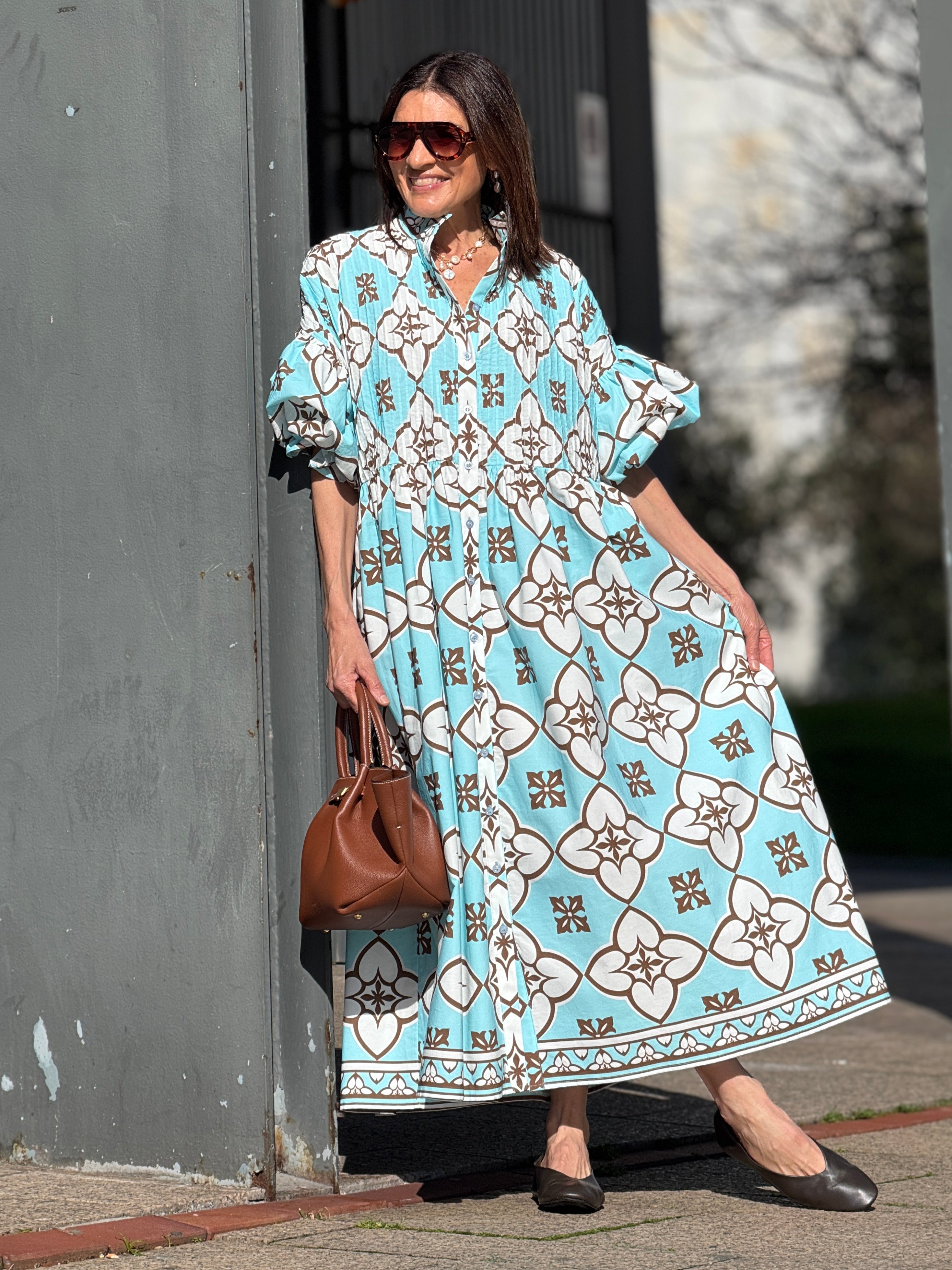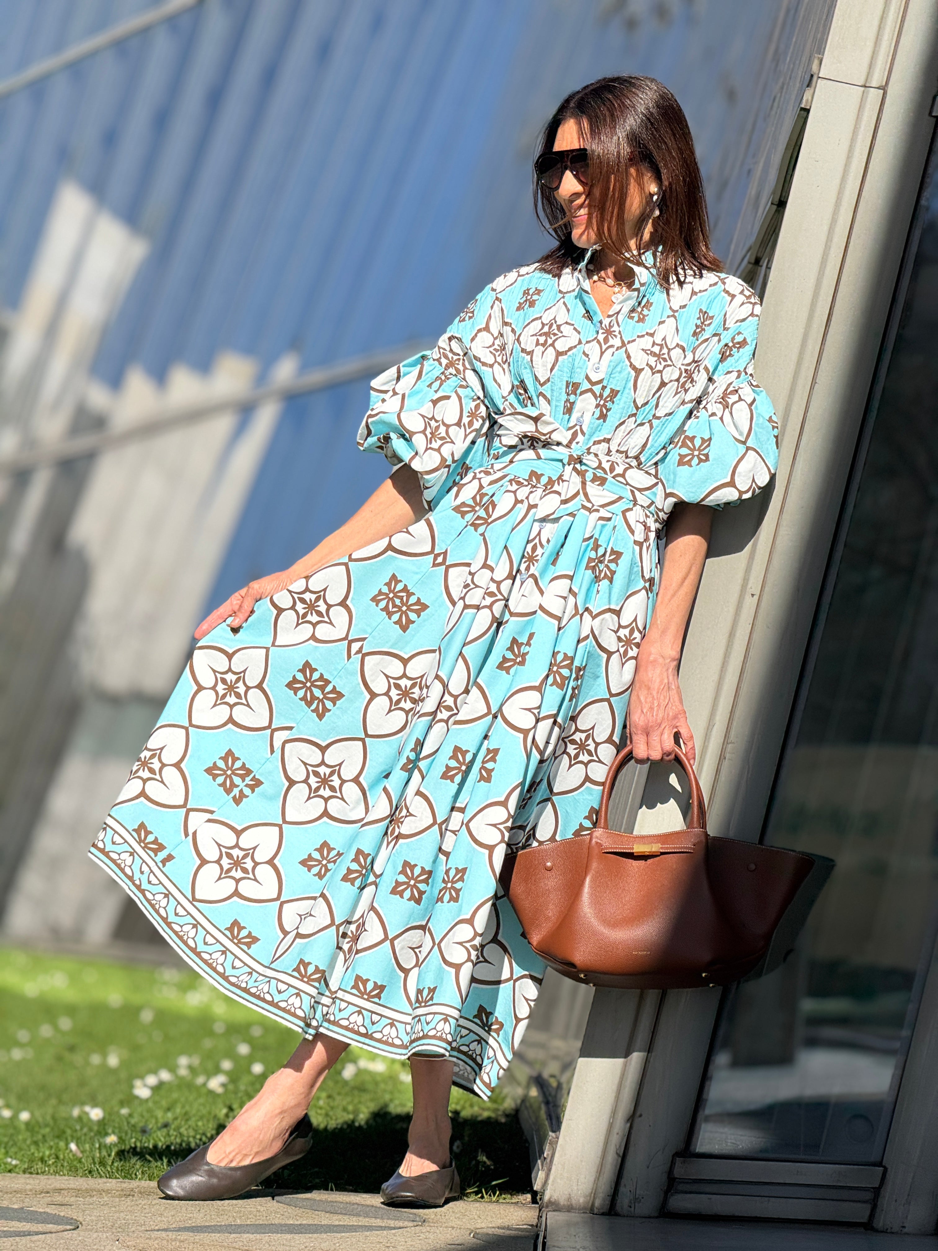 The Dress Phoebe Print Light Blue is a stylish and comfortable garment made from 100% Egyptian cotton. With a one size fits all design, this dress is suitable for a range of sizes from 34 to 42 in the German size system (see: tab sizes). Measuring a length of 130 cm/51 inch, this dress is perfect for any occasion. The fabric belt is attached to the dress. Dress Phoebe Print Light Blue has side pockets. Use machine washes at 30 degrees for easy care and maintenance.