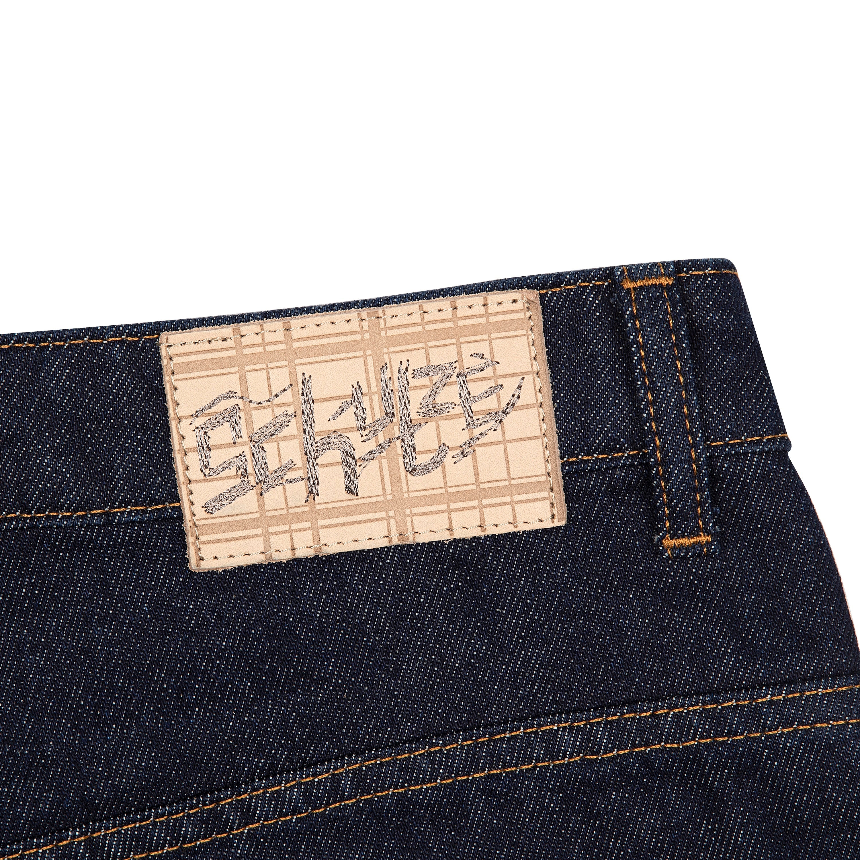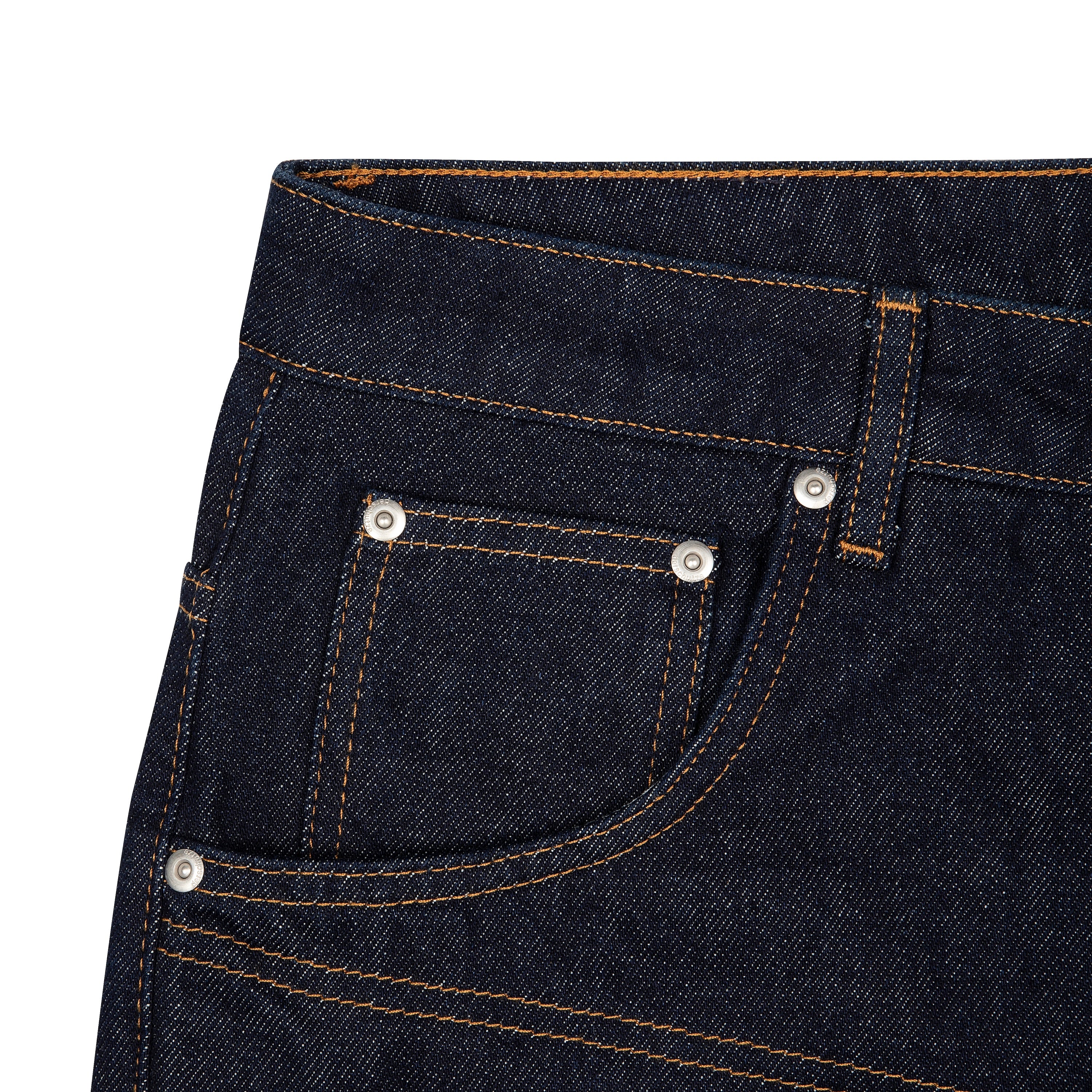 14,5oz raw denim / 100% cotton / yoke and back pocket look on front / embroideries on front pockets / plaid patterned deboss printed leather patch / custom button / baggy fit / fabric may bleed or fade, wash inside out in cold water to preserve color and character / fits true to size