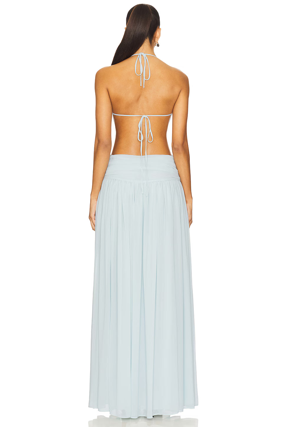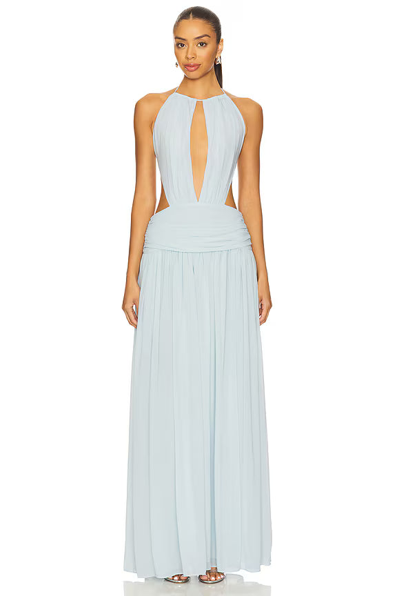 Elegant and striking, this halter maxi gown features a deep V front cut-out, side waist openings, and a lace-up back.