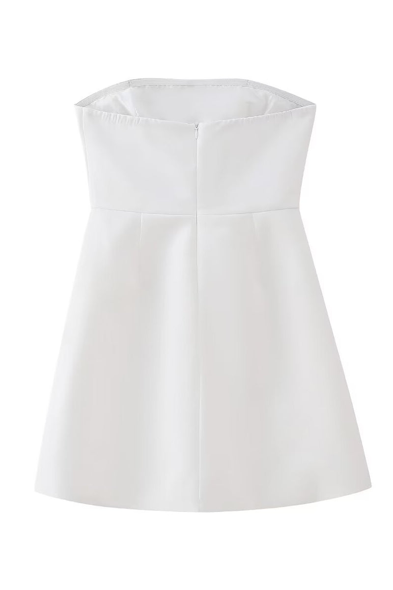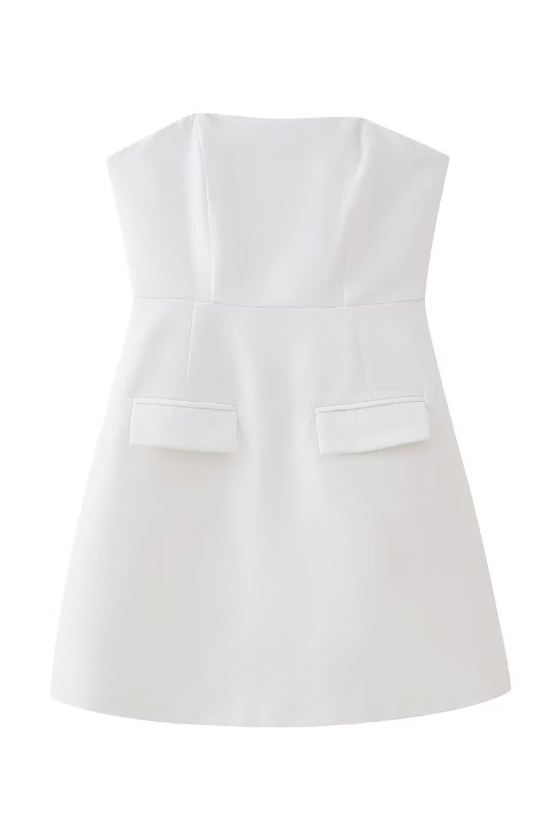 Clean lines meet modern elegance. This strapless A-line mini dress features a cinched waist and faux pocket detailing—perfect for chic daytime or elevated evenings.