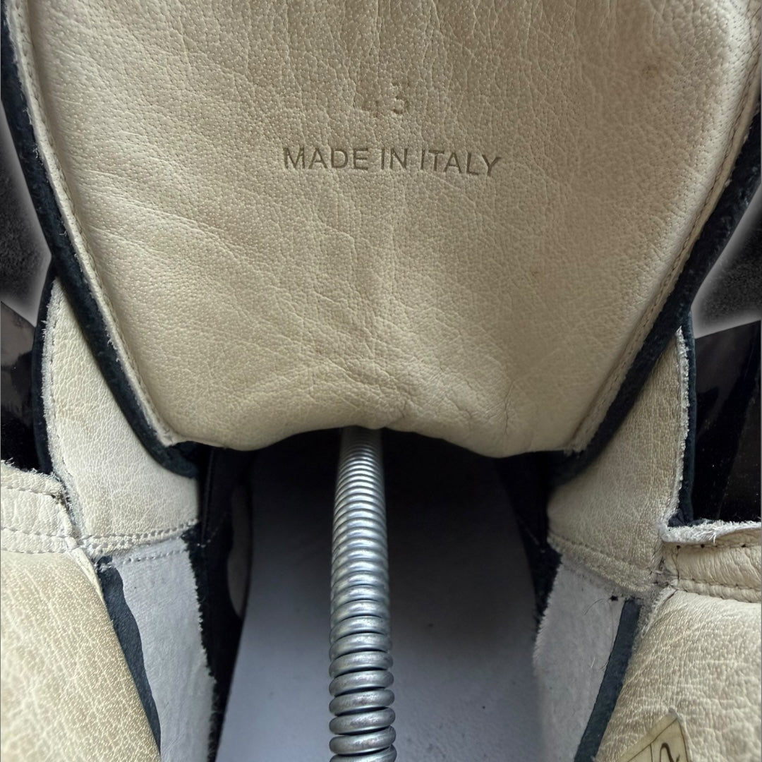 Featuring a full black patent leather upper, and a high quality zipper running through the middle of the shoe. This feels like if a leather jacket could be a shoe, this is what it would look like. Truly an all time grail.