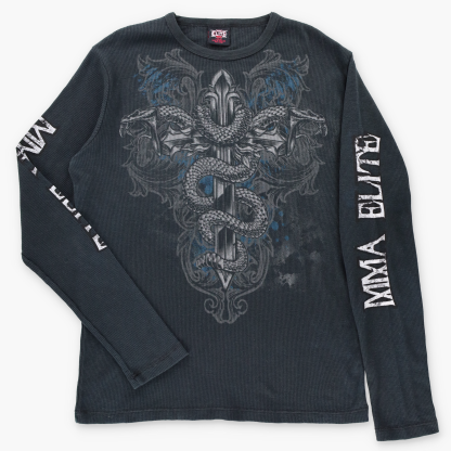 MMA ELITE Cross & Snakes Y2K Style Black Long Sleeve Waffle Tee (L)