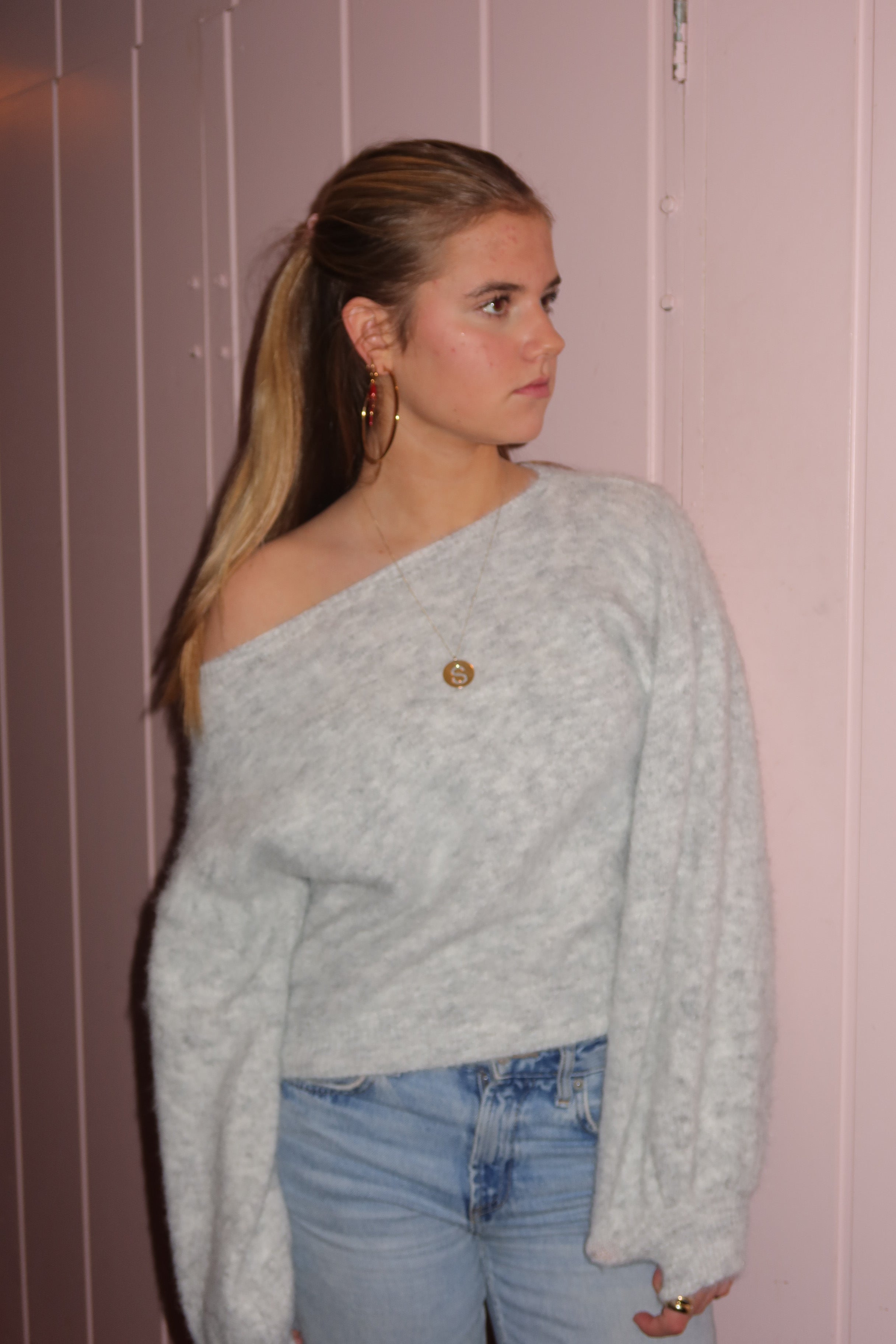A soft grey knit designed with a relaxed fit and voluminous balloon sleeves for a cosy yet refined look. The fuzzy texture and clean neckline create a timeless silhouette that feels both comfortable and elevated. Perfect to wear on its own or layered for effortless everyday styling.