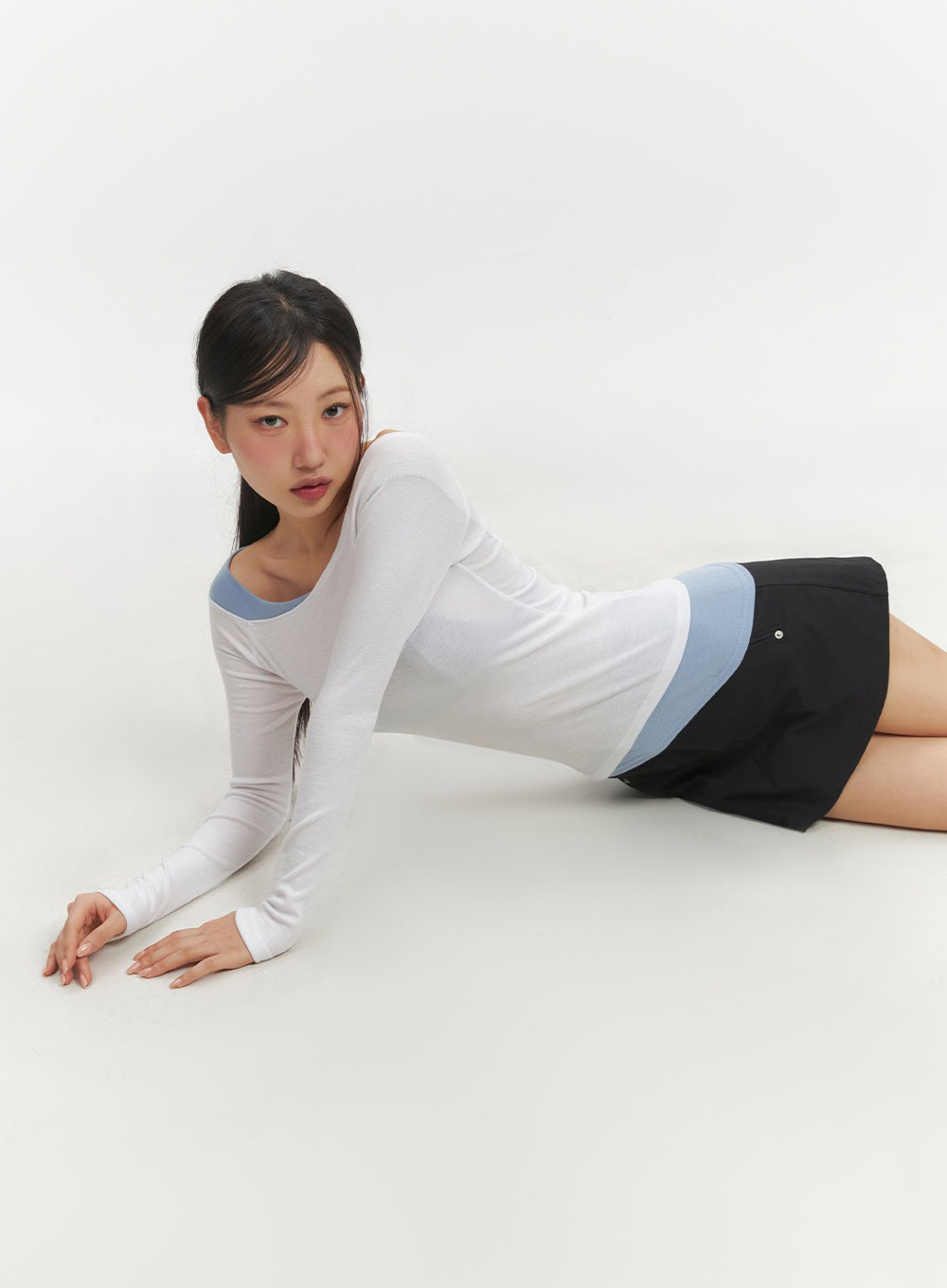 Style : Street, AcubiOccasion : Party wear, FestivalType : TShirtsDetail : UnbalancedPrint : SolidMaterial : Polyester, SpandexSleeve : Long sleeveNeck : Off shoulderFit : Slim fitPolyester 95% , Spandex5%Color : White, Dark blue, BlackMade in KoreaModel Size