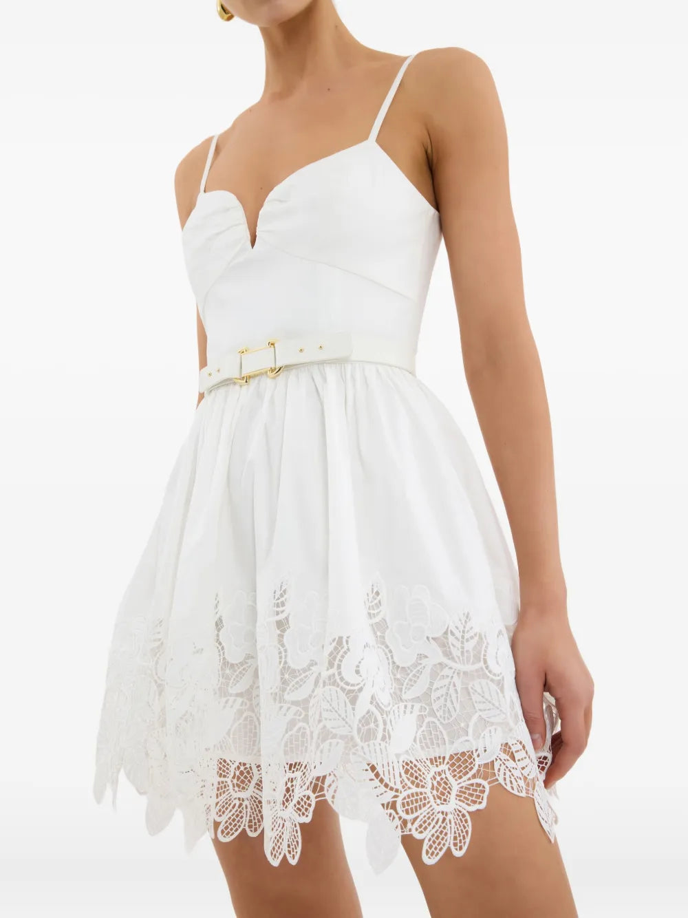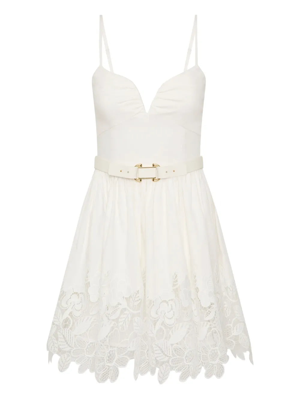 A dreamy V-neck mini dress with a cinched waist and lace-trimmed hem. Comes with a matching belt to enhance the waistline — sweet, youthful, and timeless.