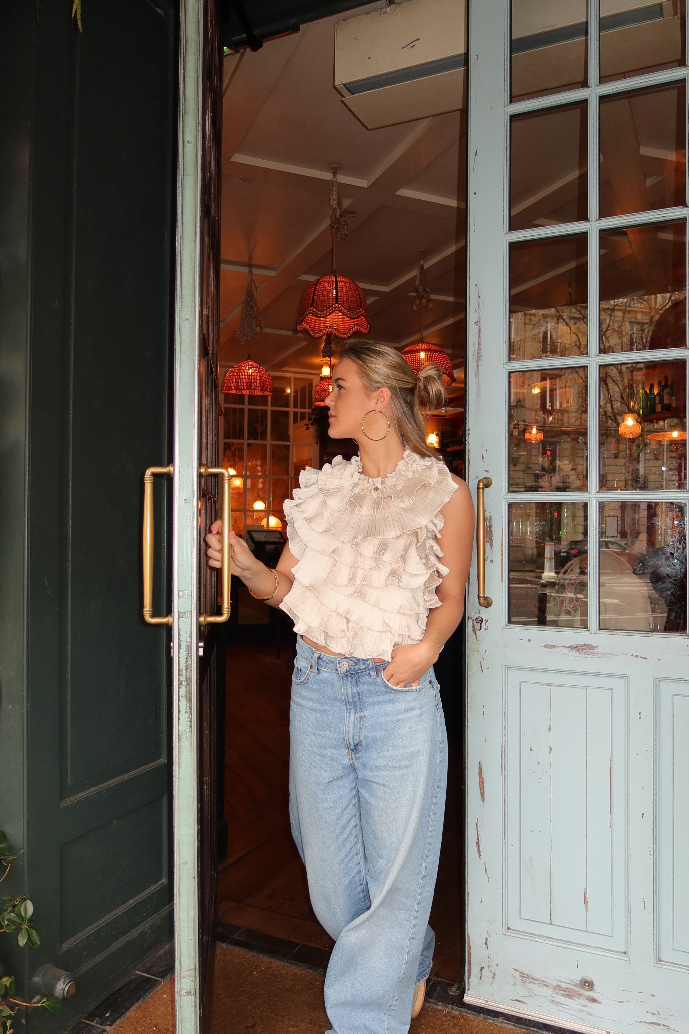 An elegant ivory statement top featuring layered plissé ruffles that create a soft, voluminous silhouette. The airy fabric and open-back design add a feminine, refined touch—perfect for elevated day-to-night styling.