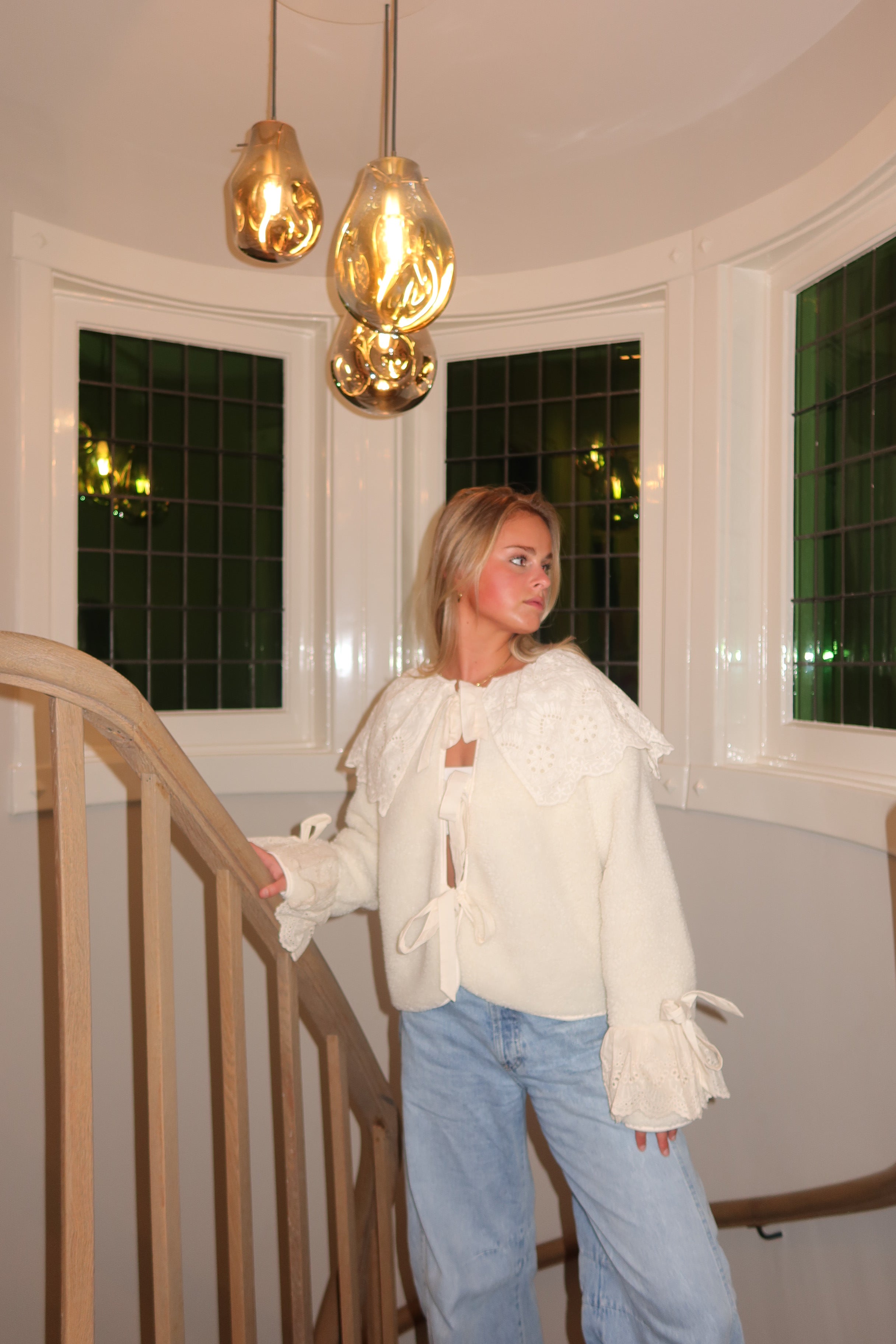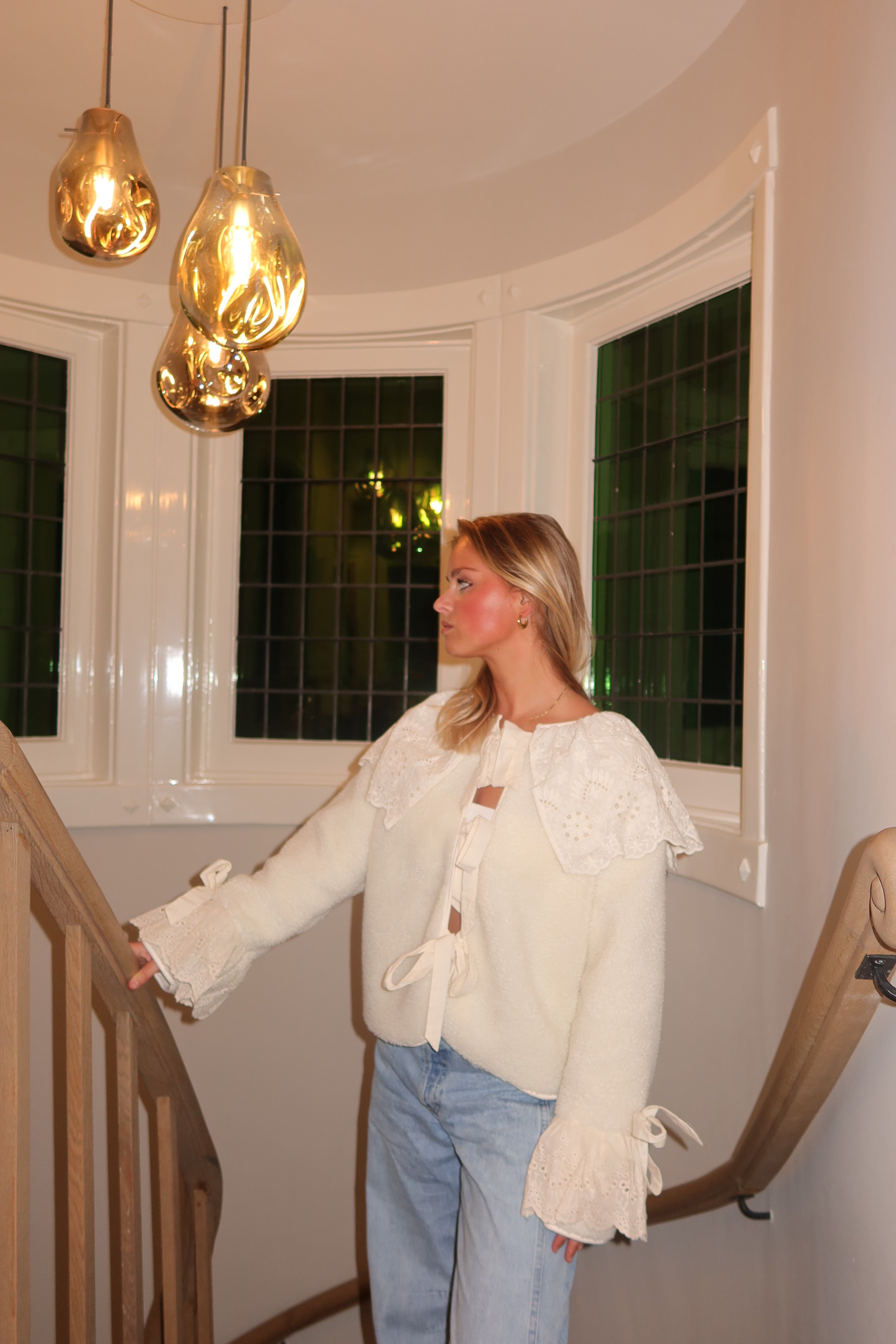 A romantic off-white wrap-style top crafted from a soft, textured fabric and finished with delicate broderie anglaise details. The design features an elegant wrap silhouette with adjustable tie closures, creating a flattering and feminine shape. Intricate embroidered panels along the shoulders and cuffs add a refined, vintage-inspired touch, while the lightweight feel keeps the look effortlessly wearable. Perfect to style with denim for a soft, everyday look or paired with tailored trousers or a skirt for a polished, elevated outfit.