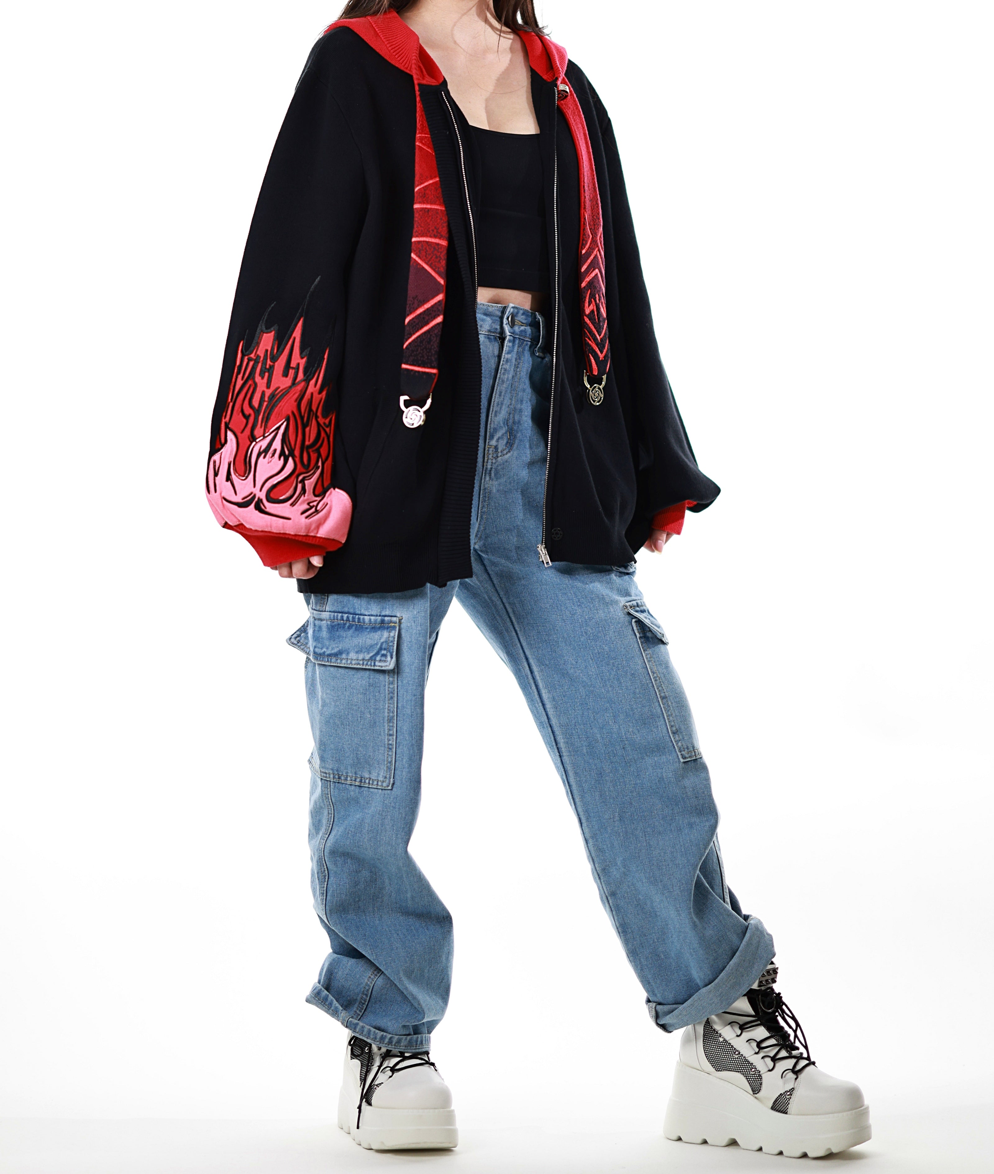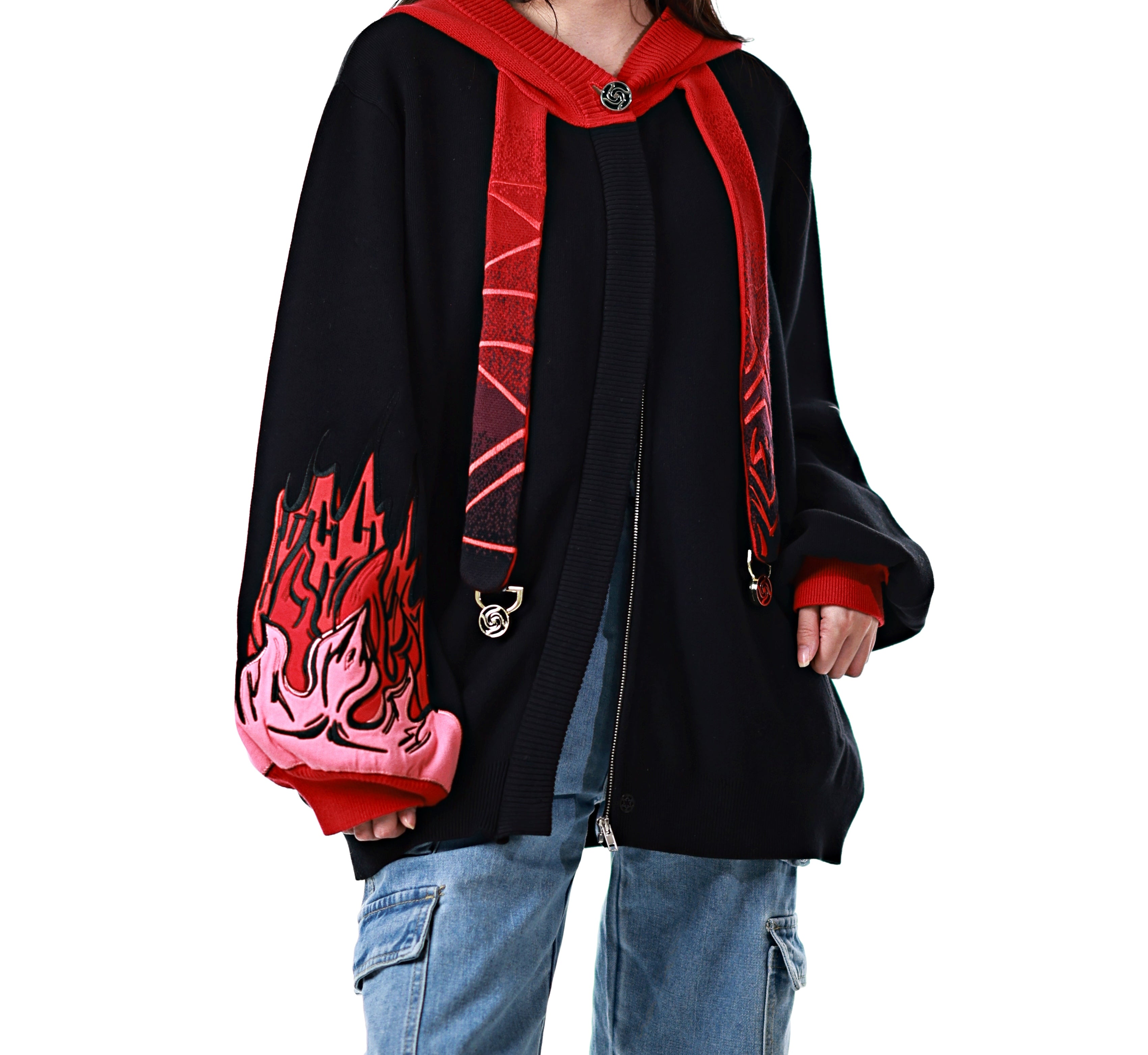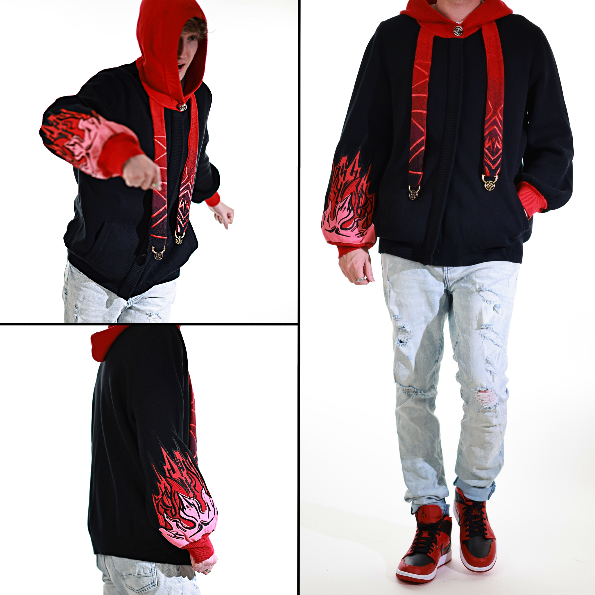 This whole collection features some of the most detailed embroidery we have ever made. The embroidered flames on the sleeves are partly hand-made and add a very unique effect by combining different layers of fabric. The design also features our new magnetic buttons and pendants that let you customize your hoodie and add your own touch! It comes with a set of button top pieces that can easily be interchanged with top pieces from other hoodies from this collection. You will also be able to purchase complementary top pieces as an add on in the future to further customize these hoodies. The pieces are made from high quality metal and black resin. The fabric is made from the highest quality 100% cotton yarns. It also has a curved Zipper to give this design an even more unique look.