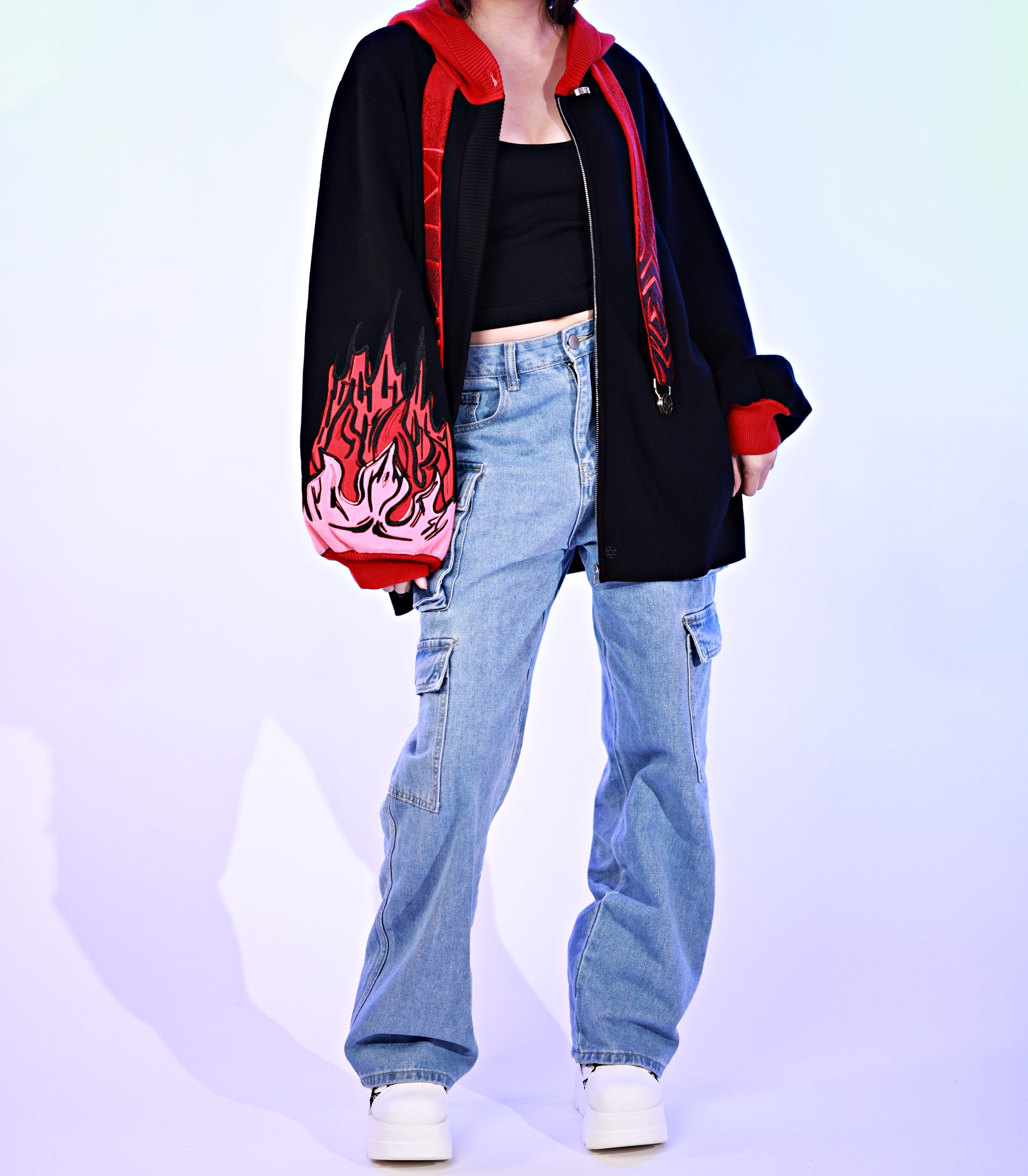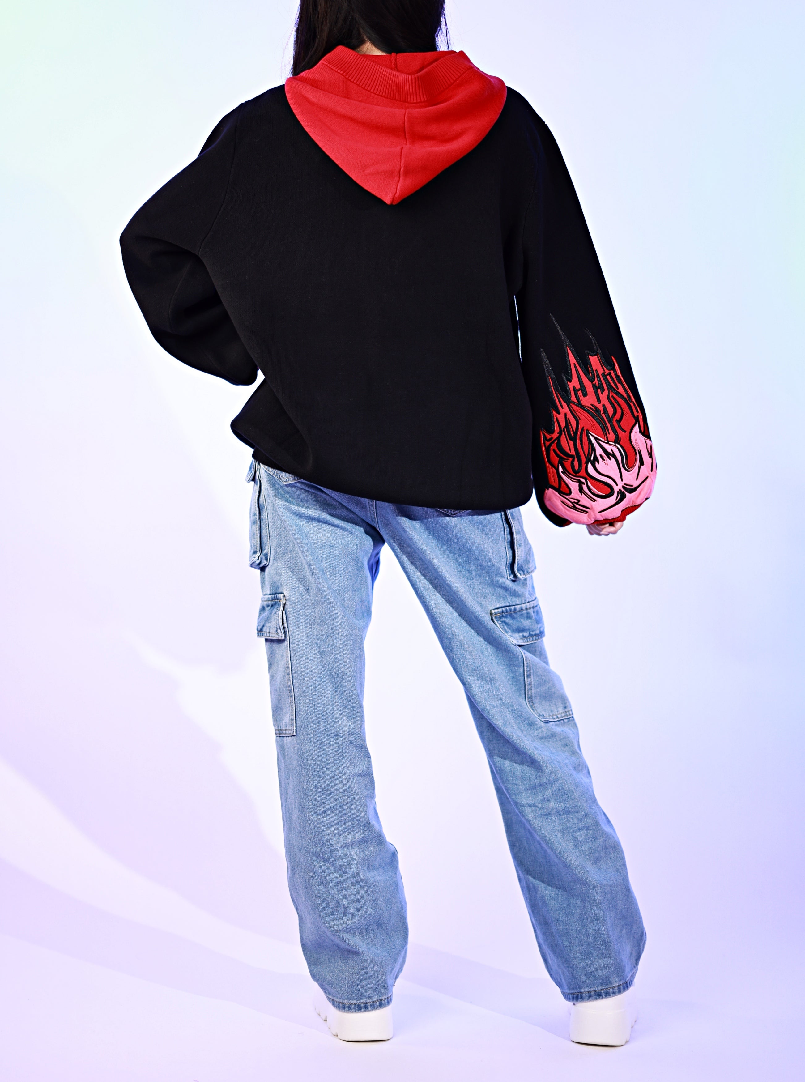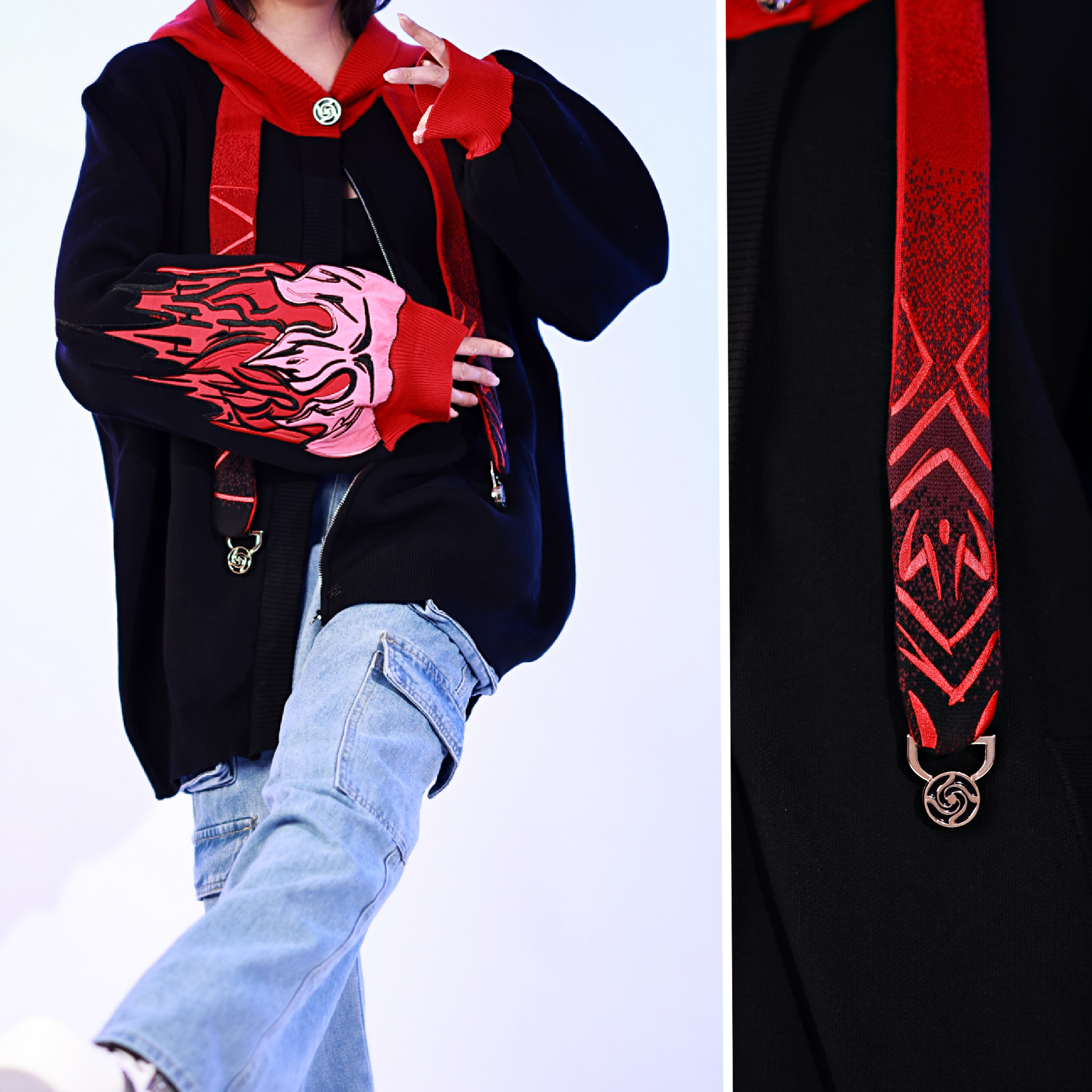 This whole collection features some of the most detailed embroidery we have ever made. The embroidered flames on the sleeves are partly hand-made and add a very unique effect by combining different layers of fabric. The design also features our new magnetic buttons and pendants that let you customize your hoodie and add your own touch! It comes with a set of button top pieces that can easily be interchanged with top pieces from other hoodies from this collection. You will also be able to purchase complementary top pieces as an add on in the future to further customize these hoodies. The pieces are made from high quality metal and black resin. The fabric is made from the highest quality 100% cotton yarns. It also has a curved Zipper to give this design an even more unique look.