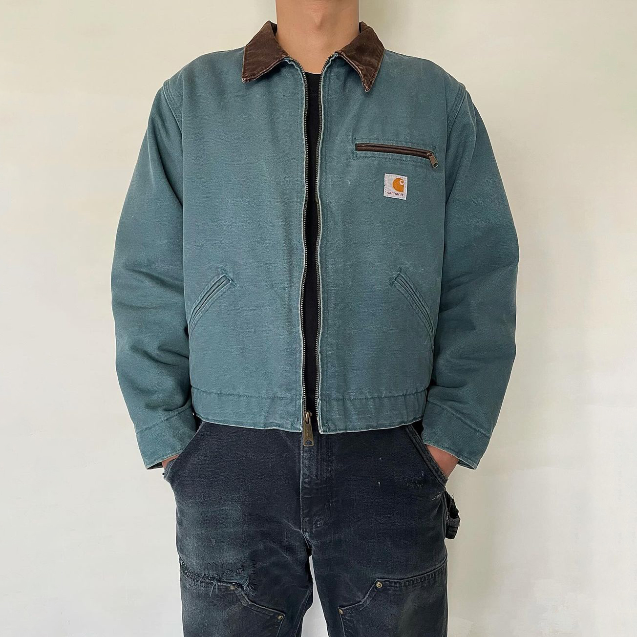 Vintage zipper distressed contrast lapel fleece jacket