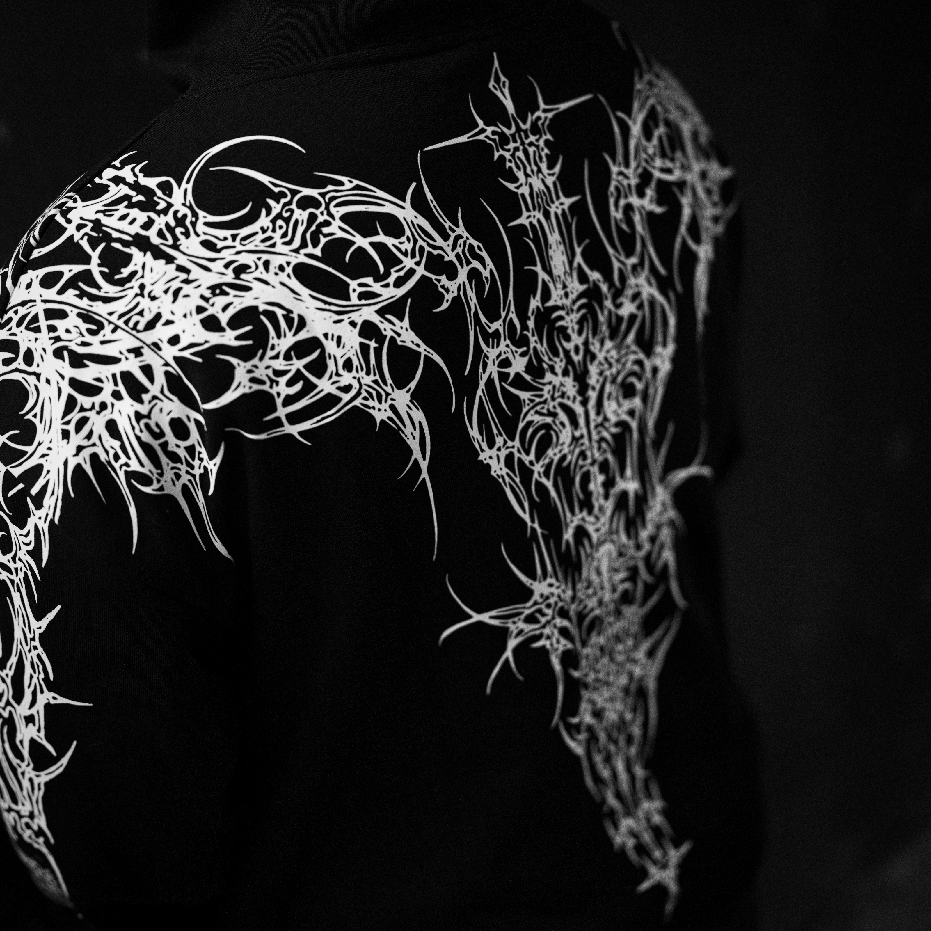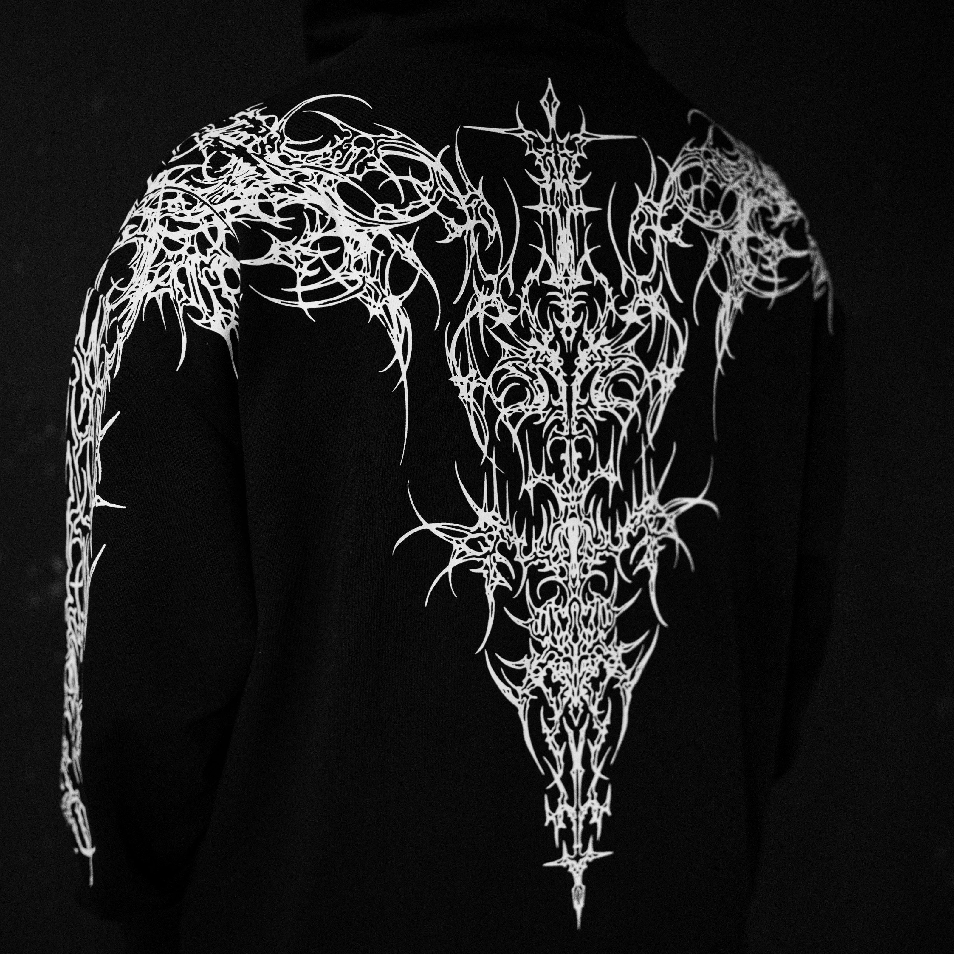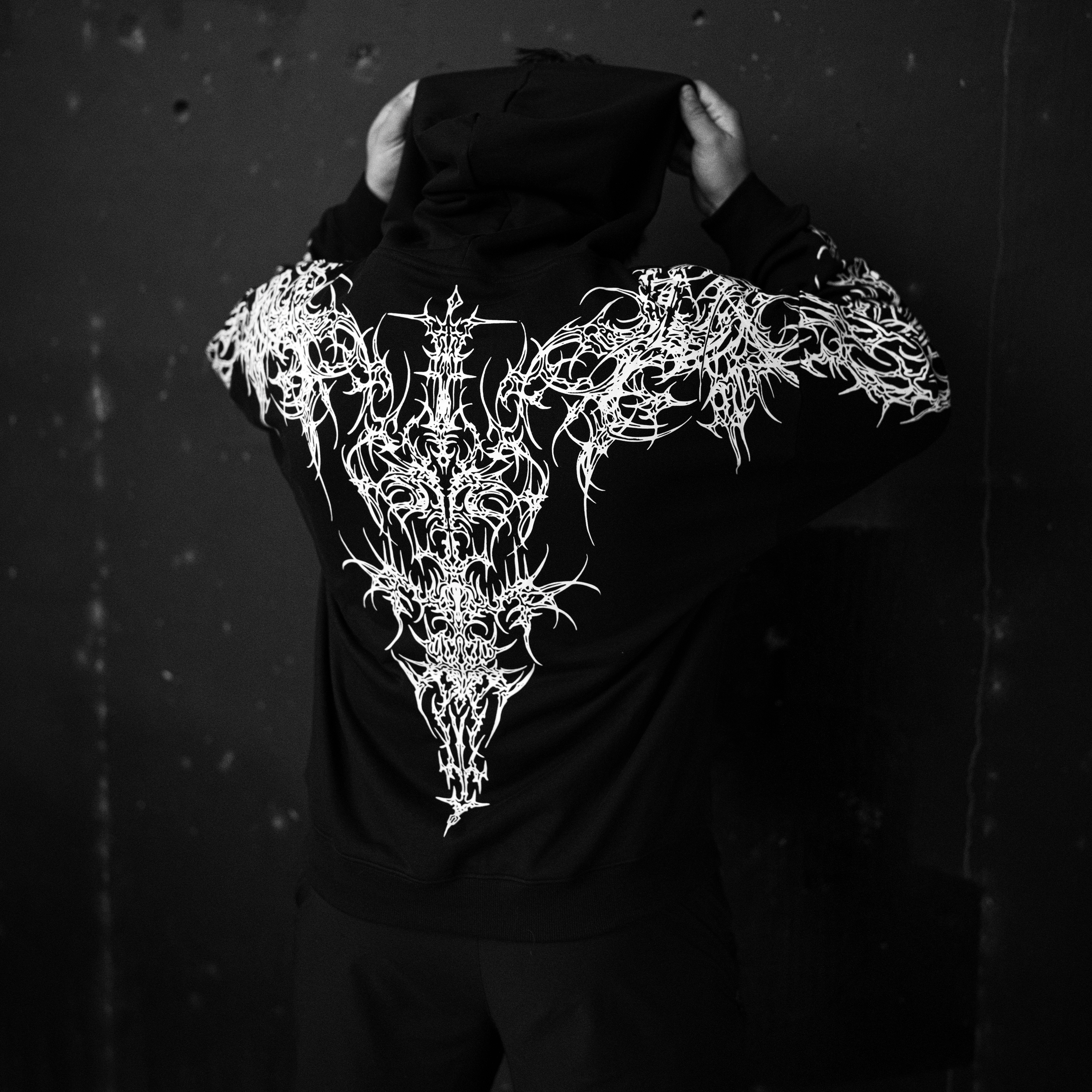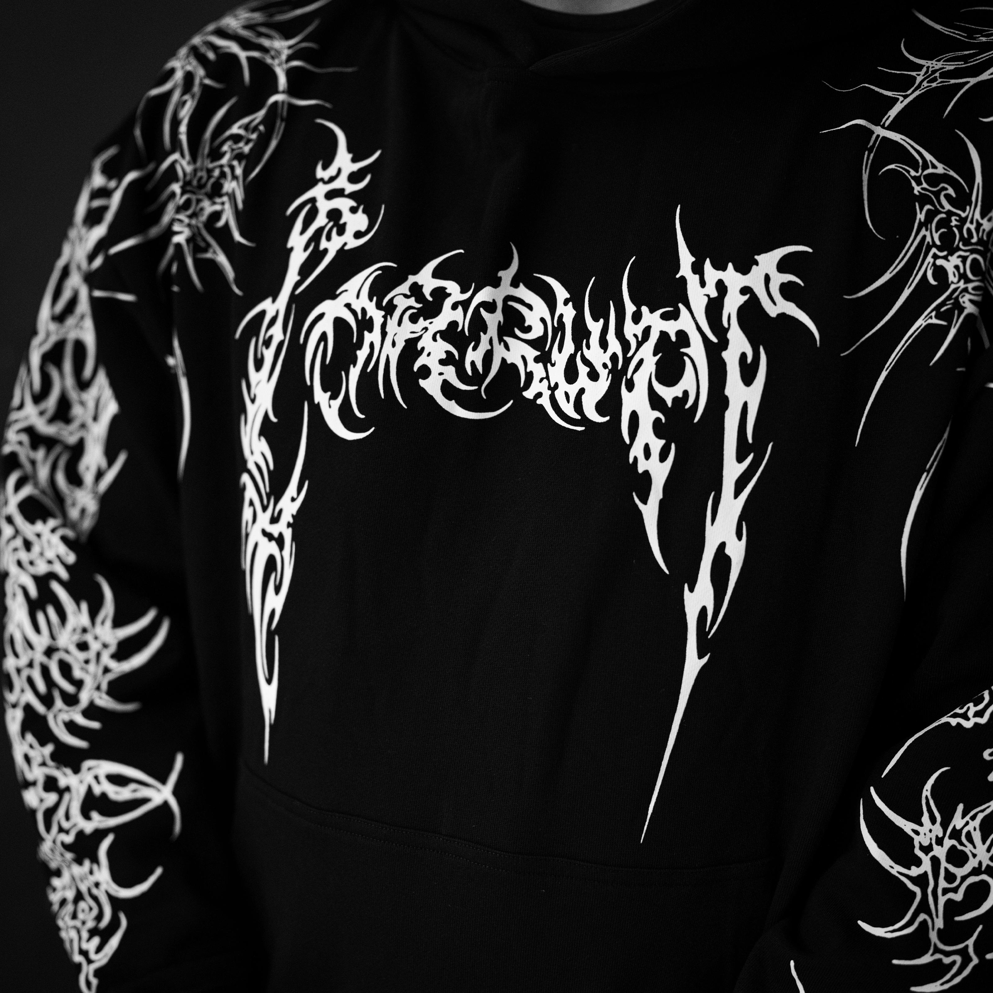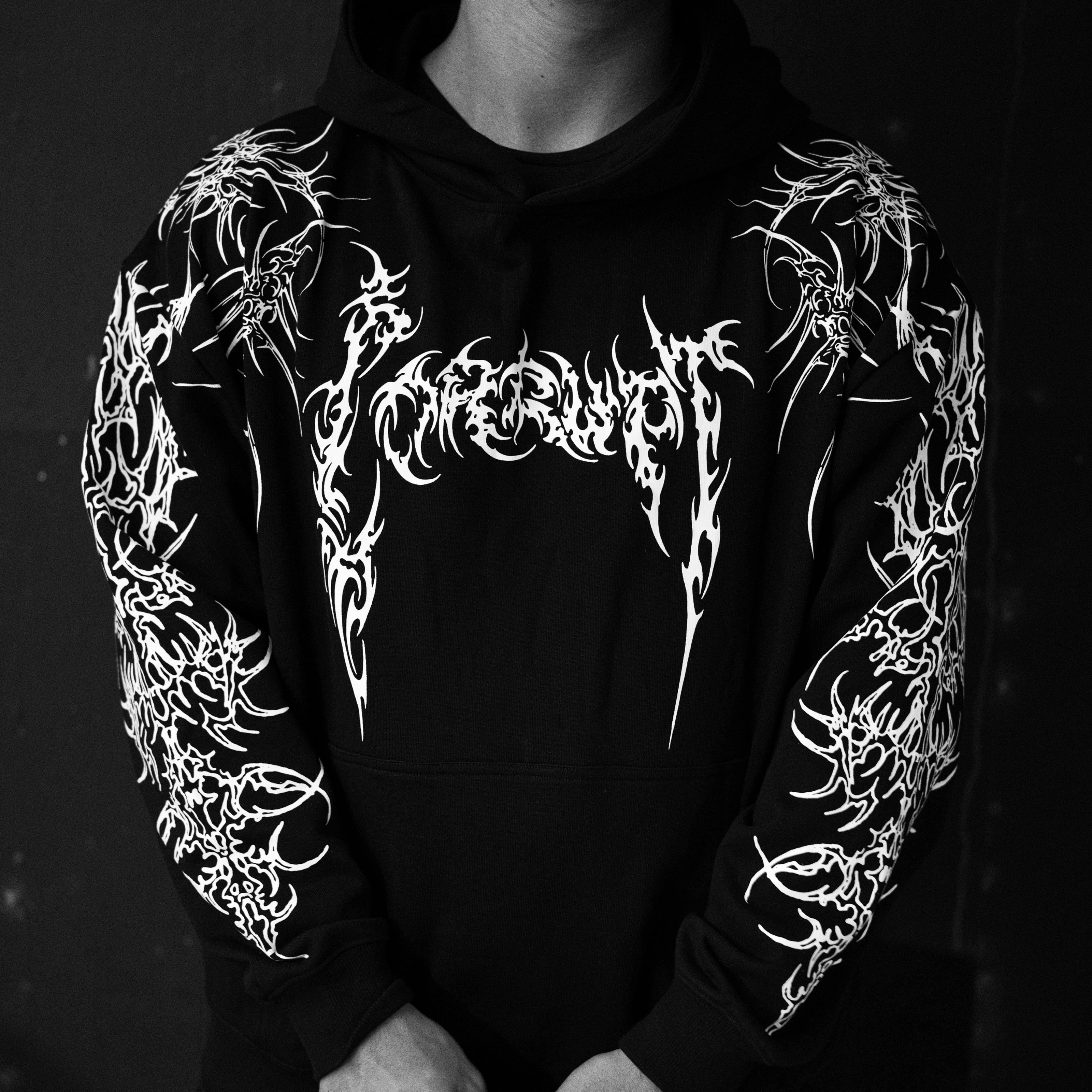 This oversized hoodie features a screen print design on the front, sleeve, and back, crafted from 380GSM French terry cotton for durability and comfort. It includes a kangaroo pocket and offers a relaxed, oversized fit for a contemporary look.