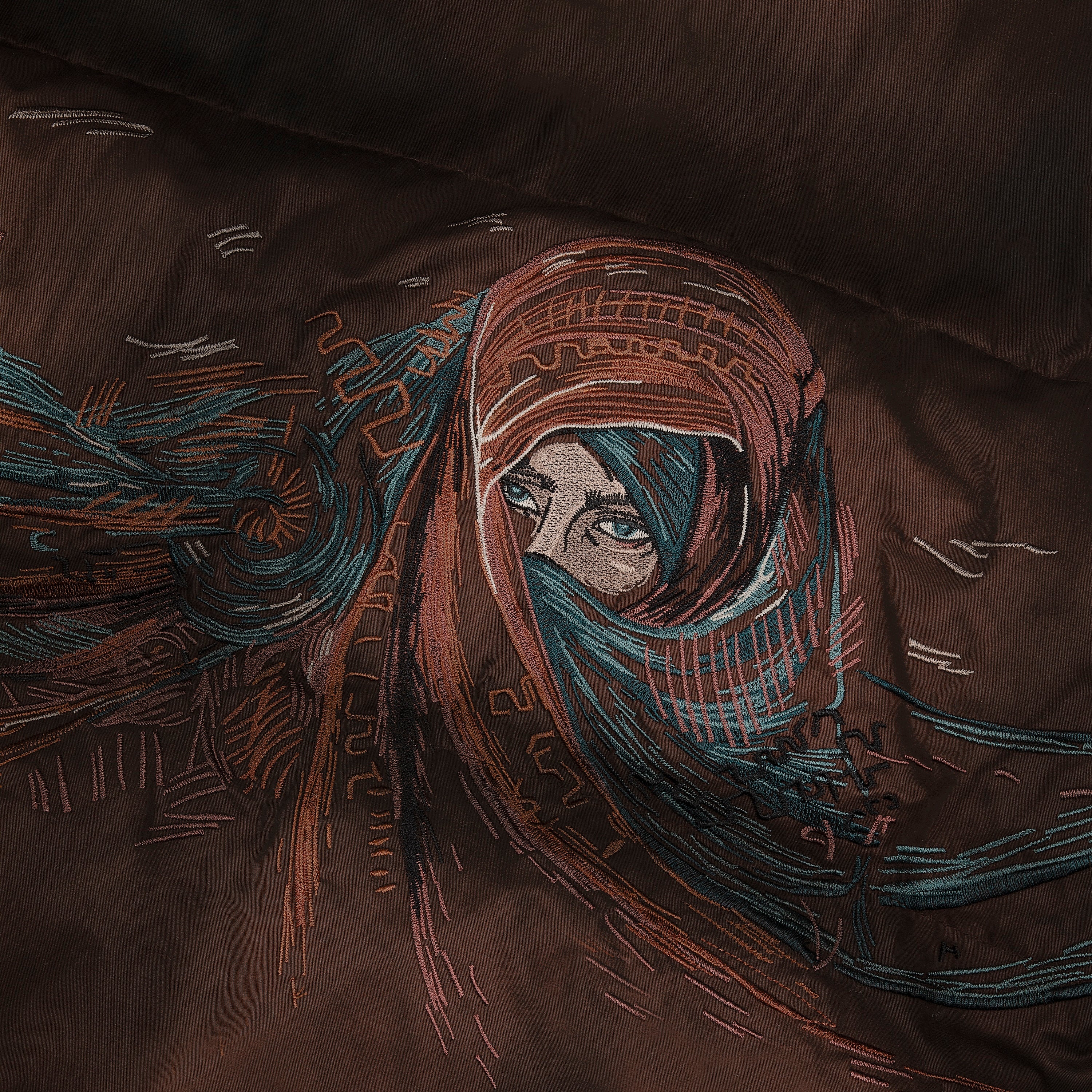 55/45 cotton polyester blend / micro gel filling / embroidery on sleeves, front and back / very light spray effect in dark brown / adjustable waistband / do not size down on this piece! size up for a loose fit / Size recommendation: 165-170cm small, 170-175cm medium, 175-180cm large, 180-185cm xlarge, 185-190cm xxlarge