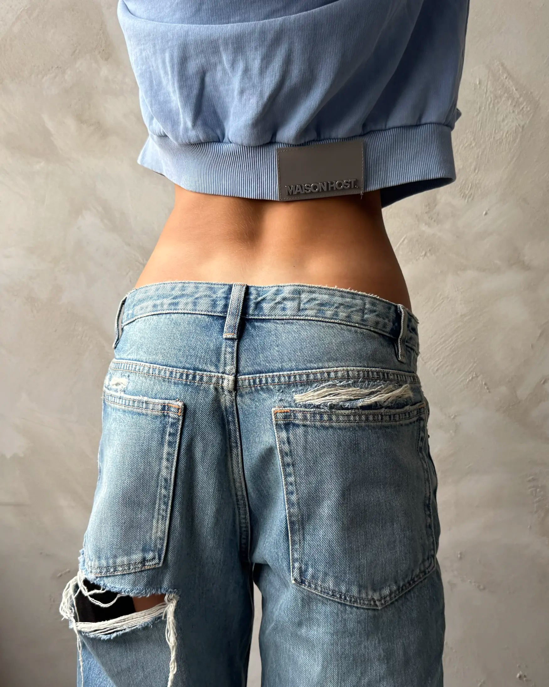 Designed with a dyed finish for a soft, vintage tone. The piece includes a metal side tag on the kangaroo pocket and a grey leather patch on the back waist rib, embossed with metallic MAISONHOST® lettering embedded in the leather.