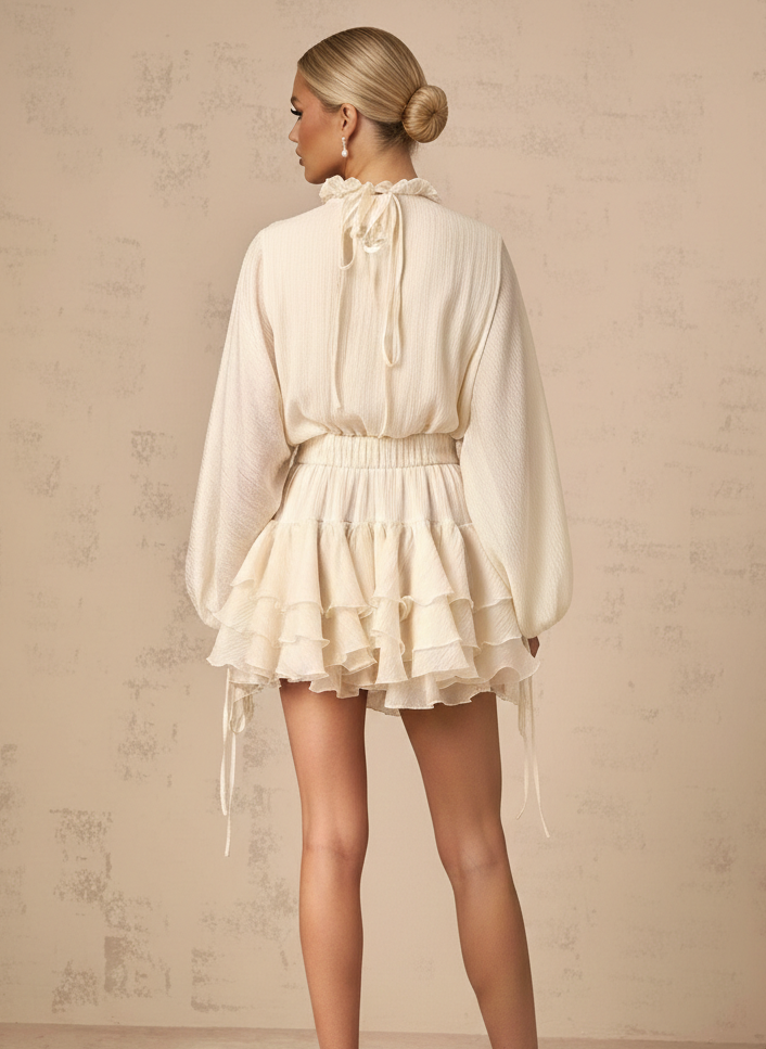 The Tiered Flare: A multi-layered ruffle skirt creates a voluminous, playful silhouette while maintaining a cinched, elasticated waist for that signature Snatched effect.