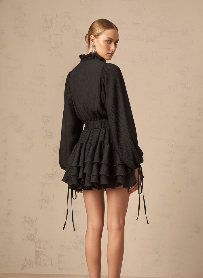 The "Aurelia" mini dress in Midnight Black is a masterclass in texture and silhouette. Part of our exclusive REVEALED drop, this piece balances modest high-fashion elements with a flirtatious, tiered finish, making it the essential choice for an elevated Night Out or a High Glam cocktail event.
