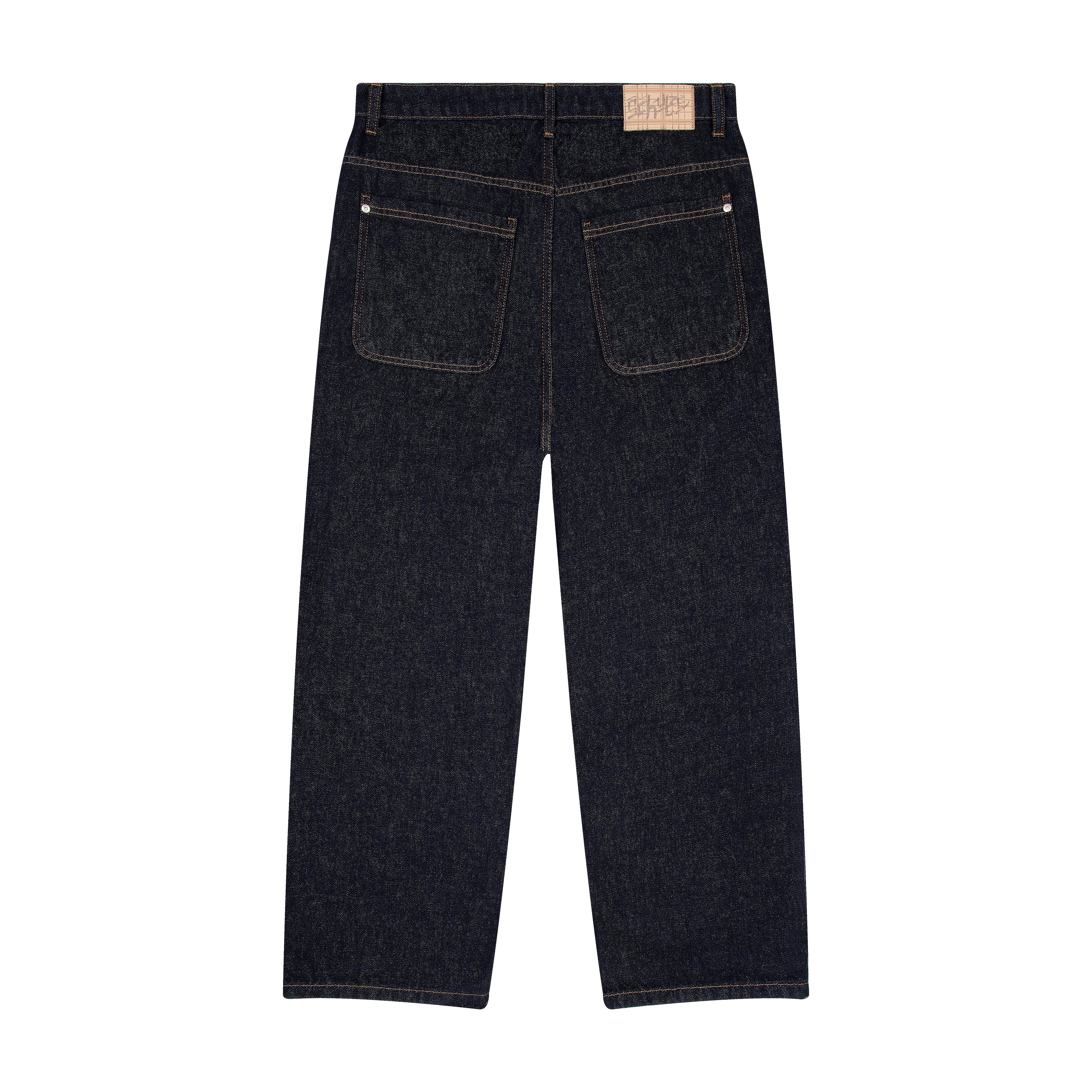 14,5oz raw denim / 100% cotton / yoke and back pocket look on front / embroideries on front pockets / plaid patterned deboss printed leather patch / custom button / baggy fit / fabric may bleed or fade, wash inside out in cold water to preserve color and character / fits true to size