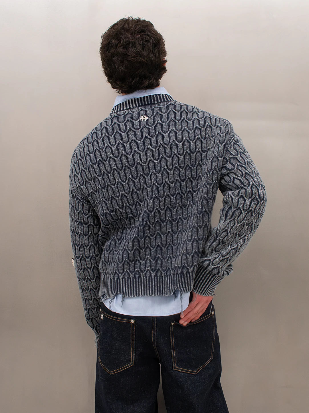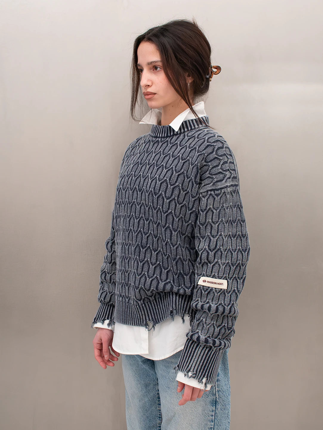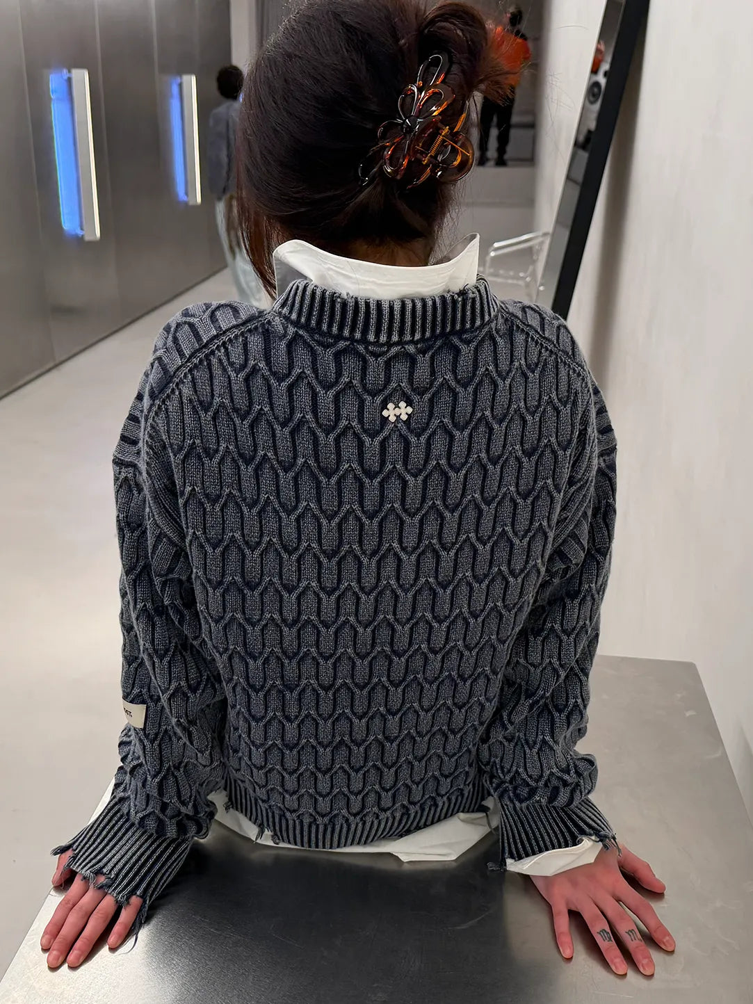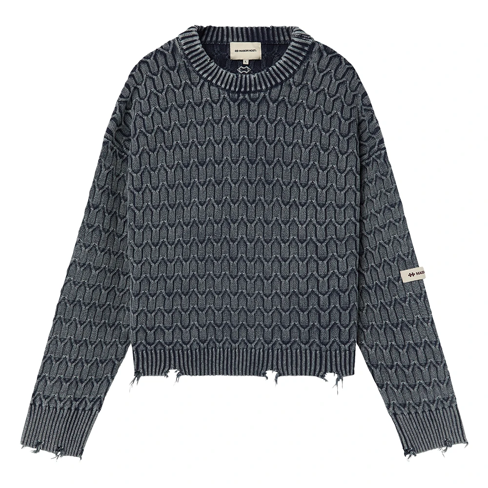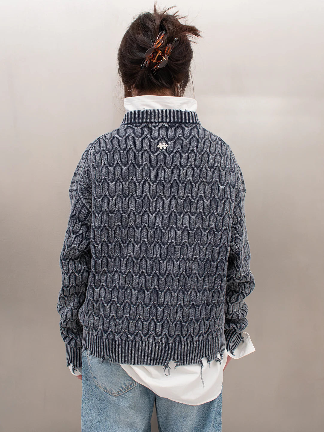 Features an all-over cable knit pattern, a fabric patch on the left sleeve, and a metal logo below the back neckline. Finished with distressed detailing on the cuffs and hem.
