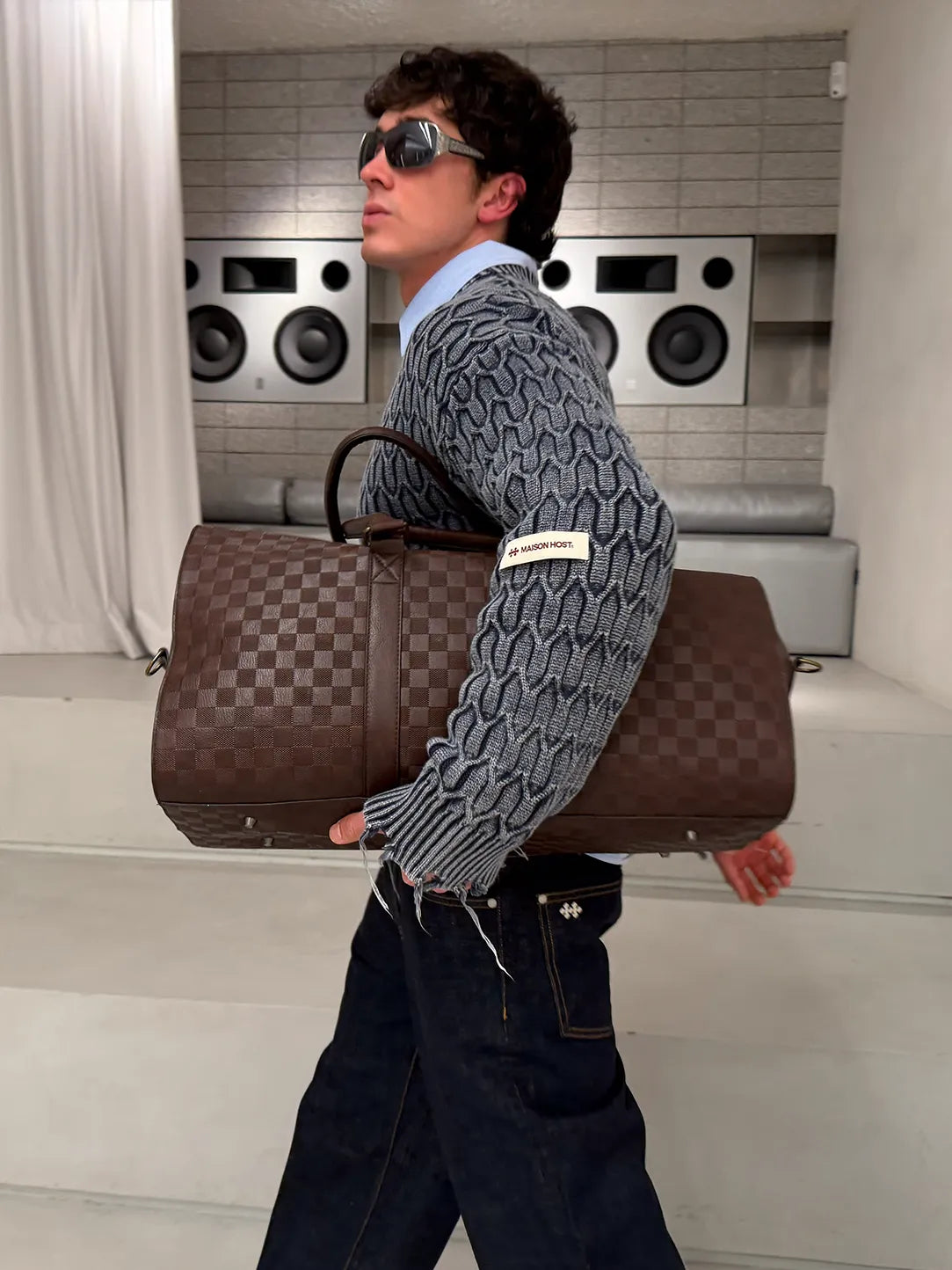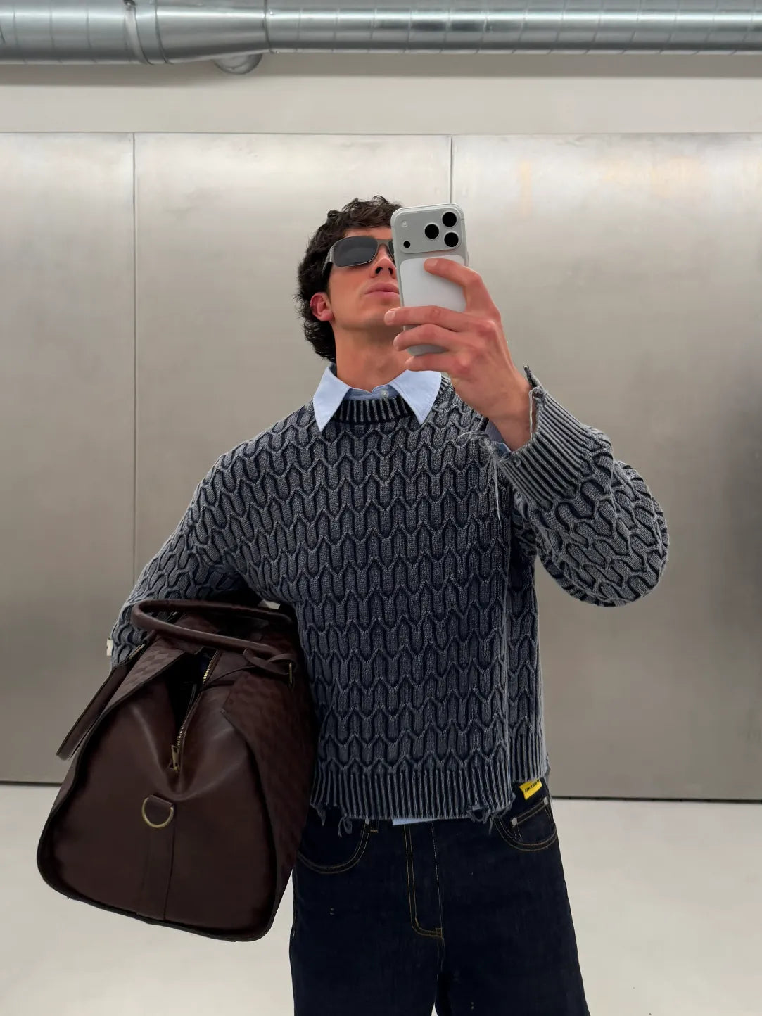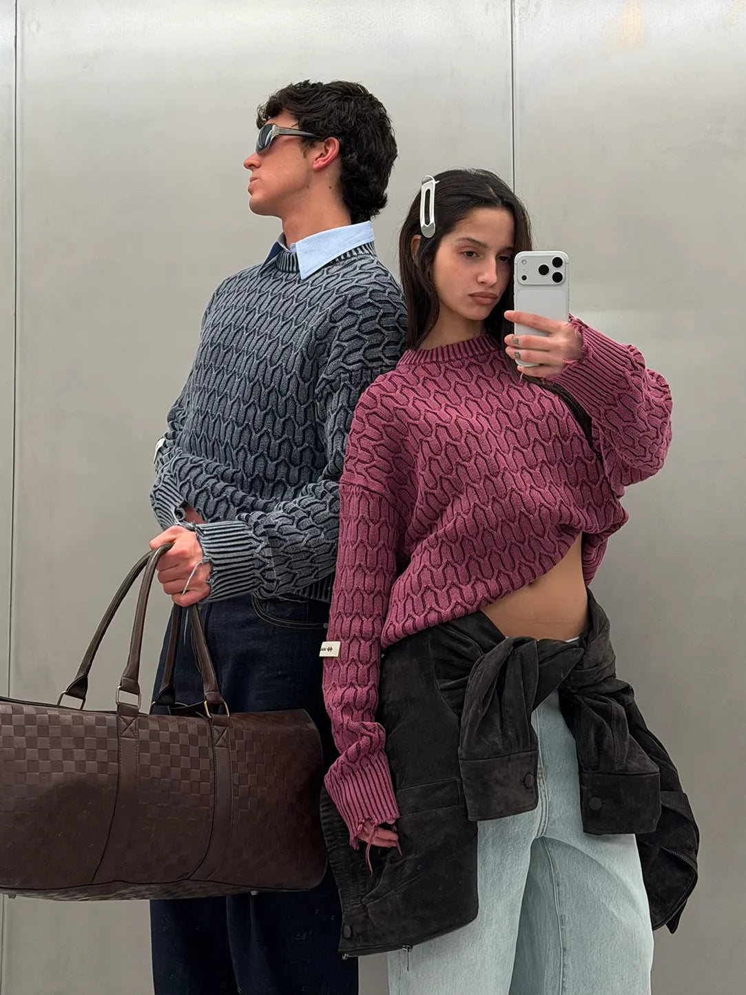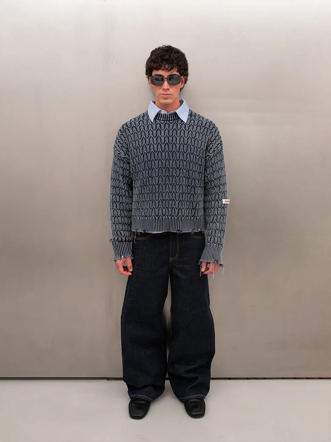 Features an all-over cable knit pattern, a fabric patch on the left sleeve, and a metal logo below the back neckline. Finished with distressed detailing on the cuffs and hem.