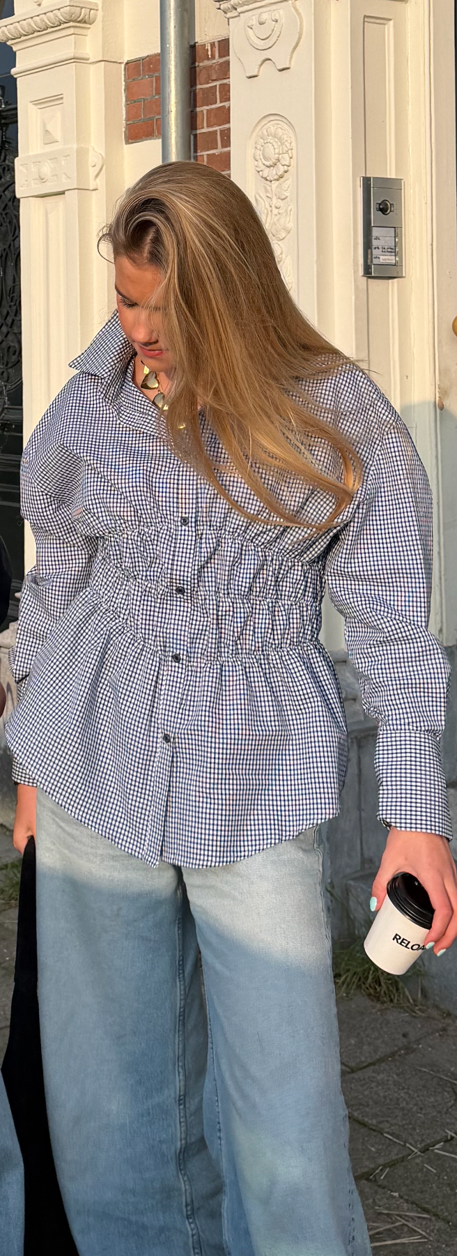 A feminine blouse featuring a refined blue-and-white gingham check, designed with a subtly cinched waist and a gently flared silhouette for a flattering fit. The soft cotton fabric feels comfortable and drapes beautifully, while the classic collar and button-down front add a timeless touch. Lightly puffed sleeves and delicate gathering at the waist give the blouse a playful yet modern finish. Perfect to style with denim for an effortless everyday look or paired with tailored pieces for a more polished feel.