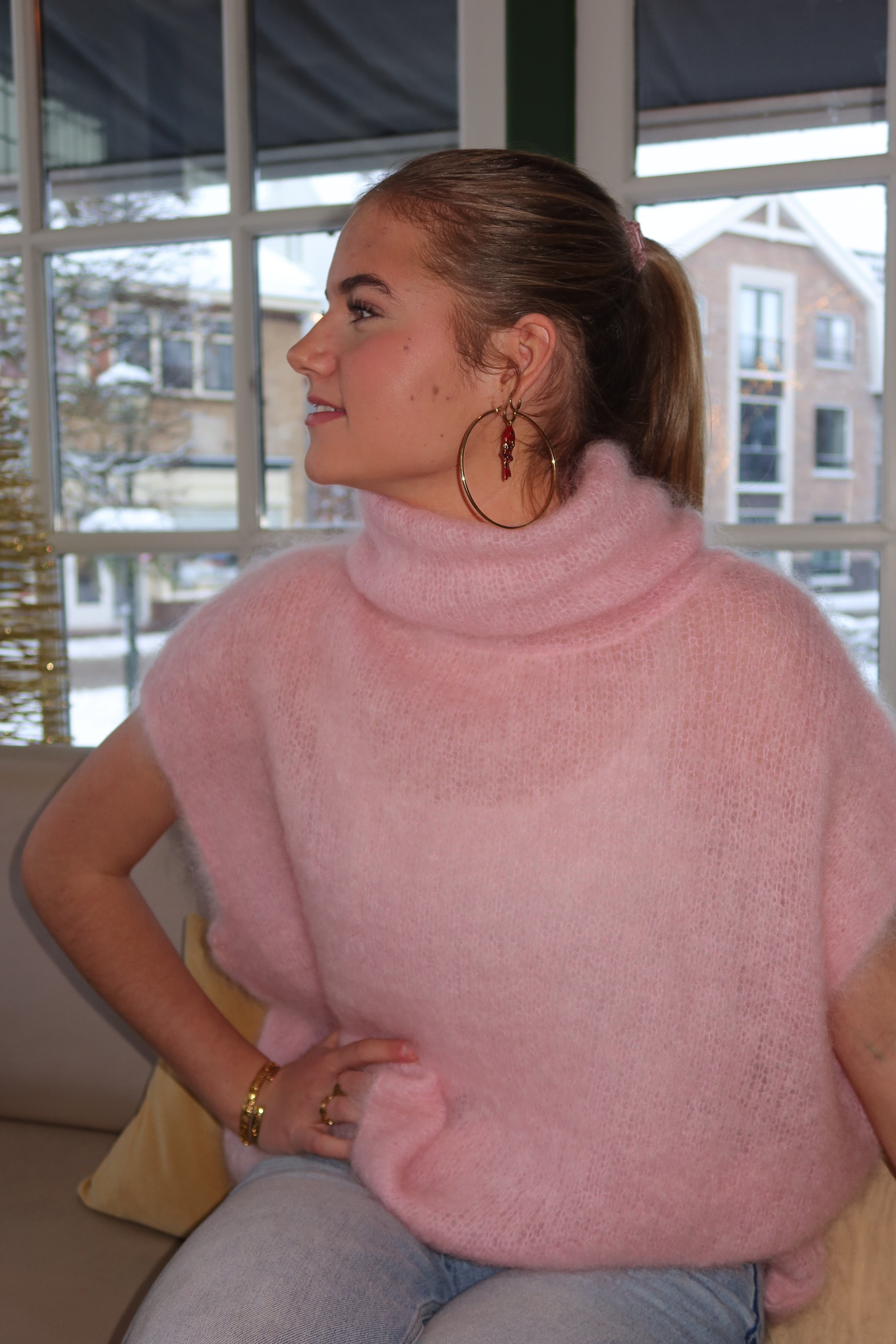 A beautifully soft pink knit poncho-style vest with a cosy high neckline and relaxed silhouette. Its fluffy texture adds warmth and a dreamy, feminine feel while keeping the look chic and effortless. Perfect for layering over blouses, dresses, or tees for an elevated everyday outfit