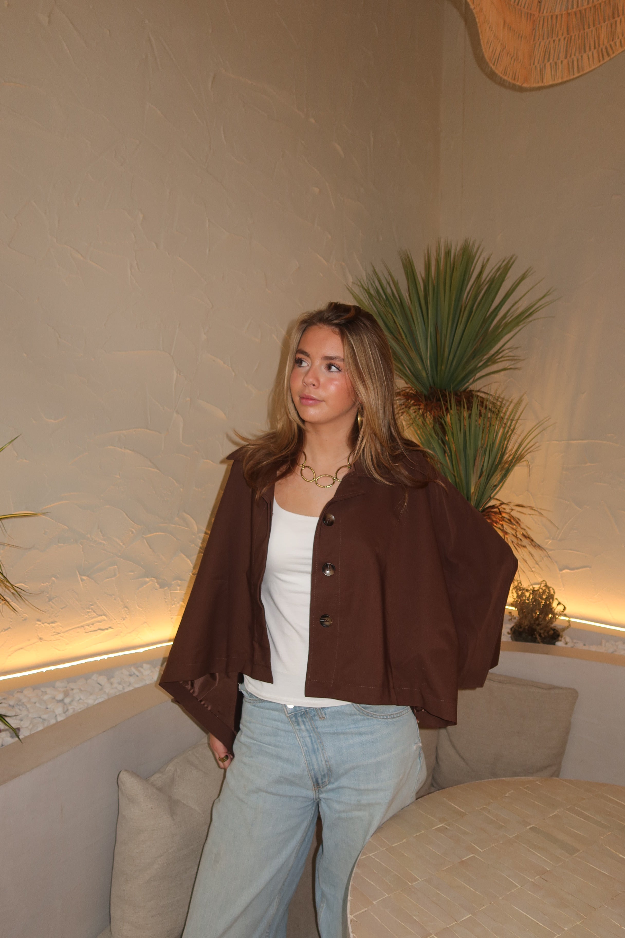 A refined brown jacket designed with a flowing, cape-inspired silhouette. The wide sleeves and relaxed fit create an elegant drape, while the structured collar adds a clean, modern finish. Lightweight and versatile, this jacket is ideal for layering and adds effortless sophistication to any outfit.