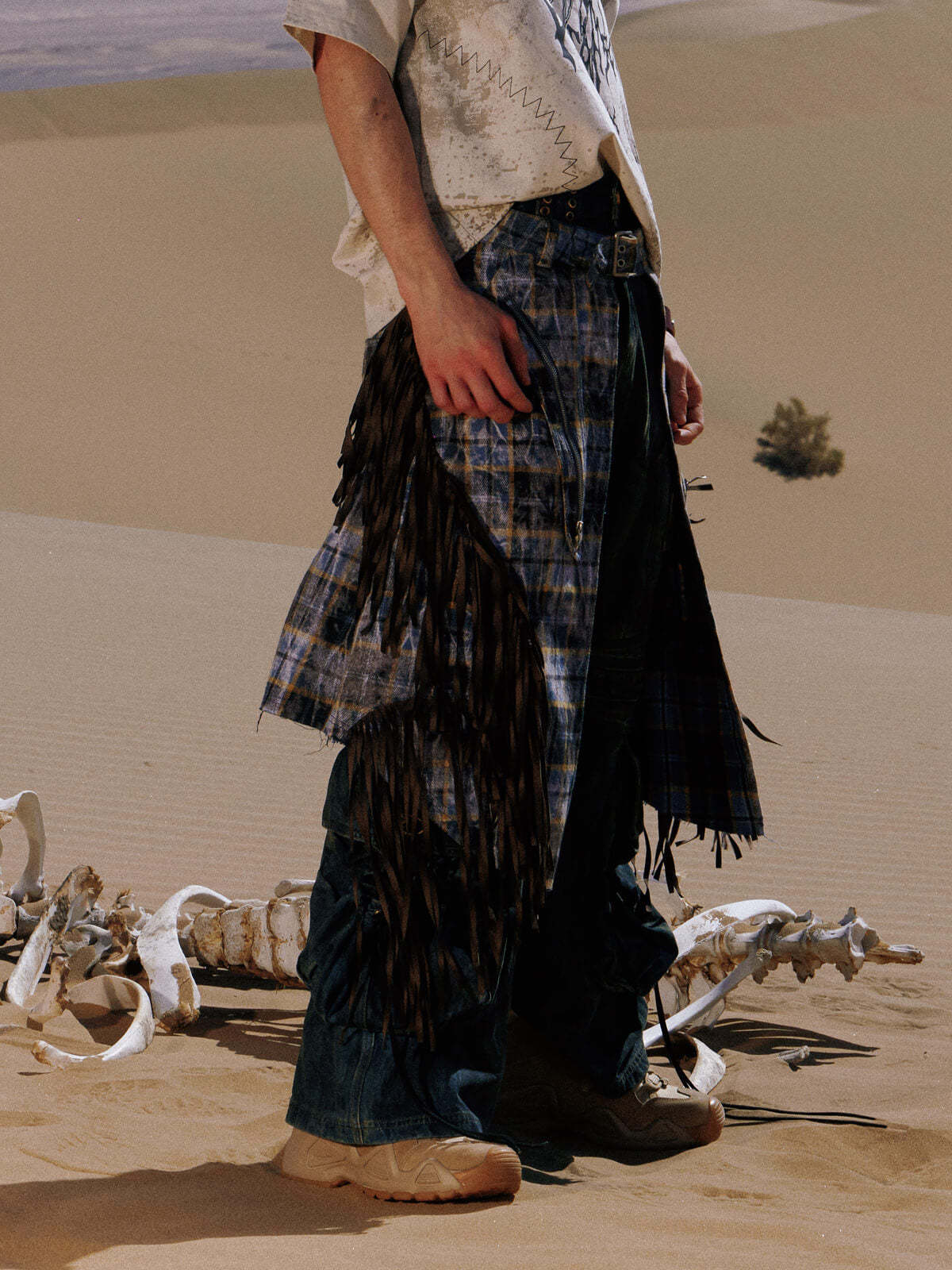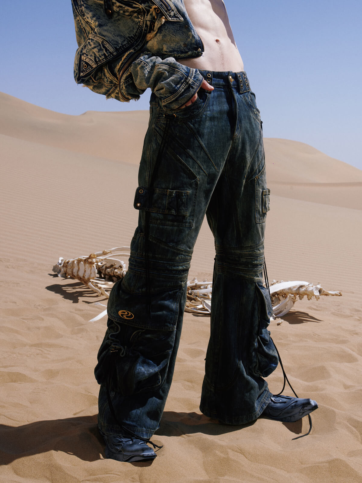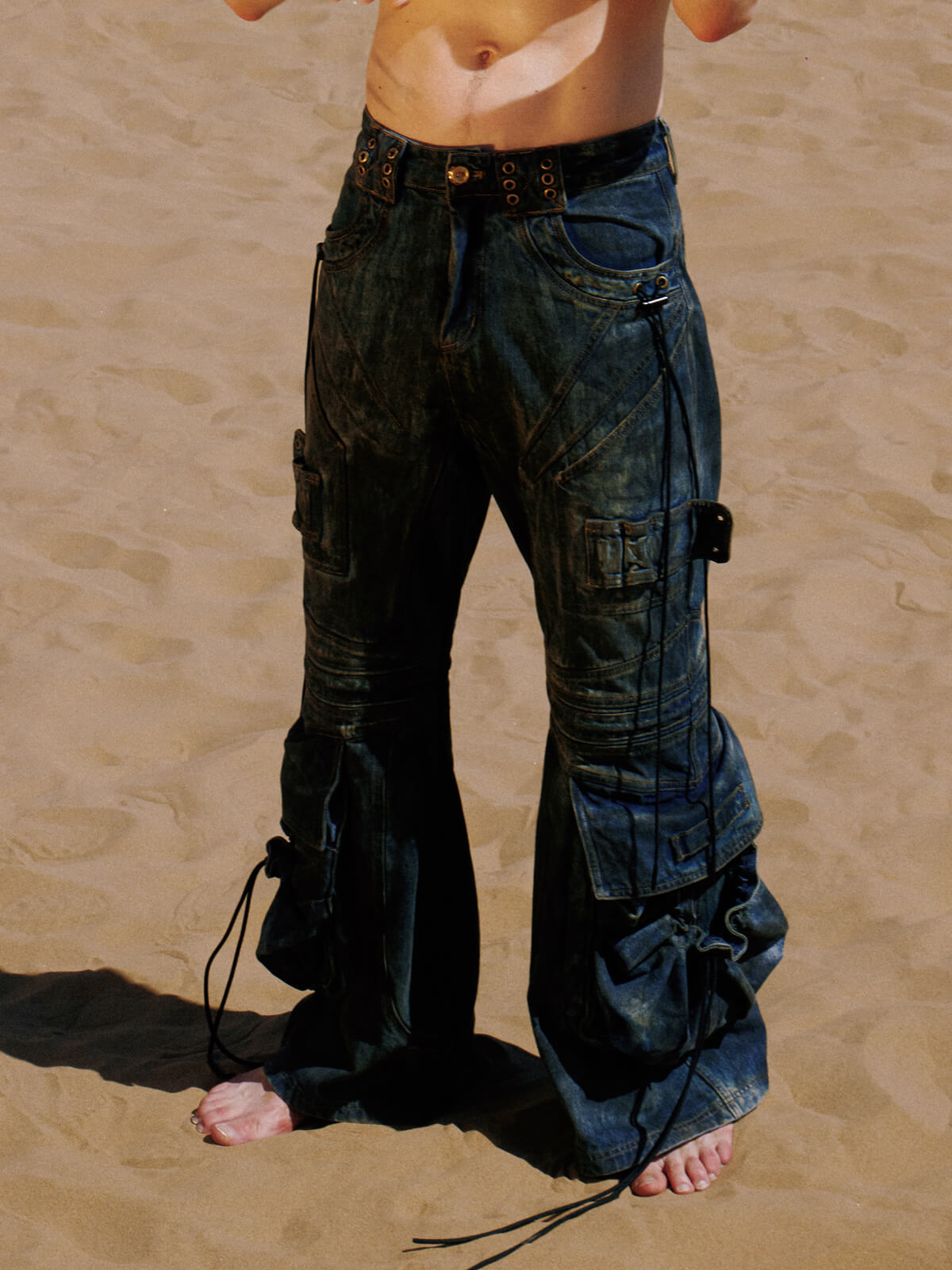 Personsoul Pocket Drawstring Washed Flared Jeans