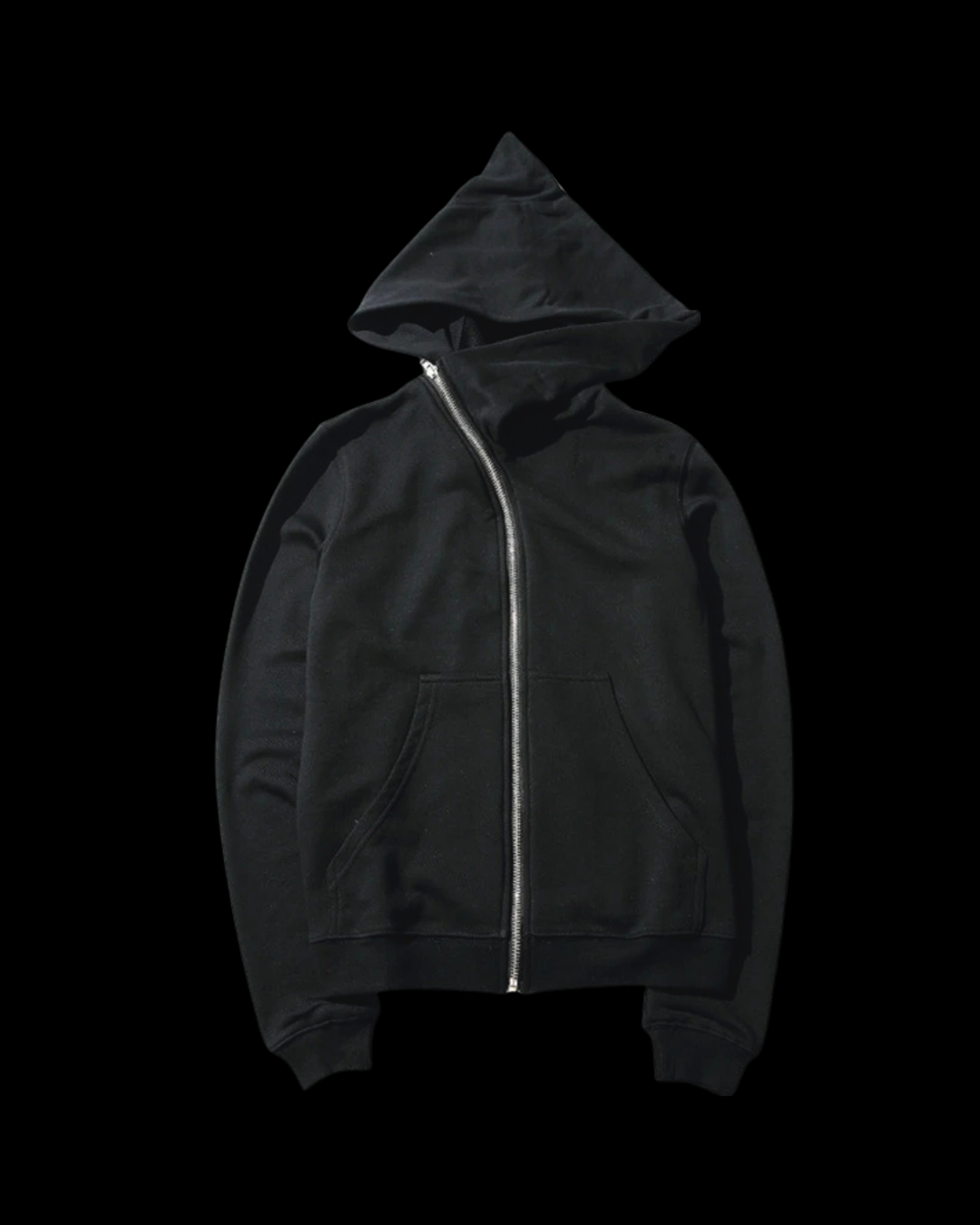 Black full-zip with a diagonal metal zipper and a deep, structured hood that shields the profile. Clean front with twin hand pockets, ribbed cuffs and hem, and a streamlined fit built for low-key layering. Cotton blend, true to size, and ready to ship.