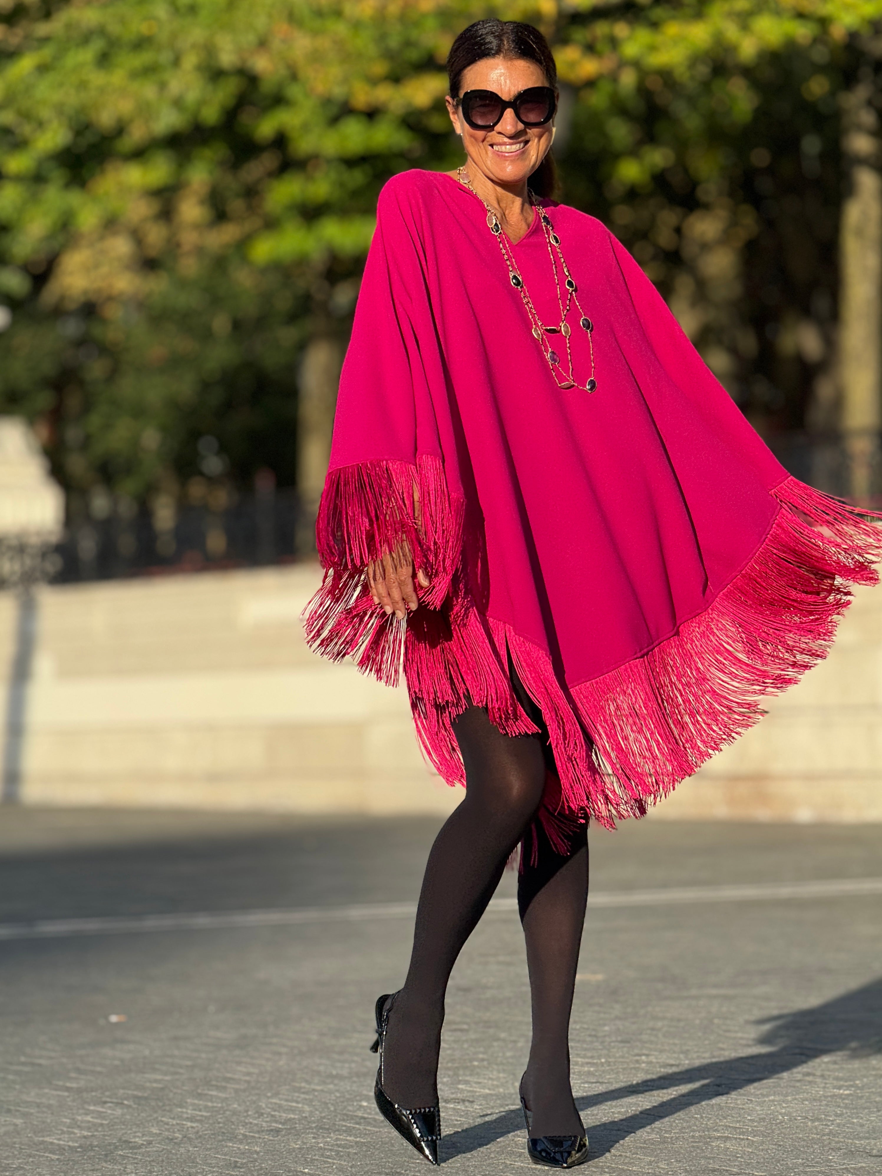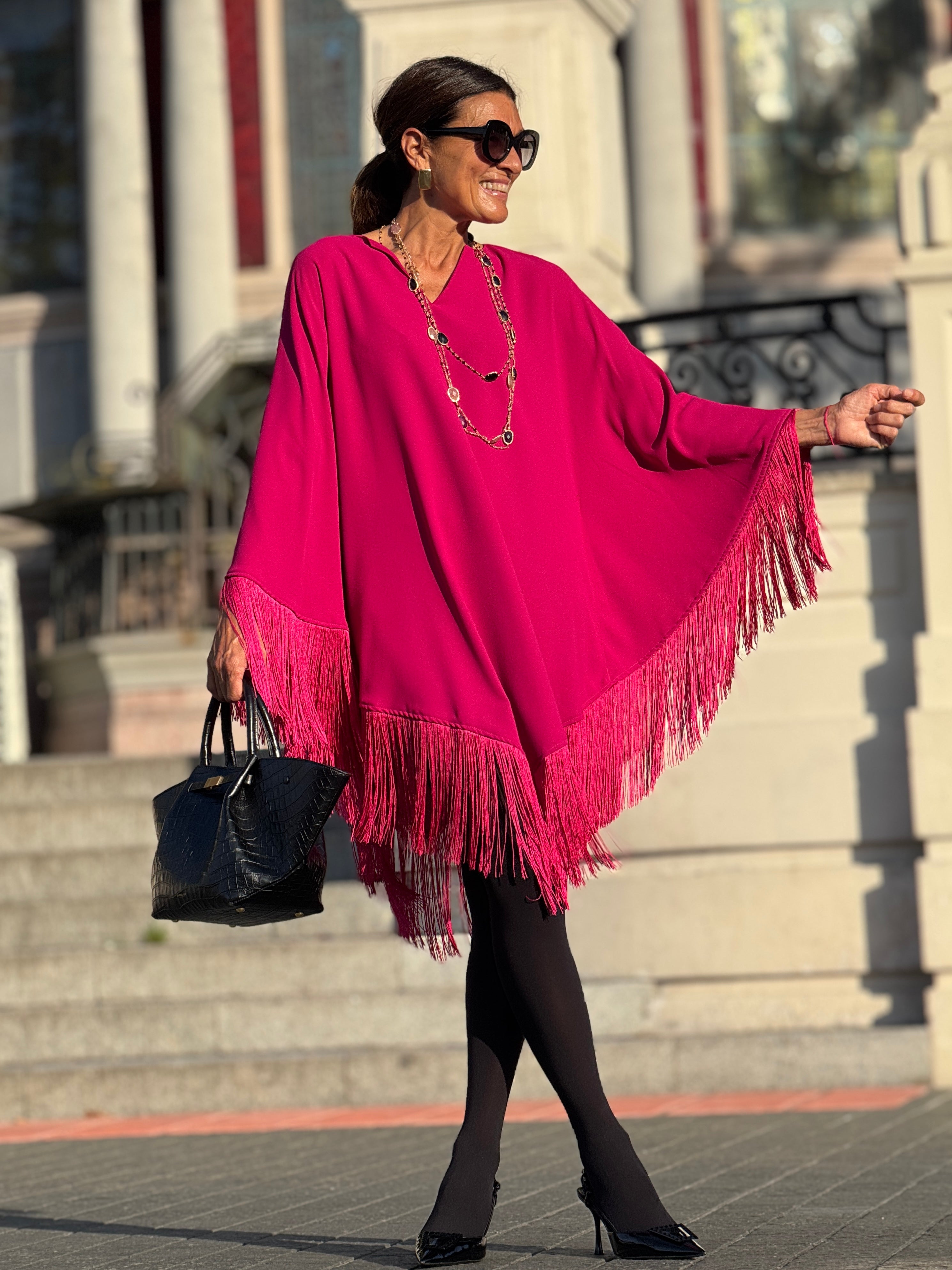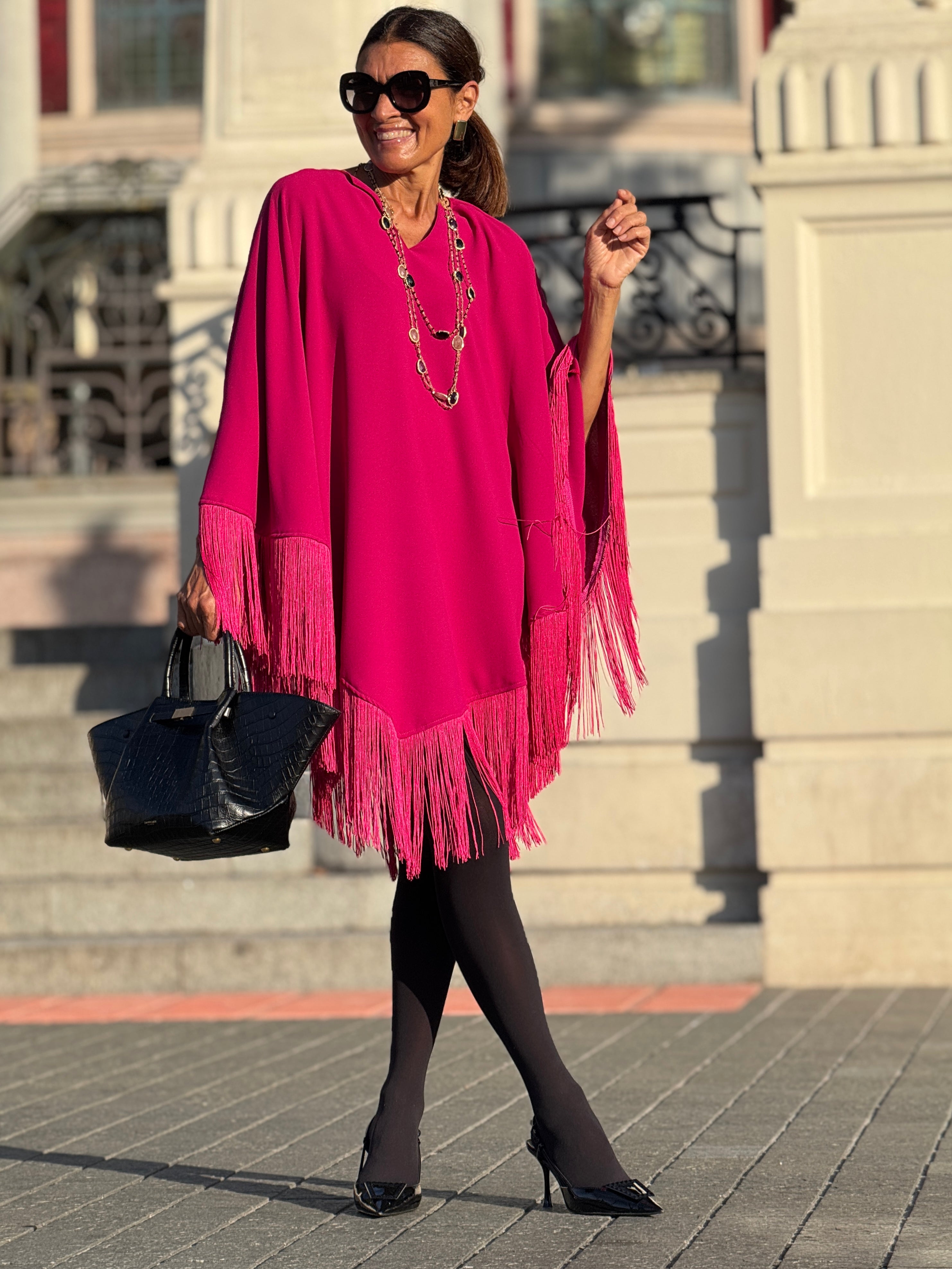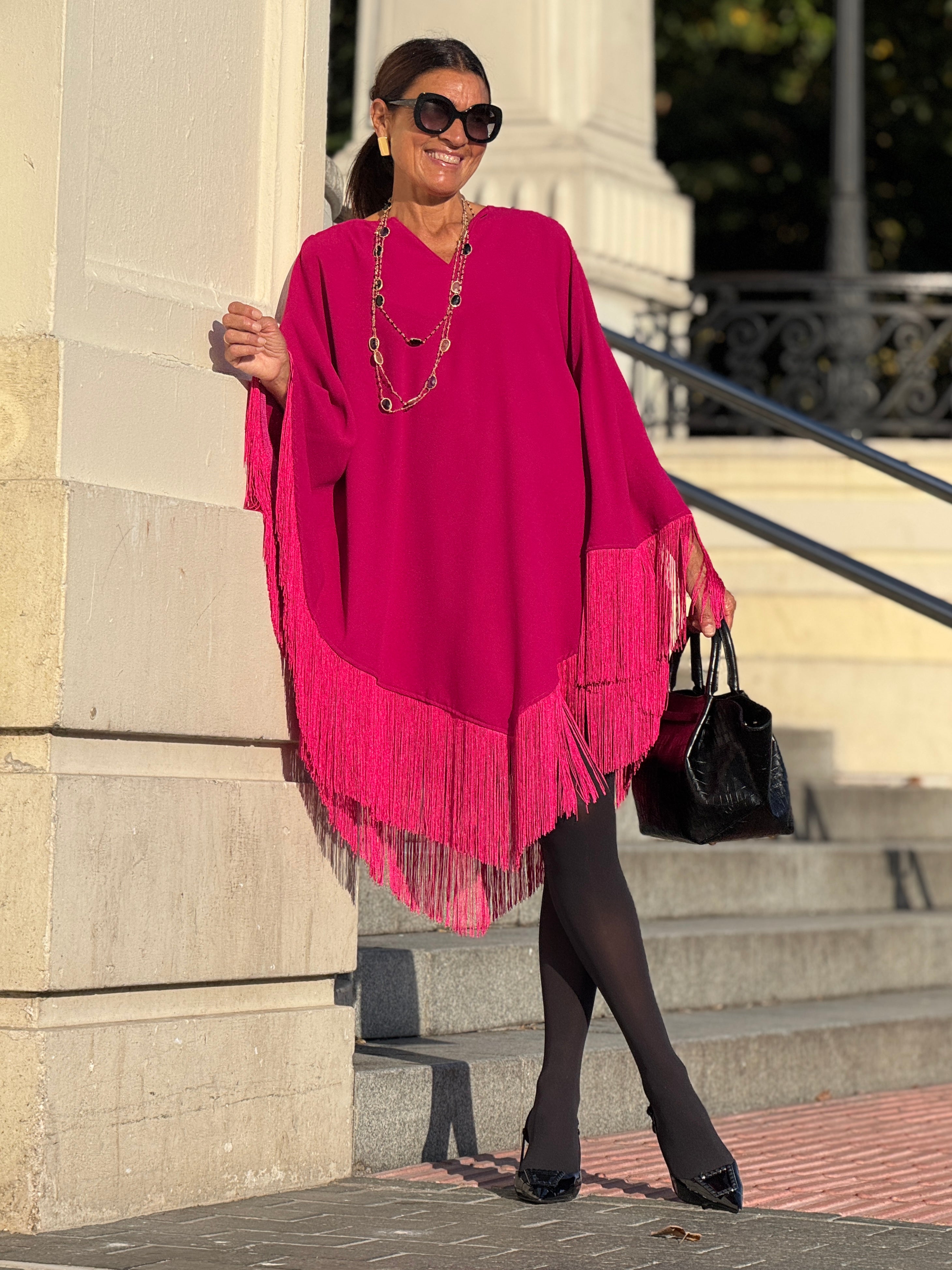 Elevate your wardrobe with the Dress Nina Fringe Pink, a refined piece that combines elegant design with a graceful look. With a one-size-fits-all design, this dress is suitable for a range of sizes from 34 to 42 in the German size system (see: tab sizes). Measuring a length of 94 cm / 37 inches (fringes are 20 cm / 12 inches).