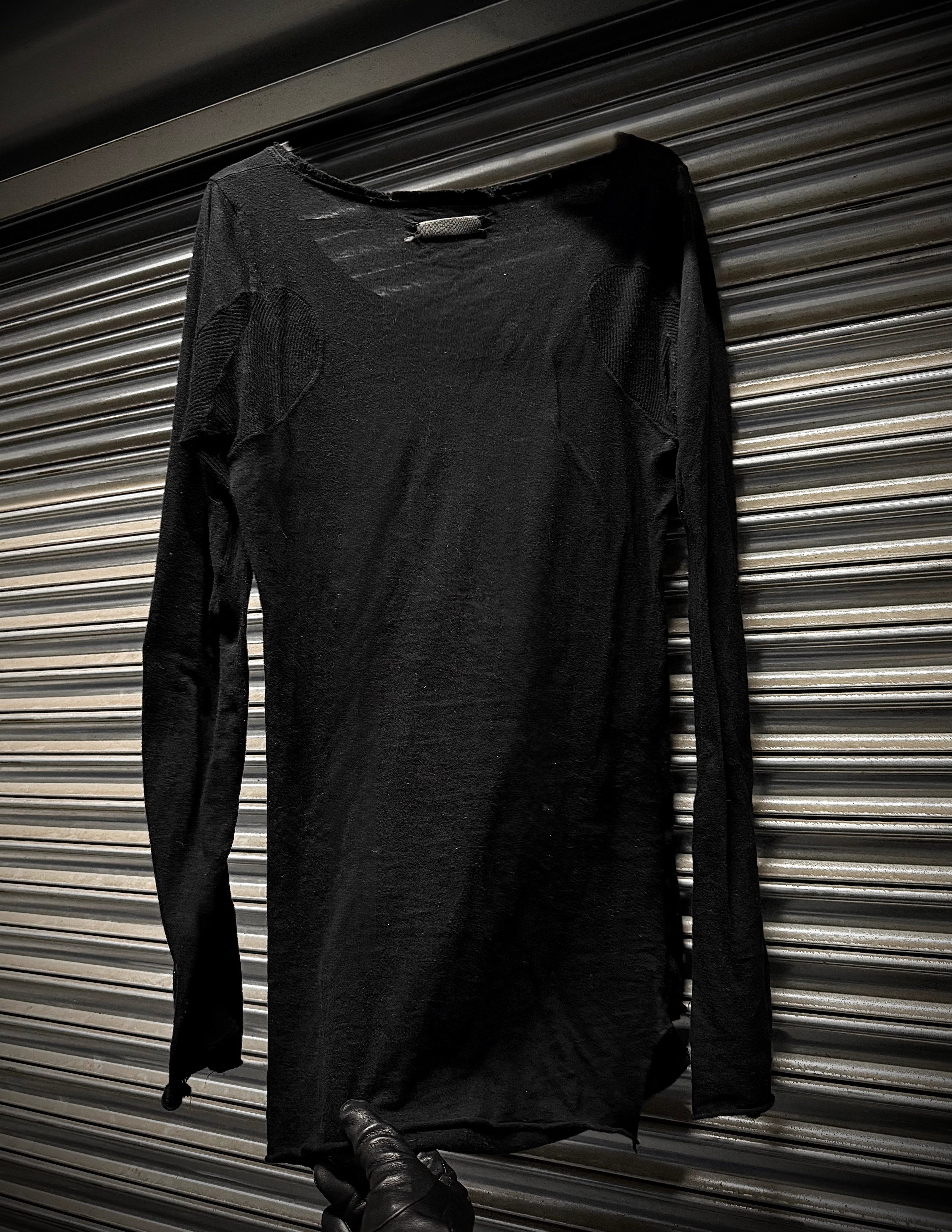 Holes found on both underarms & ribbing, holes by leather brand tag, general wear throughout