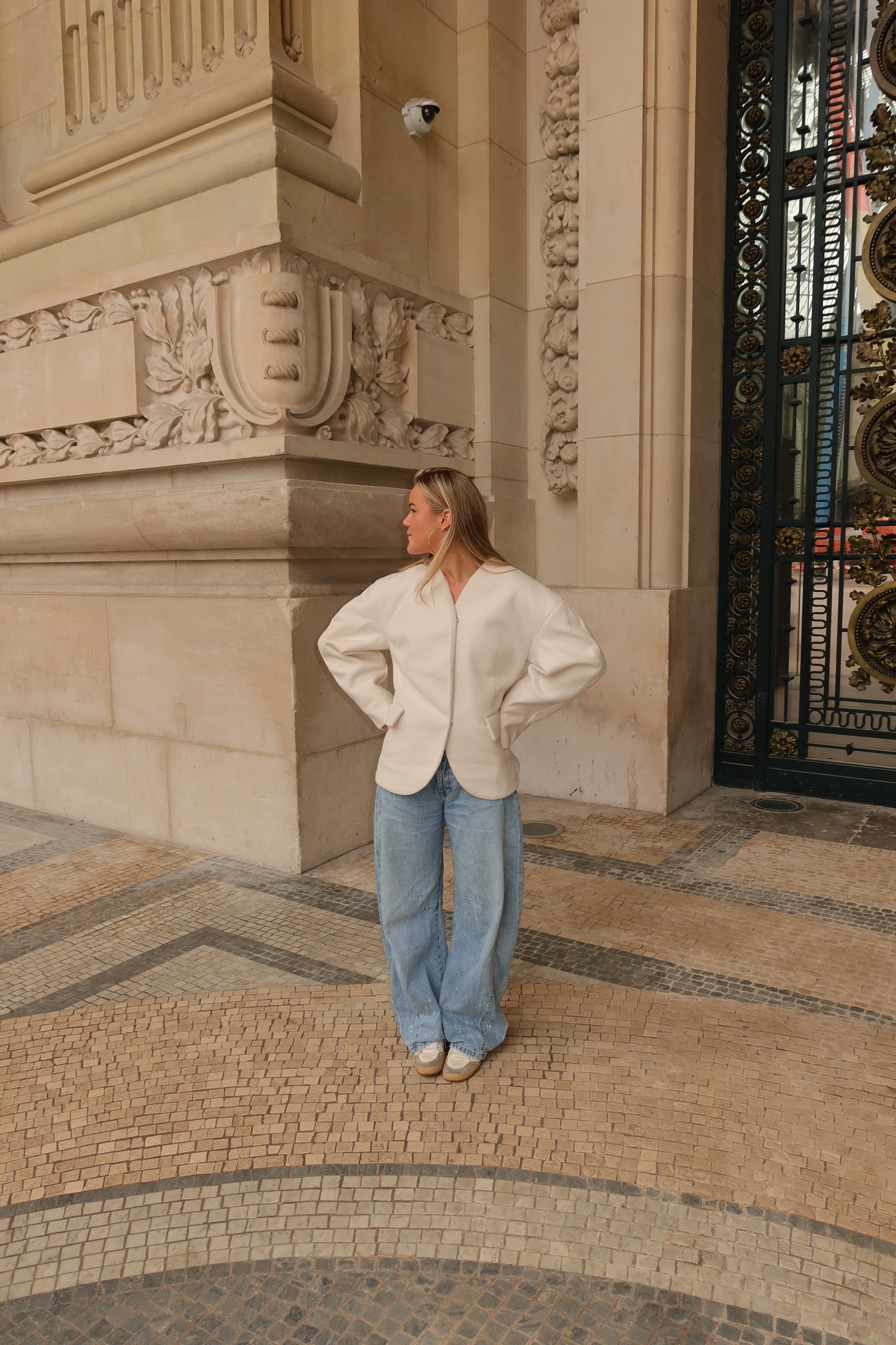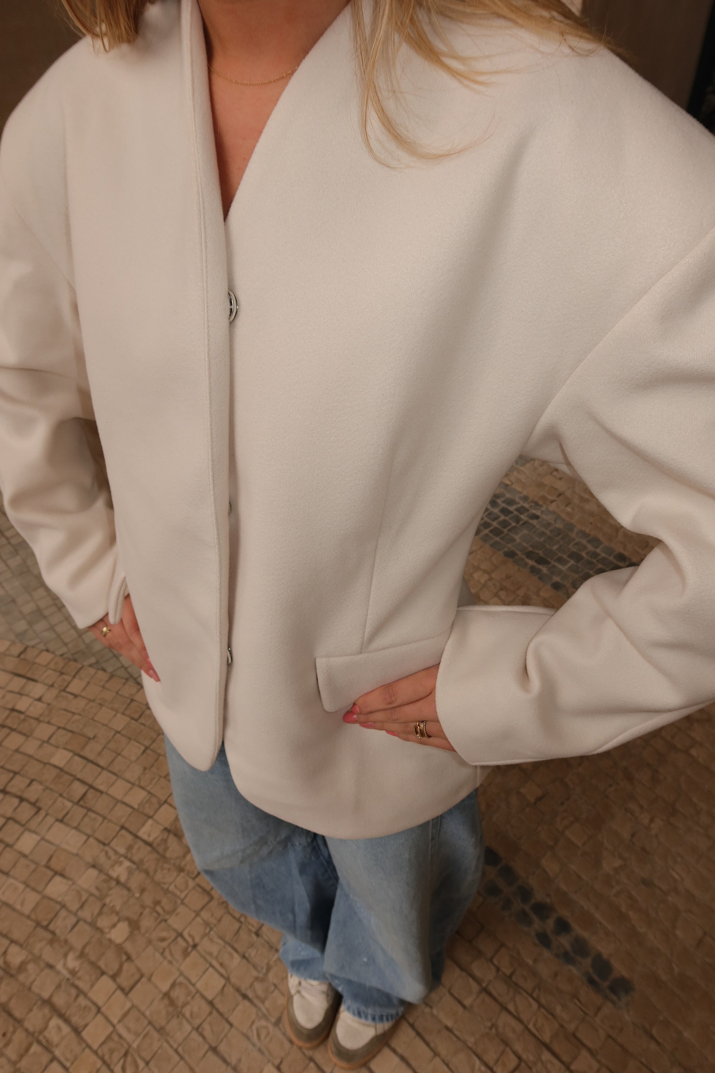 A modern take on classic tailoring. This cream jacket features a clean collarless neckline, sculpted seams, and a softly structured silhouette that flatters the waist while keeping a relaxed feel. Finished with discreet front closures and minimal detailing for an effortlessly polished look from day to night.