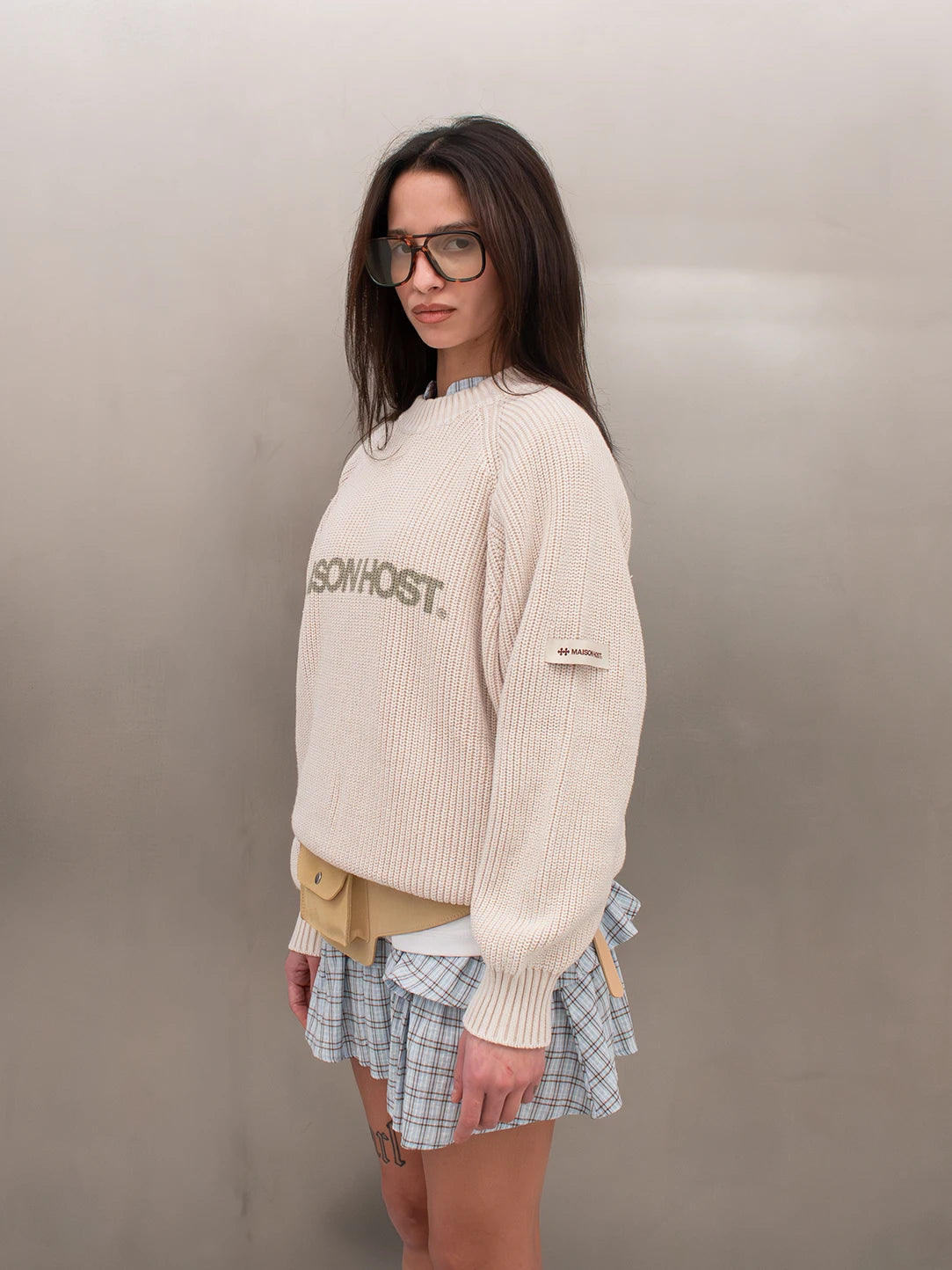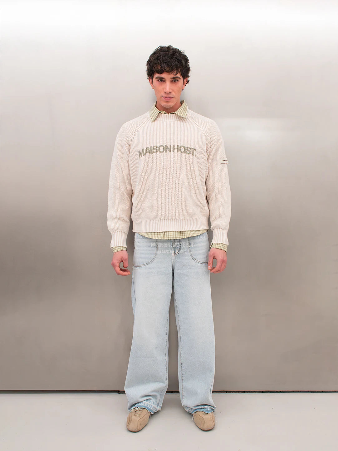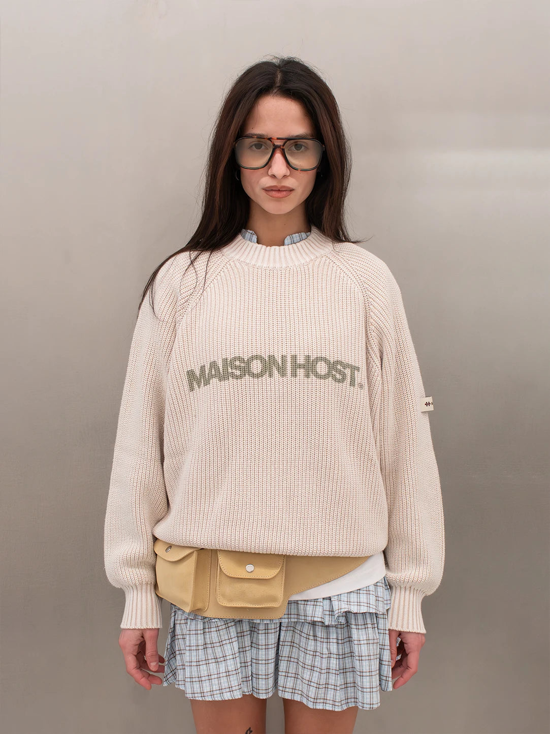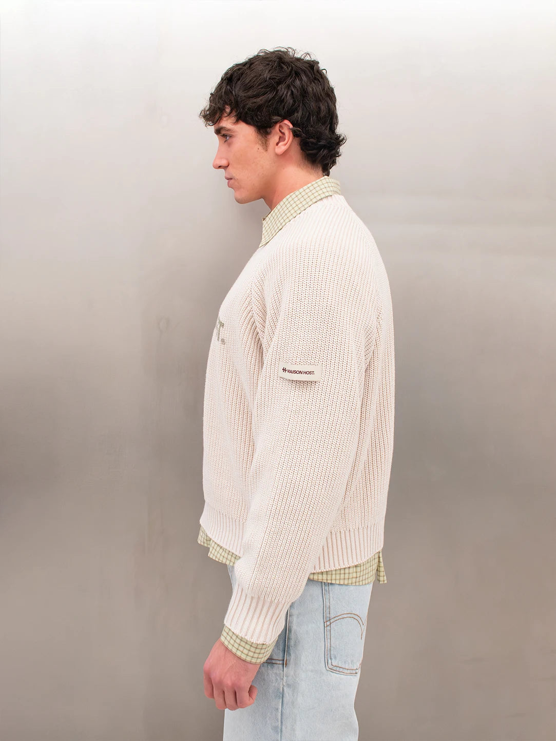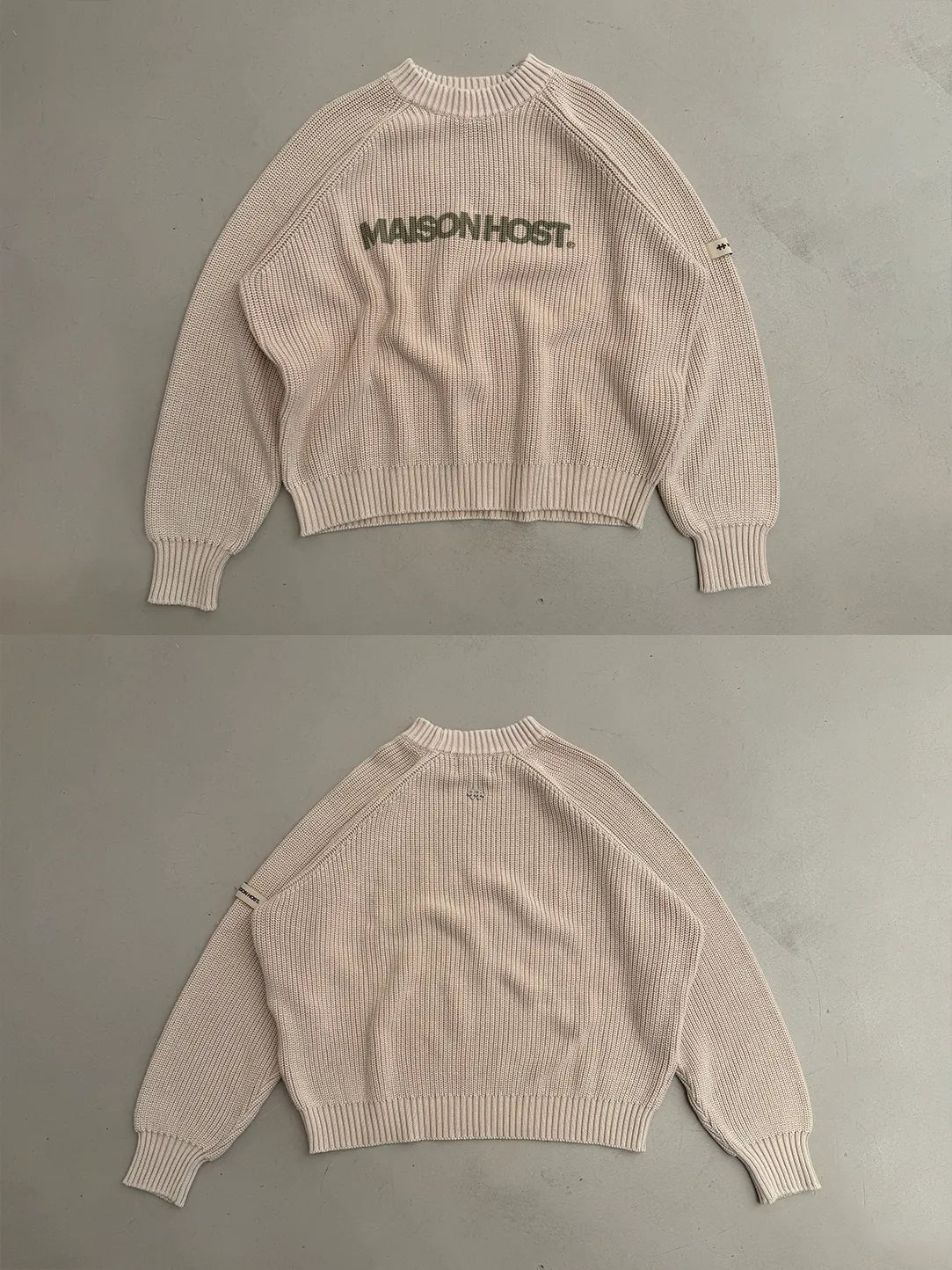 Features a front MAISONHOST print, a fabric patch on the left sleeve, and a metal logo on the back. Crafted in heavyweight knit for a clean and structured finish.