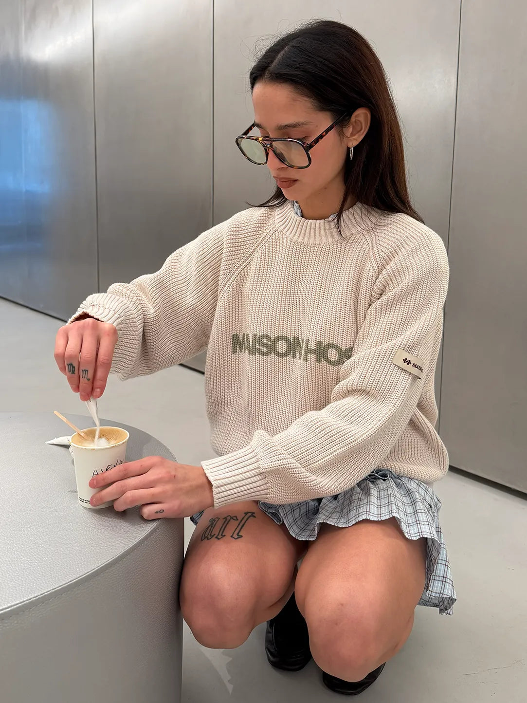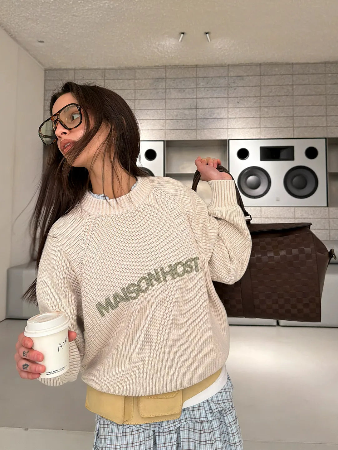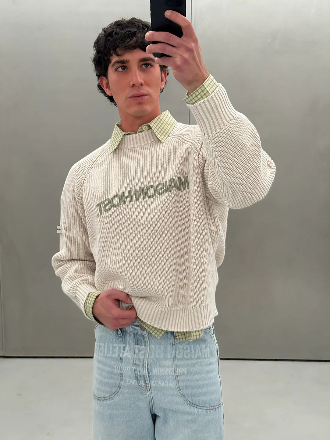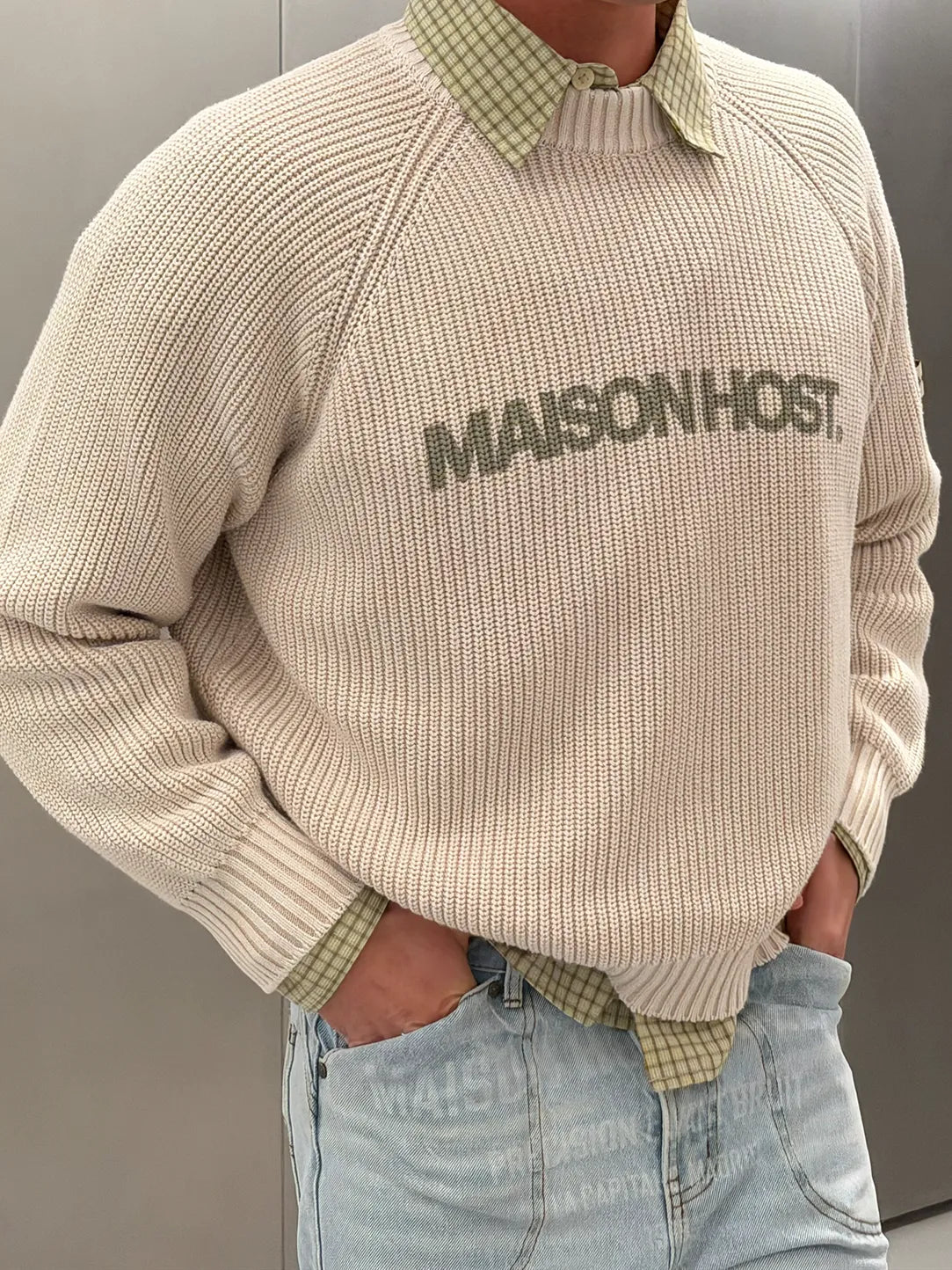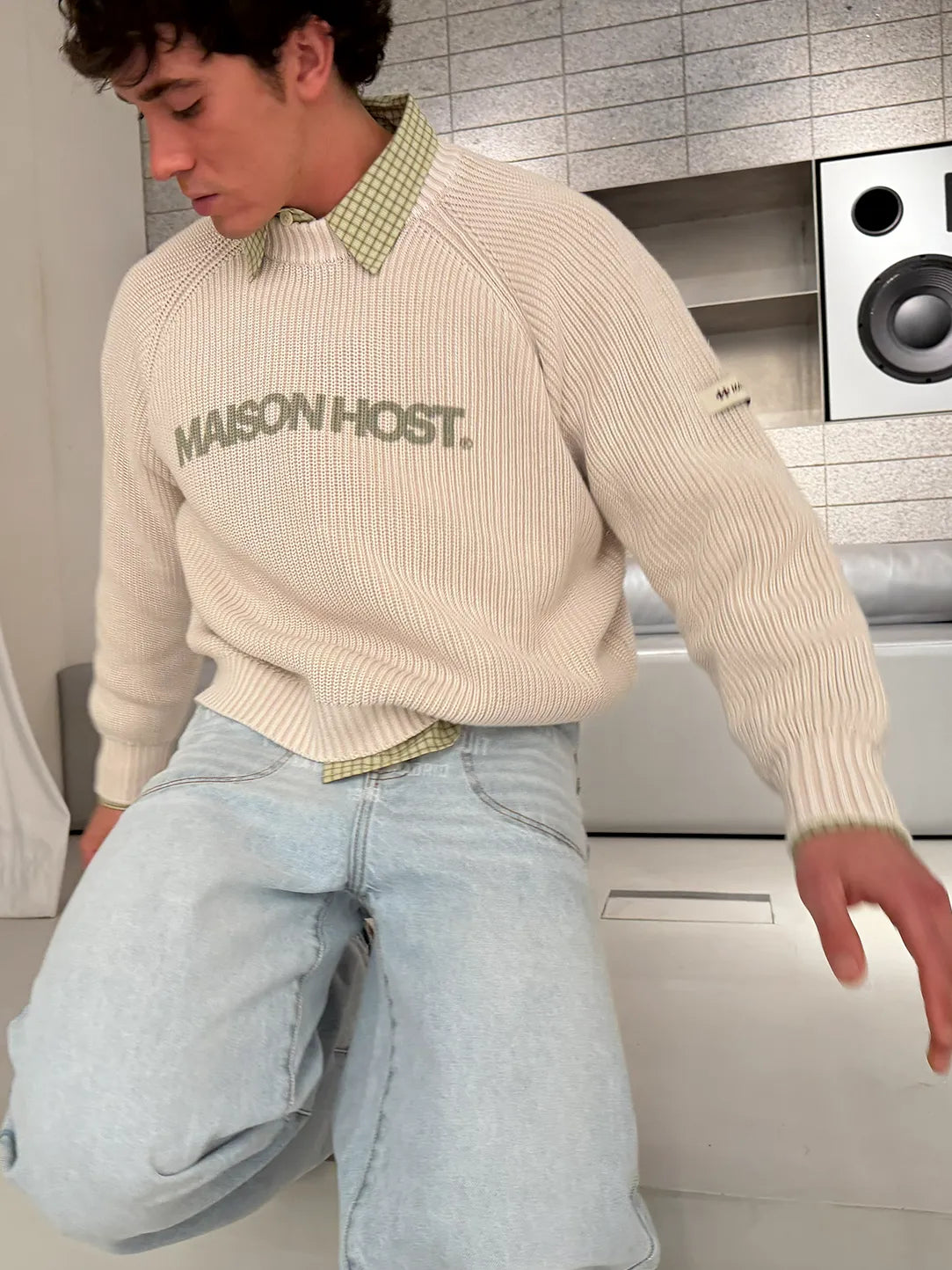 Features a front MAISONHOST print, a fabric patch on the left sleeve, and a metal logo on the back. Crafted in heavyweight knit for a clean and structured finish.