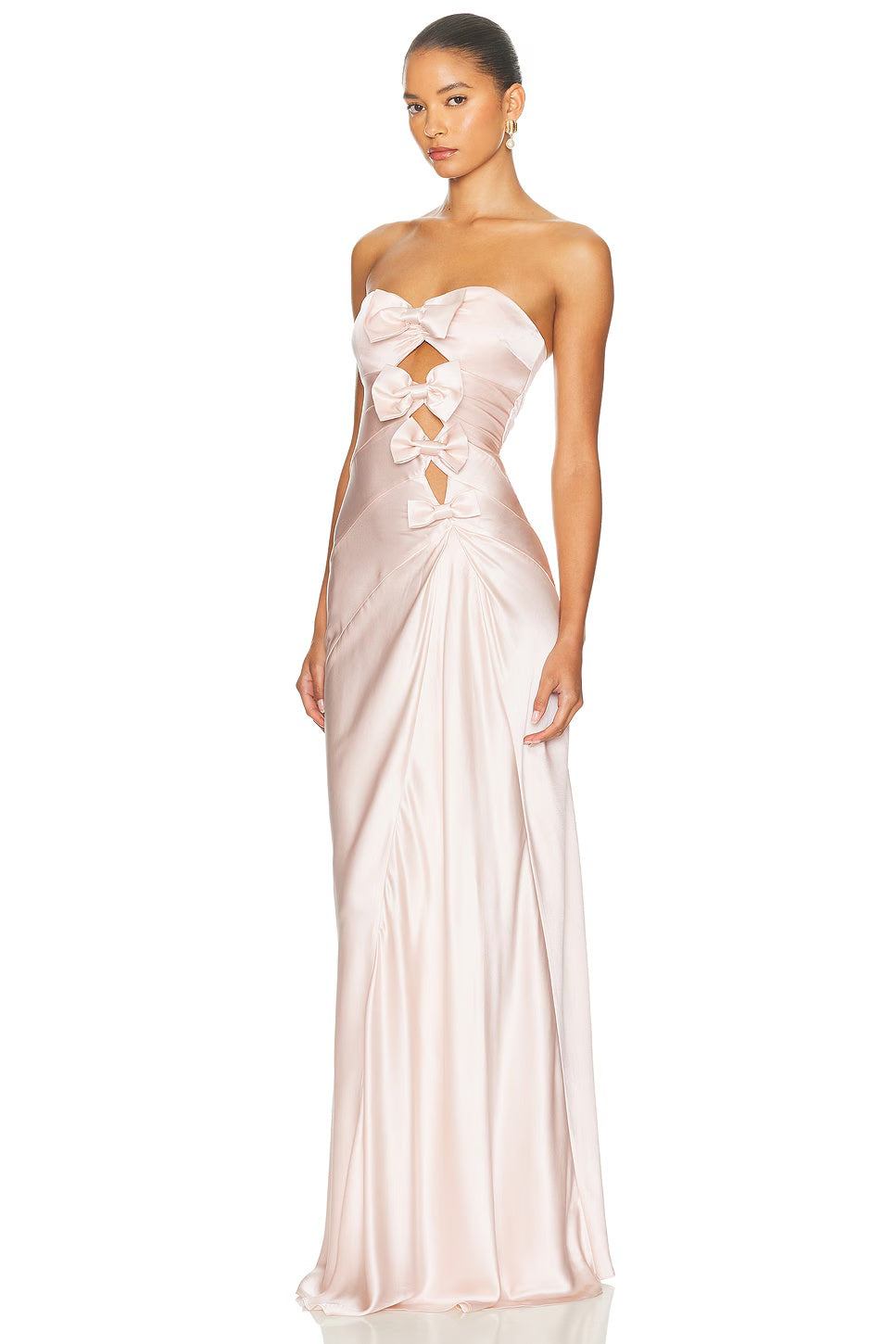 - Dry clean recommended- Unlined- Hidden back zipper closure- Front cut-out detail with bow details- Ruched satin fabric