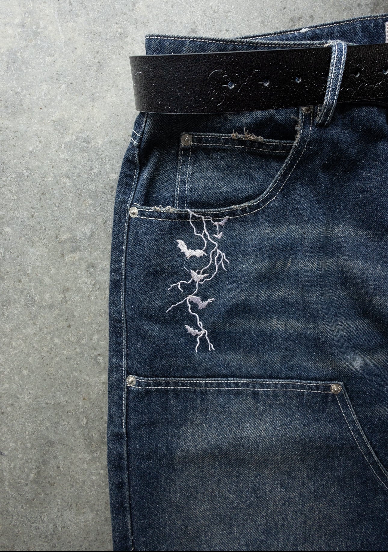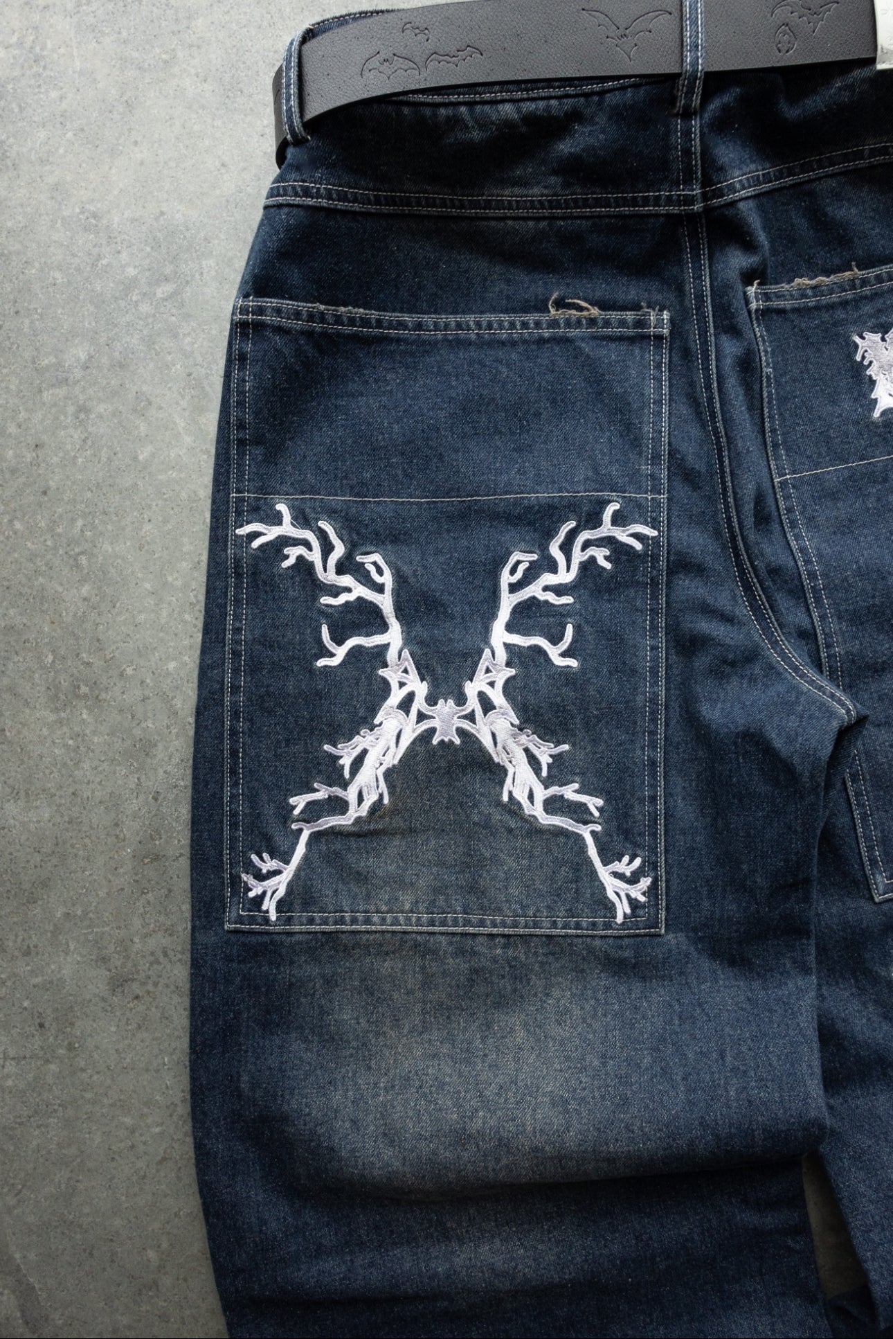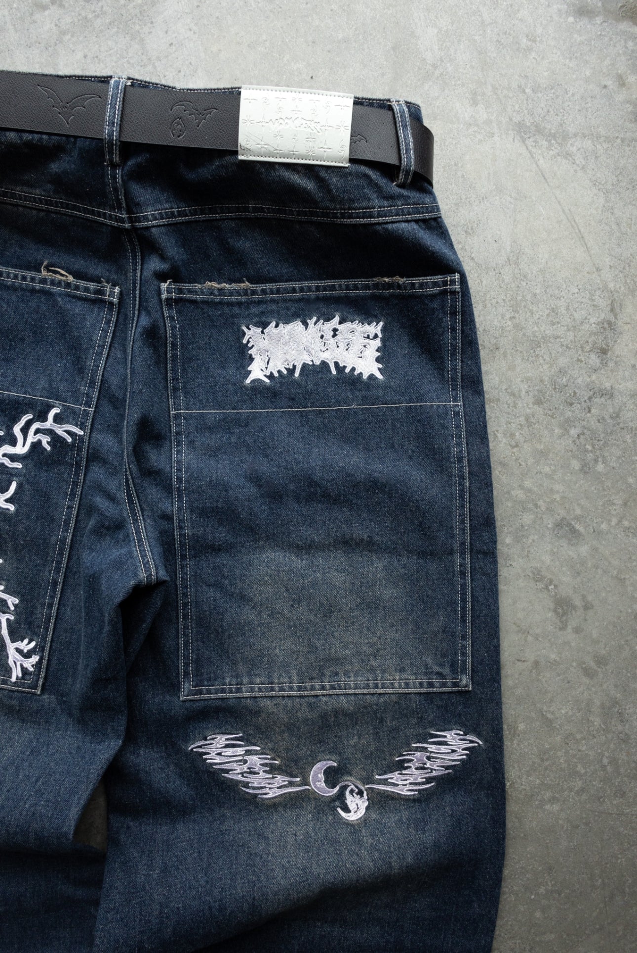 -Navy Sand Wash denim with white sticthes and embroidery